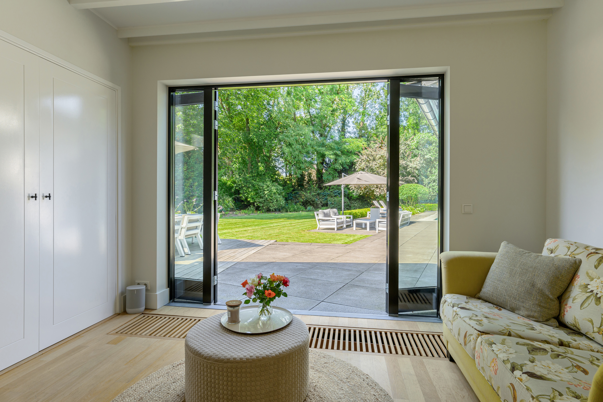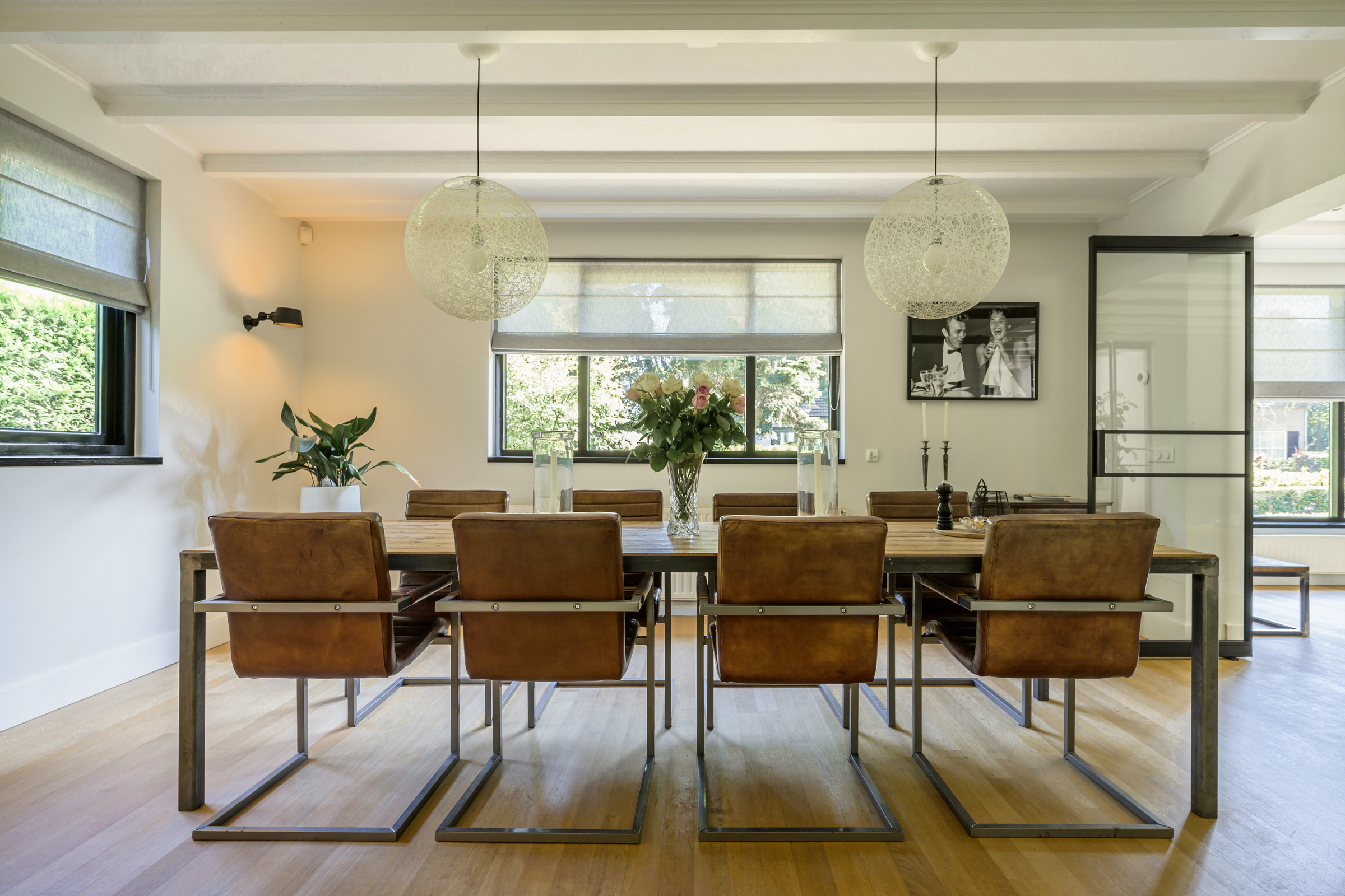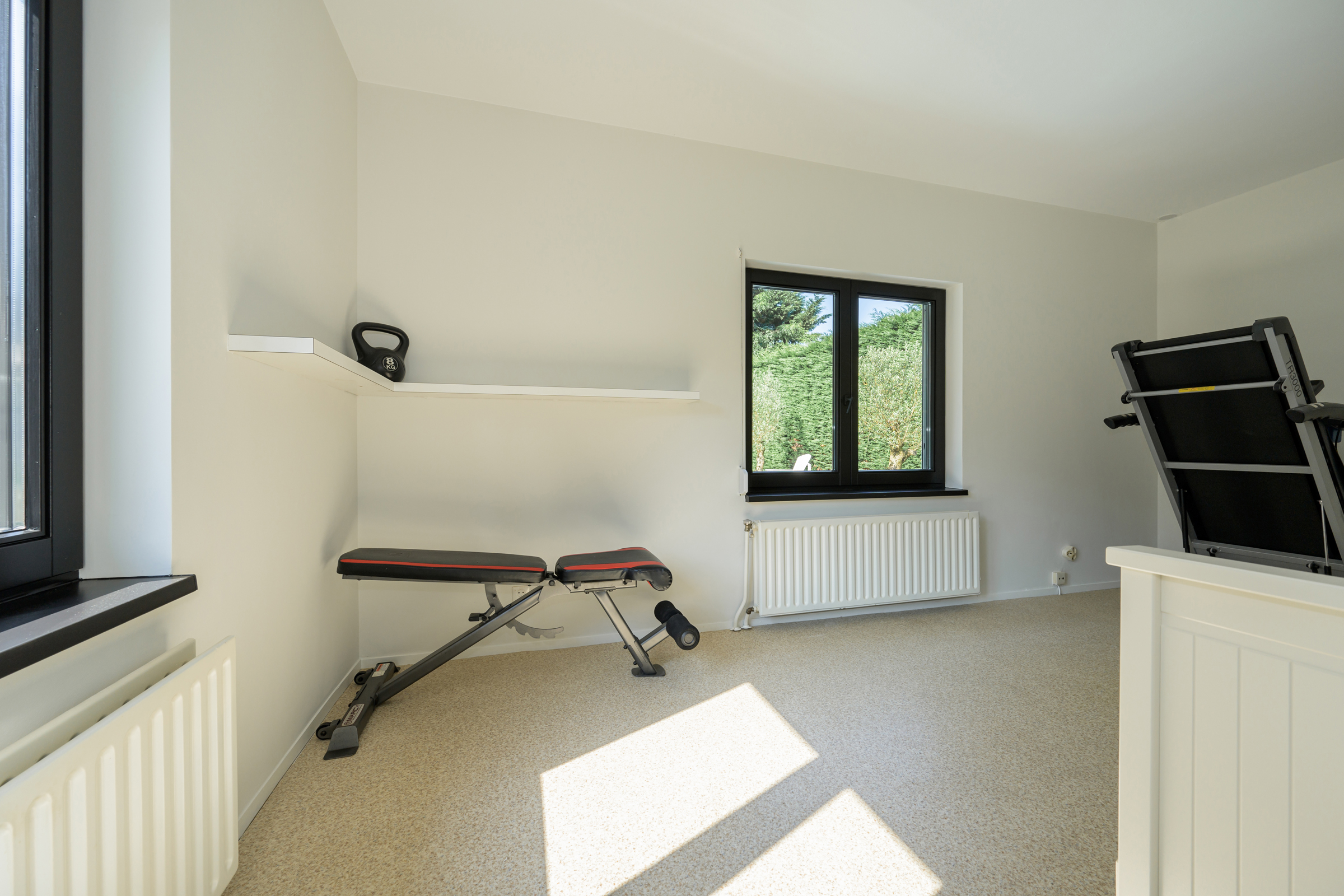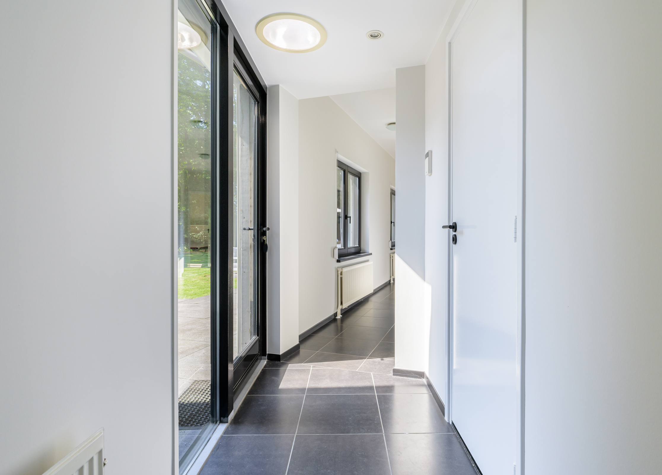 La maison conjugue durabilité et pragmatisme grâce à l’isolation des sols et plafonds, au vitrage HR++, à 18 panneaux solaires et à un chauffage moderne, offrant ainsi un environnement efficace et serein. De grandes dalles en ardoise, du parquet et des sols en bois massif soulignent le caractère feutré de l’ensemble, tandis que les plafonds à poutres apparentes et l’éclairage intégré instaurent une atmosphère rythmée. Les espaces de vie s’ouvrent depuis un salon avec cheminée, traversant des portes vitrées vers le jardin, et communiquent harmonieusement avec une salle à manger séparée et une cuisine entièrement équipée avec buanderie.