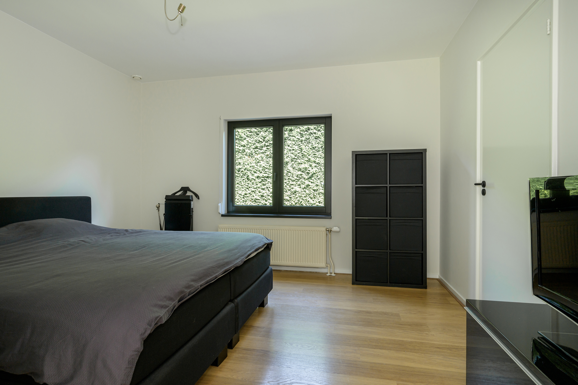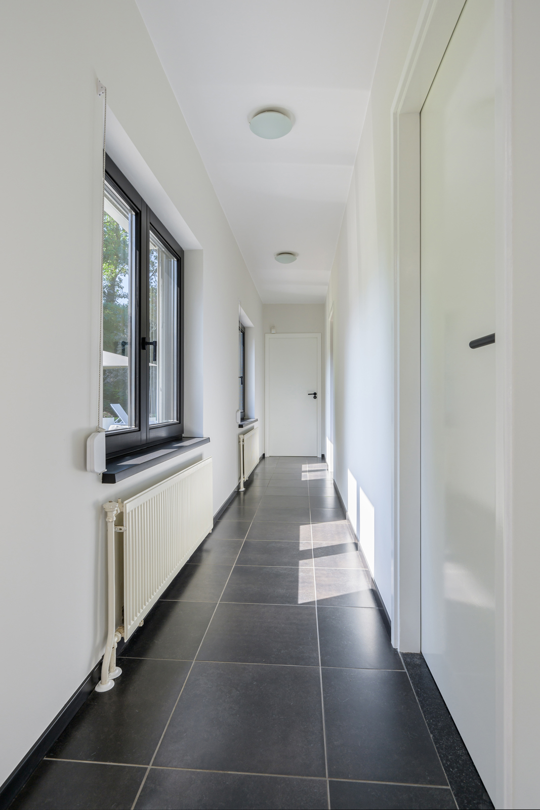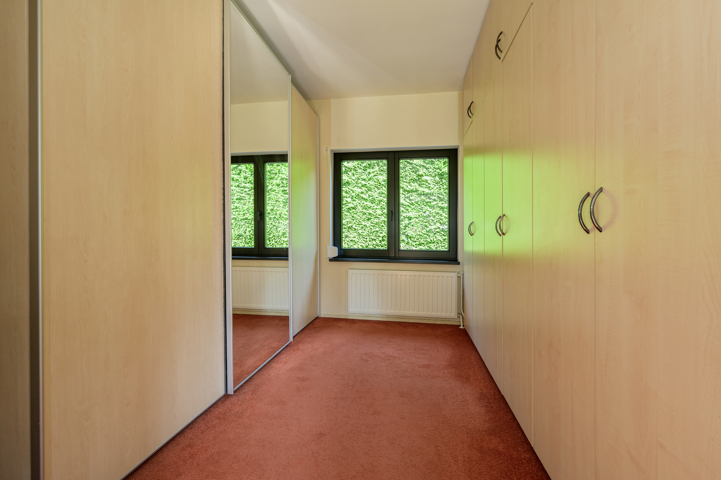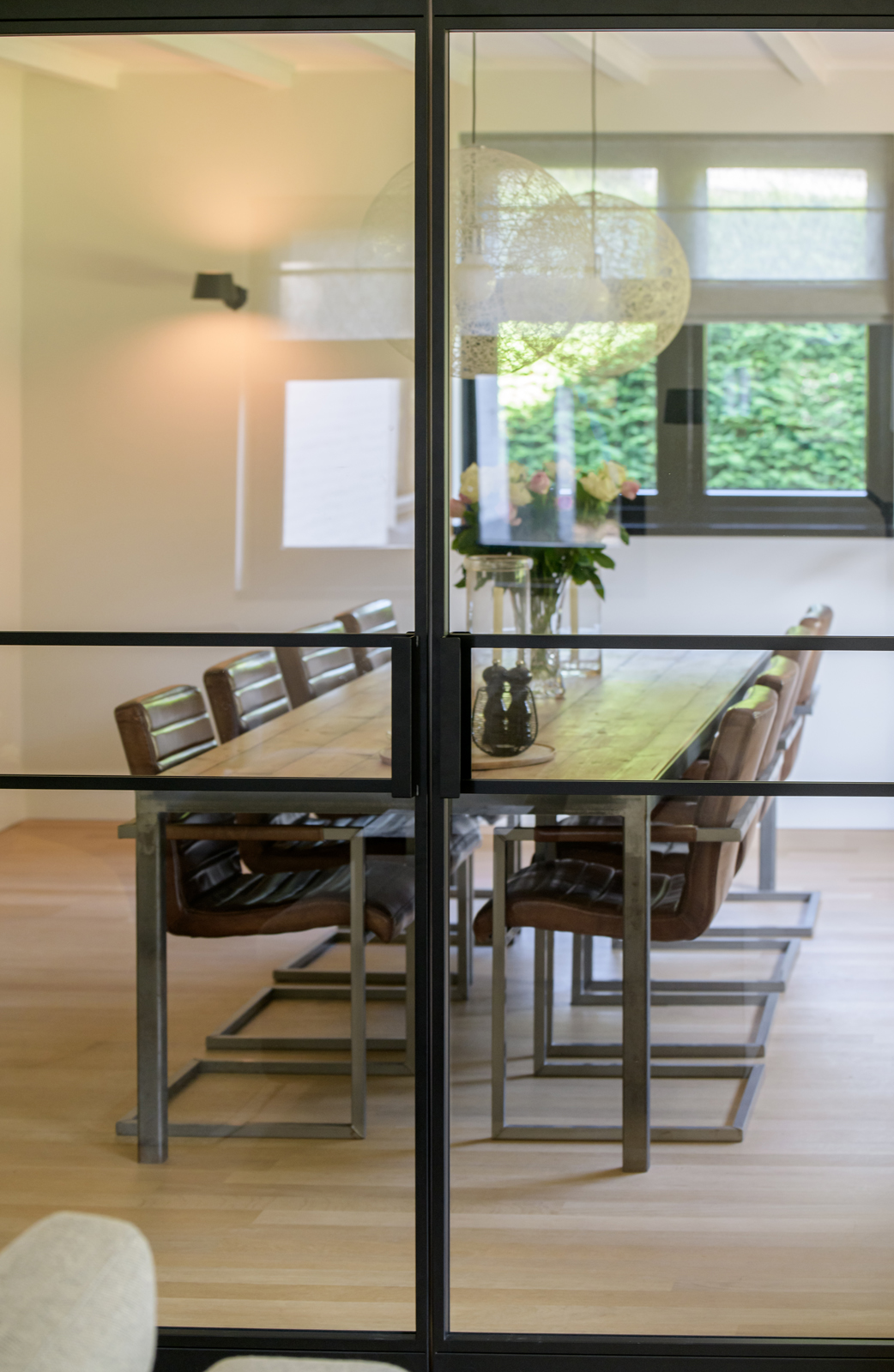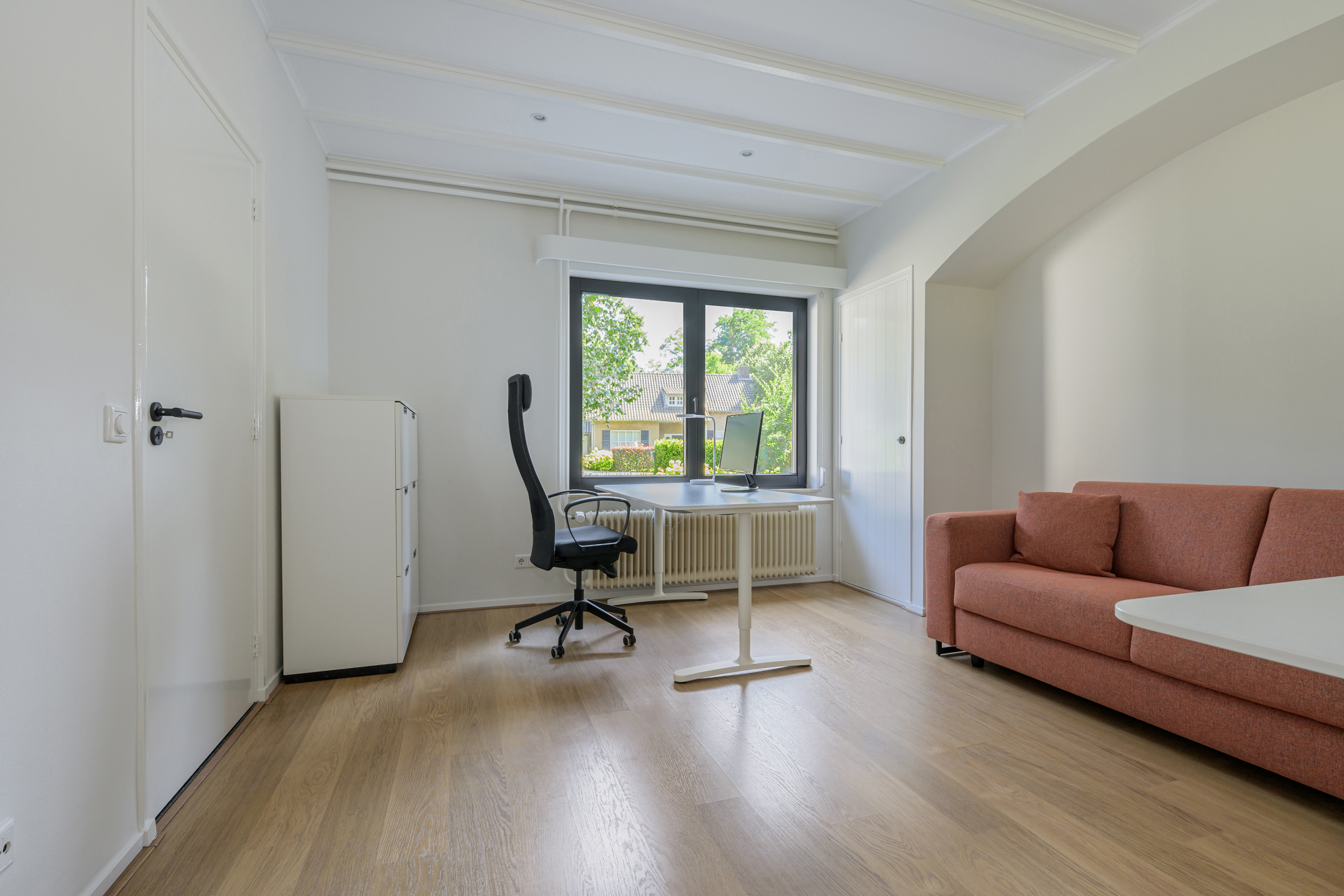 La maison conjugue durabilité et pragmatisme grâce à l’isolation des sols et plafonds, au vitrage HR++, à 18 panneaux solaires et à un chauffage moderne, offrant ainsi un environnement efficace et serein. De grandes dalles en ardoise, du parquet et des sols en bois massif soulignent le caractère feutré de l’ensemble, tandis que les plafonds à poutres apparentes et l’éclairage intégré instaurent une atmosphère rythmée. Les espaces de vie s’ouvrent depuis un salon avec cheminée, traversant des portes vitrées vers le jardin, et communiquent harmonieusement avec une salle à manger séparée et une cuisine entièrement équipée avec buanderie.