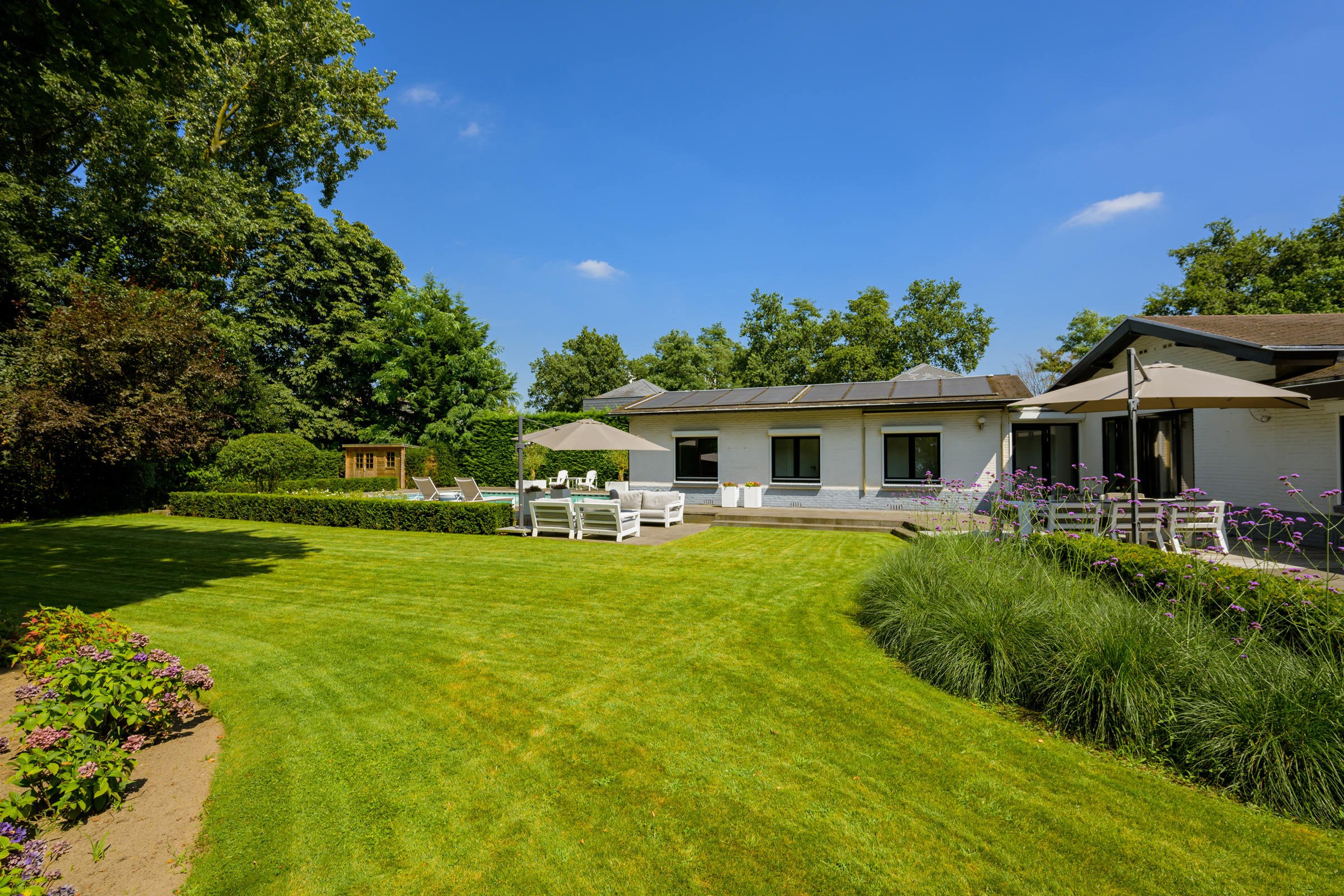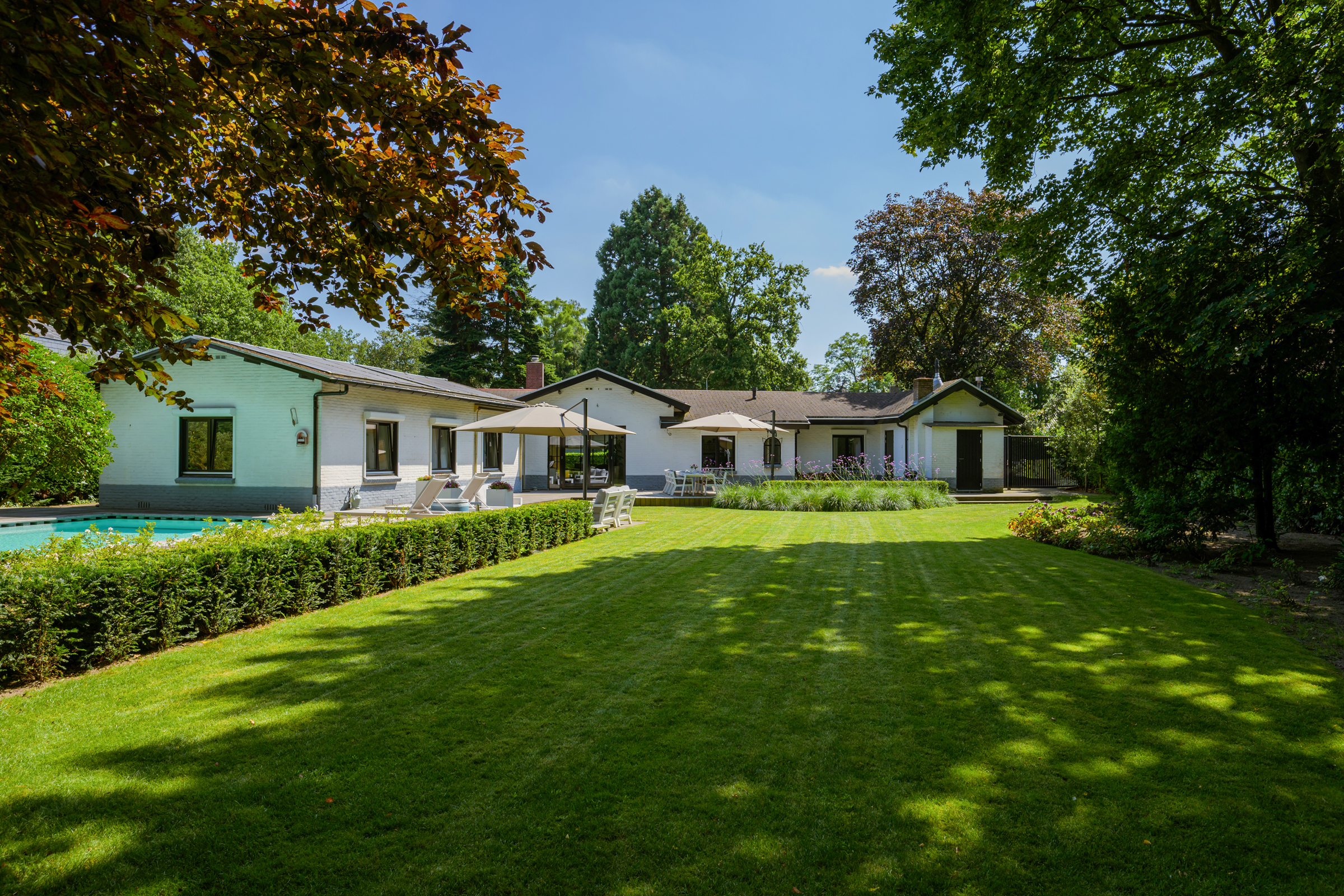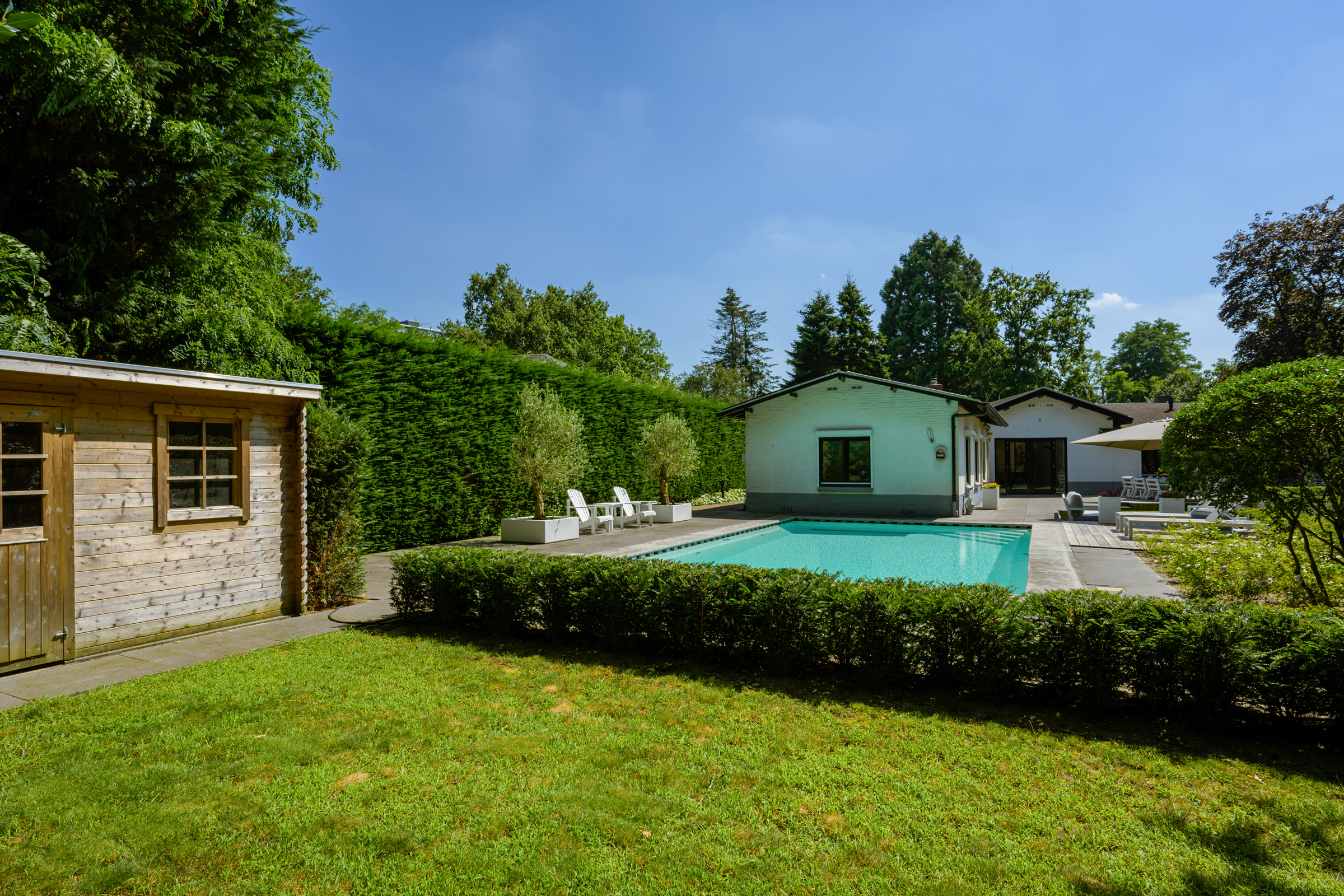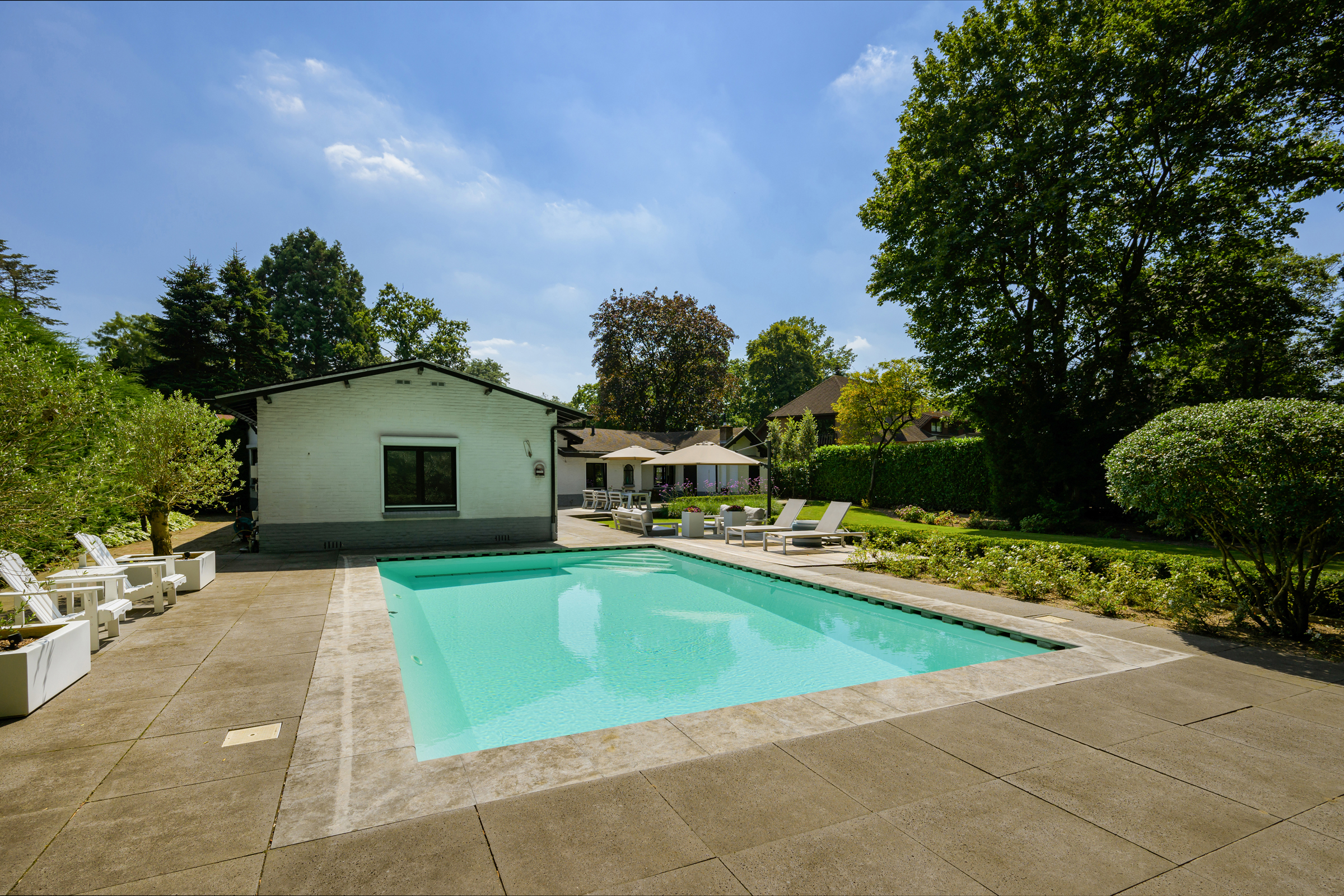 Le vaste jardin paysager, véritable havre privé, dispose de larges pelouses, de multiples terrasses, d’arbres mûrs, de plantations variées et d’une piscine chauffée de 6 x 9,5 mètres. Un grand garage, un espace de rangement sécurisé et une technologie discrète – alarme, stores, chauffage de la piscine, arrosage – témoignent d’une attention particulière portée au confort et à la confidentialité.