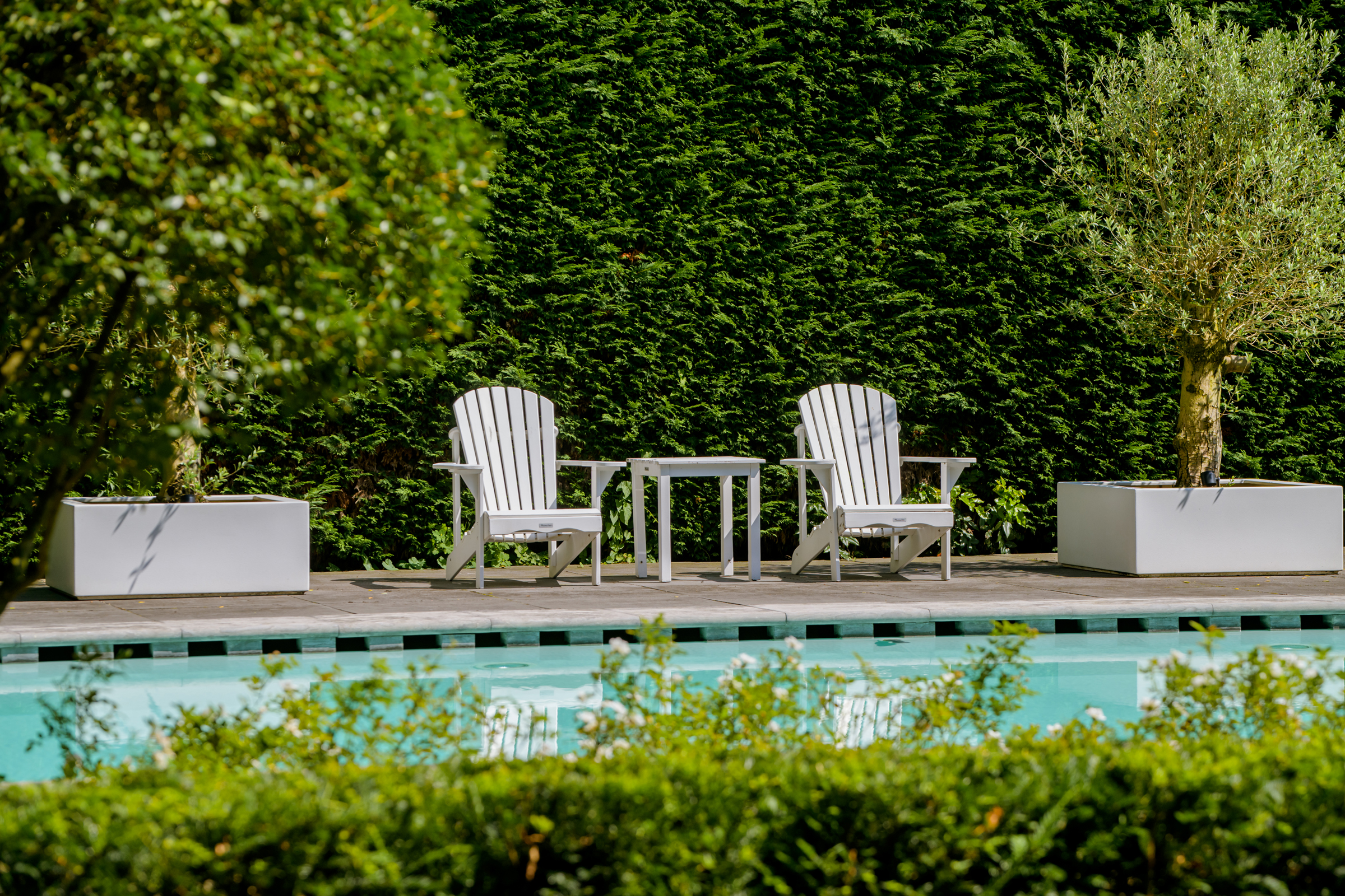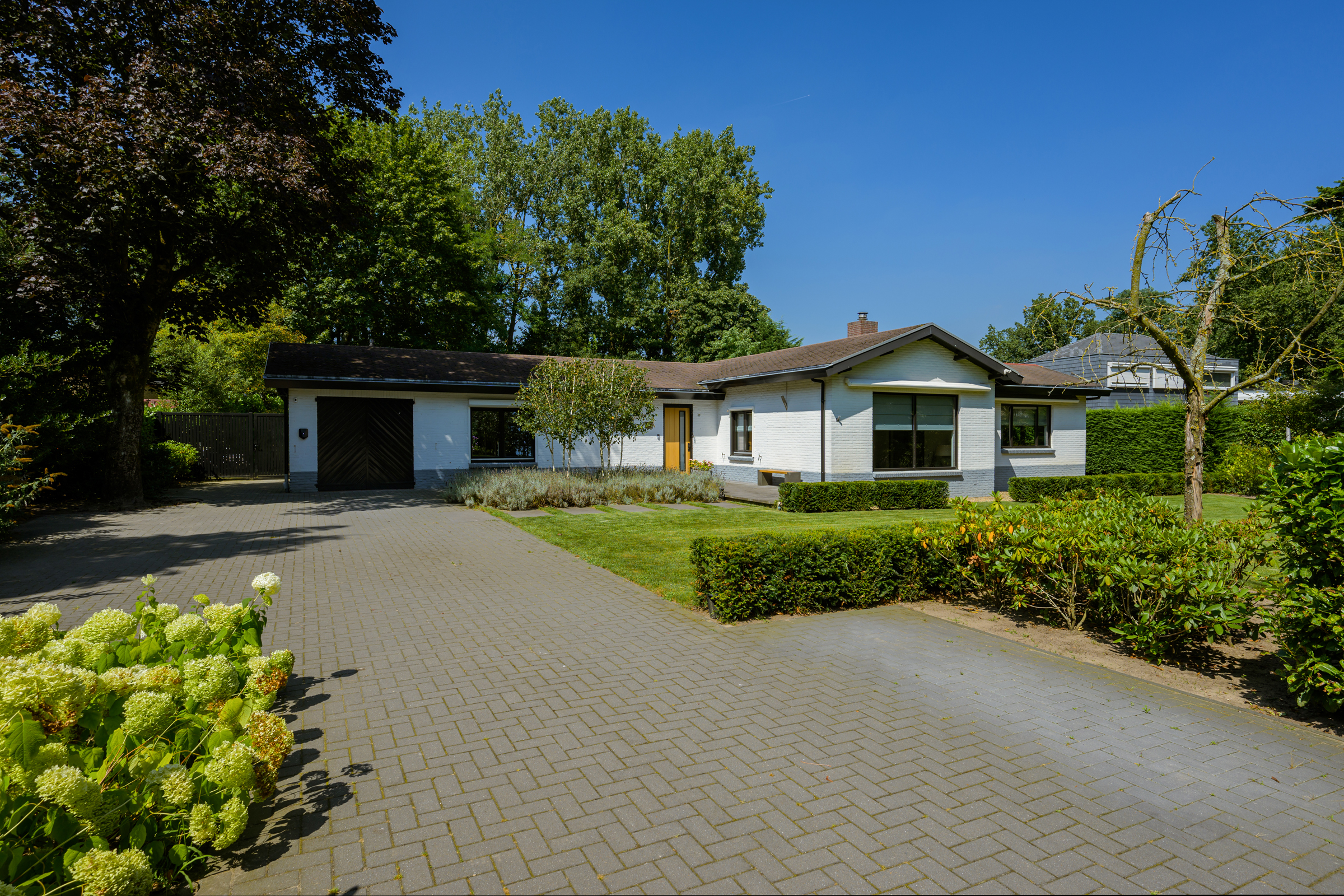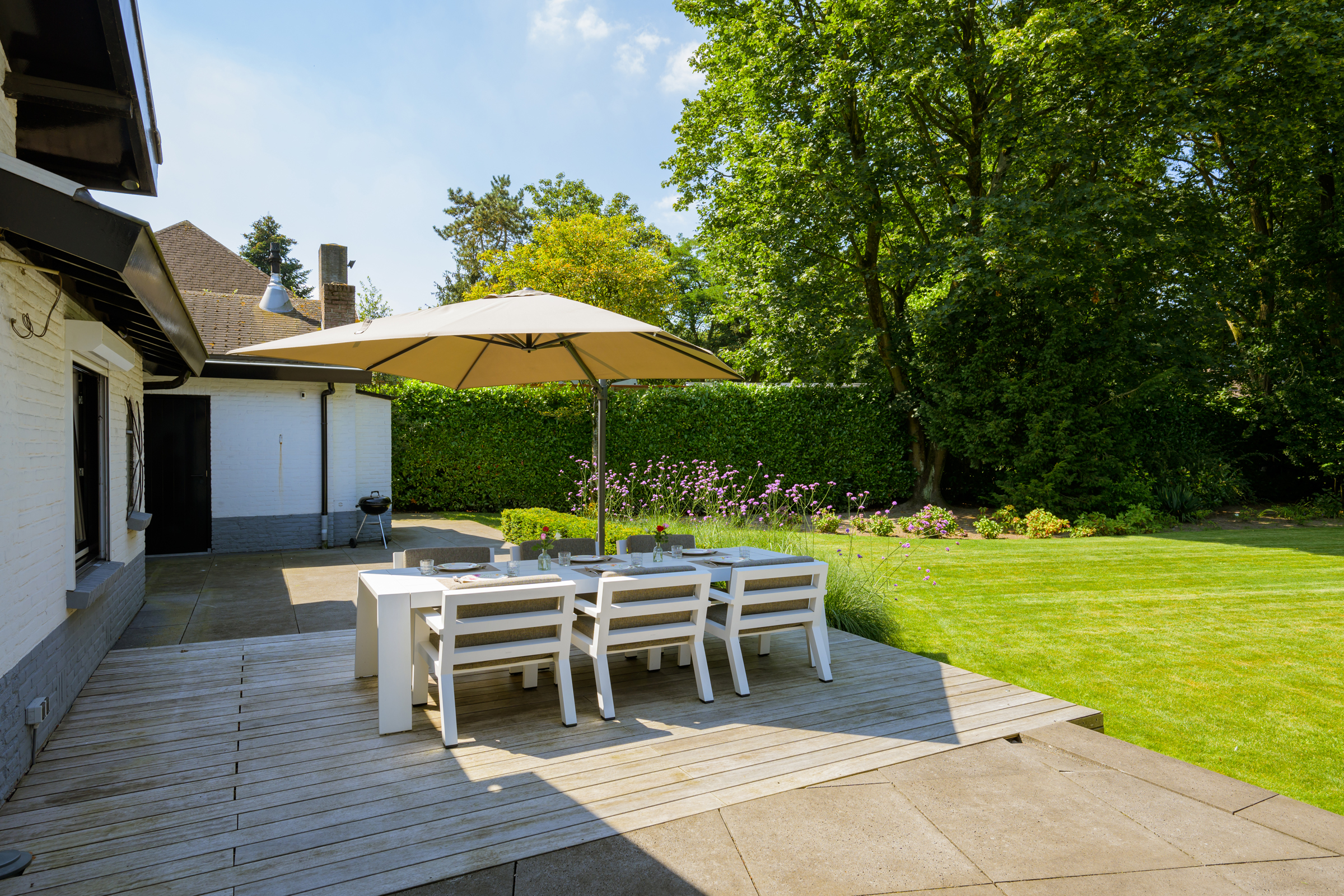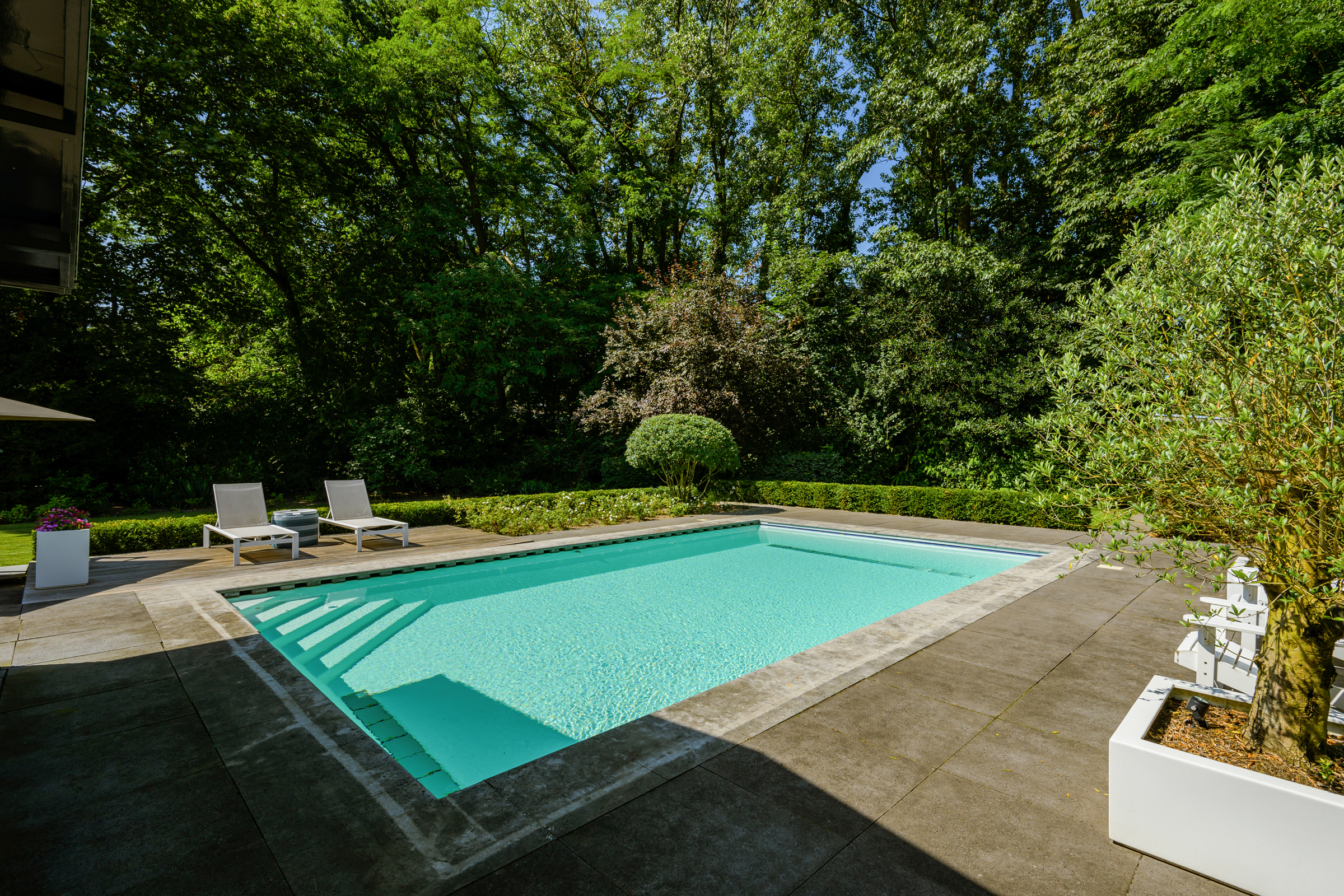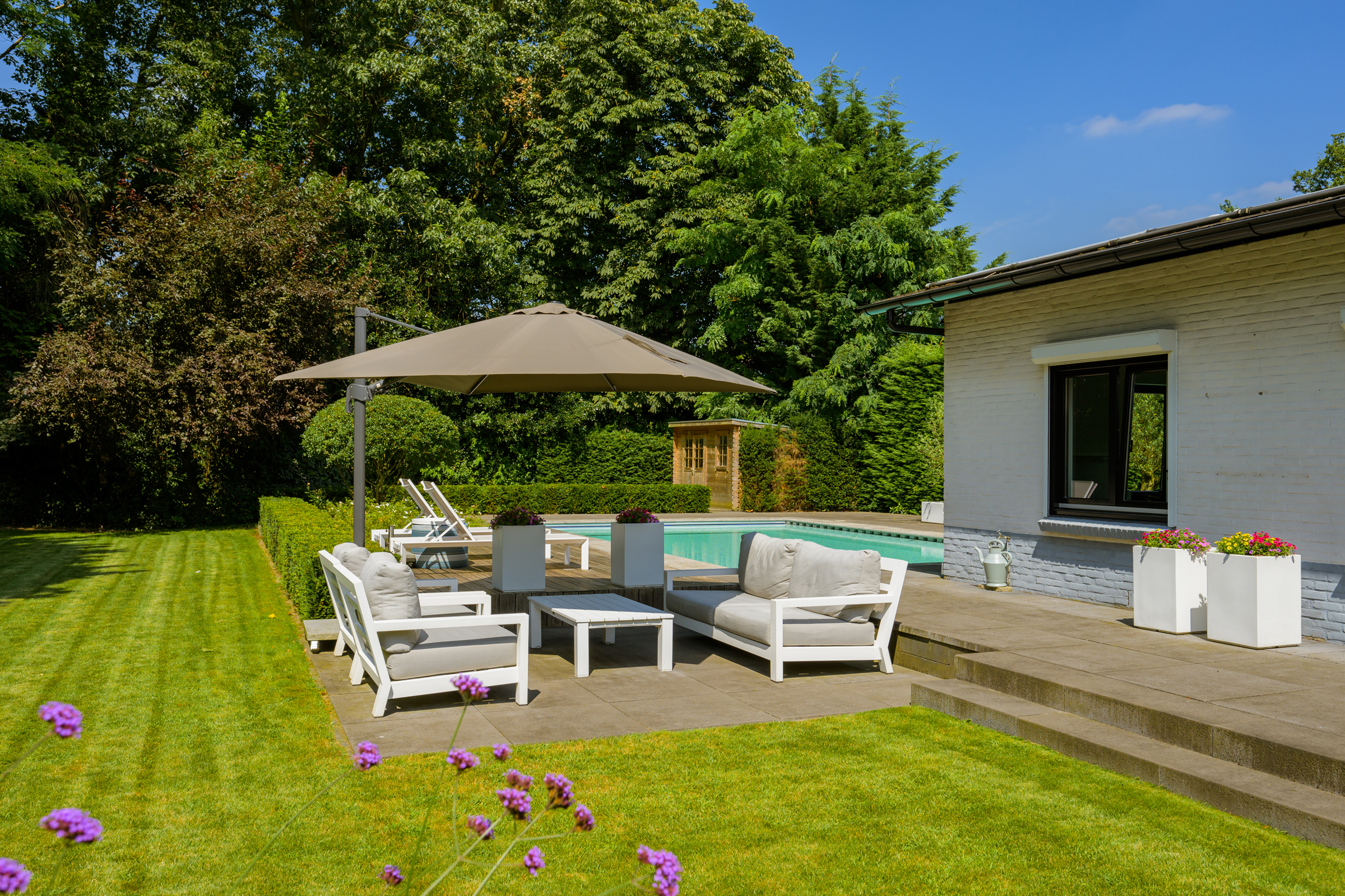 Le vaste jardin paysager, véritable havre privé, dispose de larges pelouses, de multiples terrasses, d’arbres mûrs, de plantations variées et d’une piscine chauffée de 6 x 9,5 mètres. Un grand garage, un espace de rangement sécurisé et une technologie discrète – alarme, stores, chauffage de la piscine, arrosage – témoignent d’une attention particulière portée au confort et à la confidentialité.