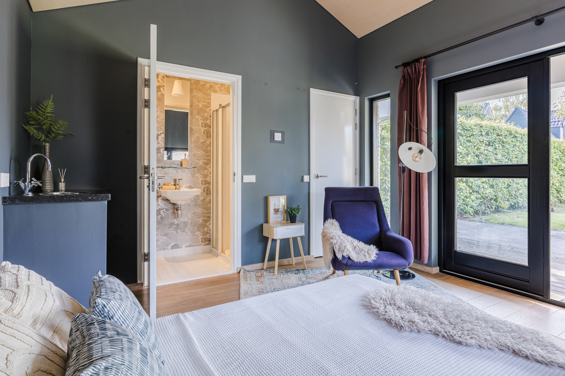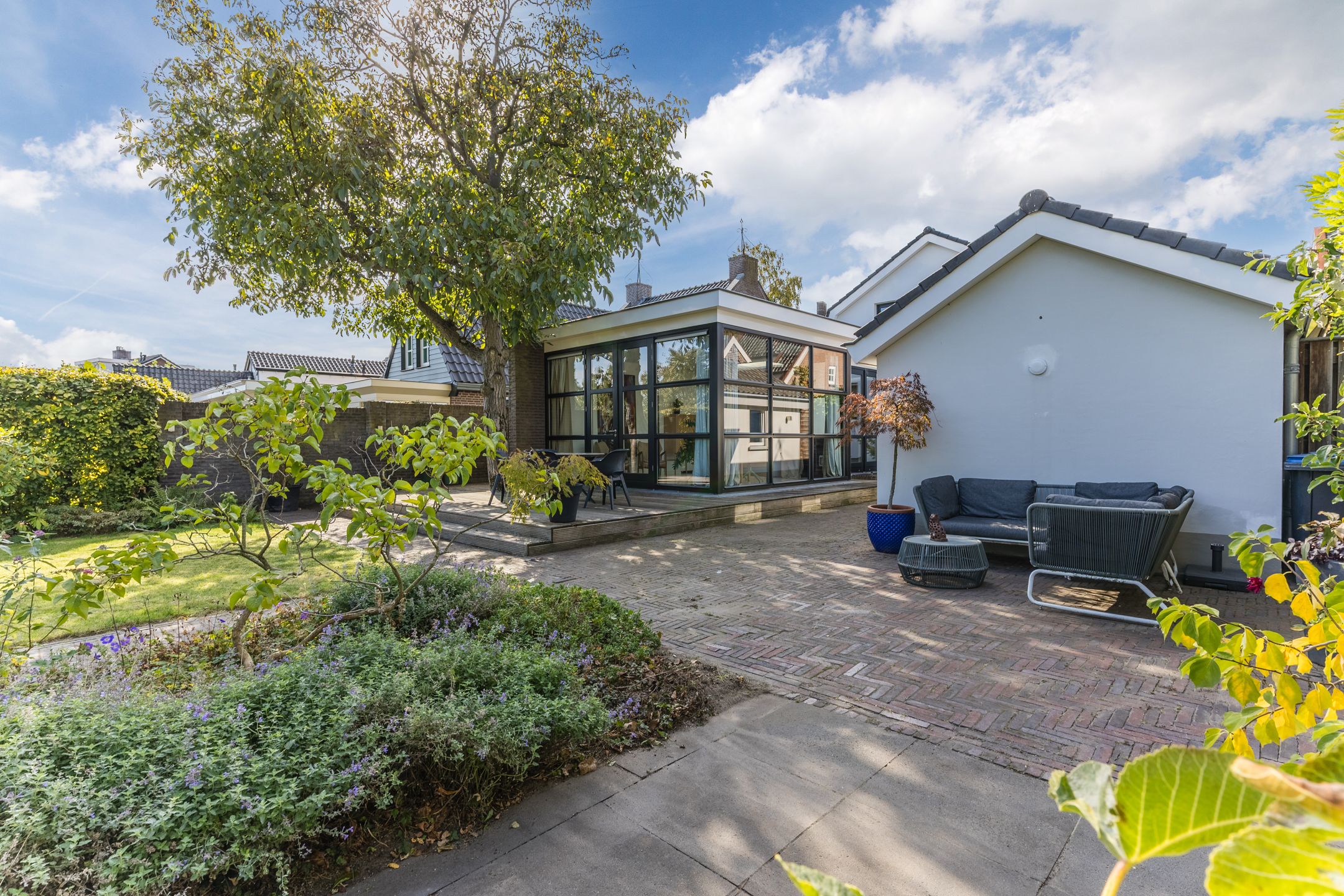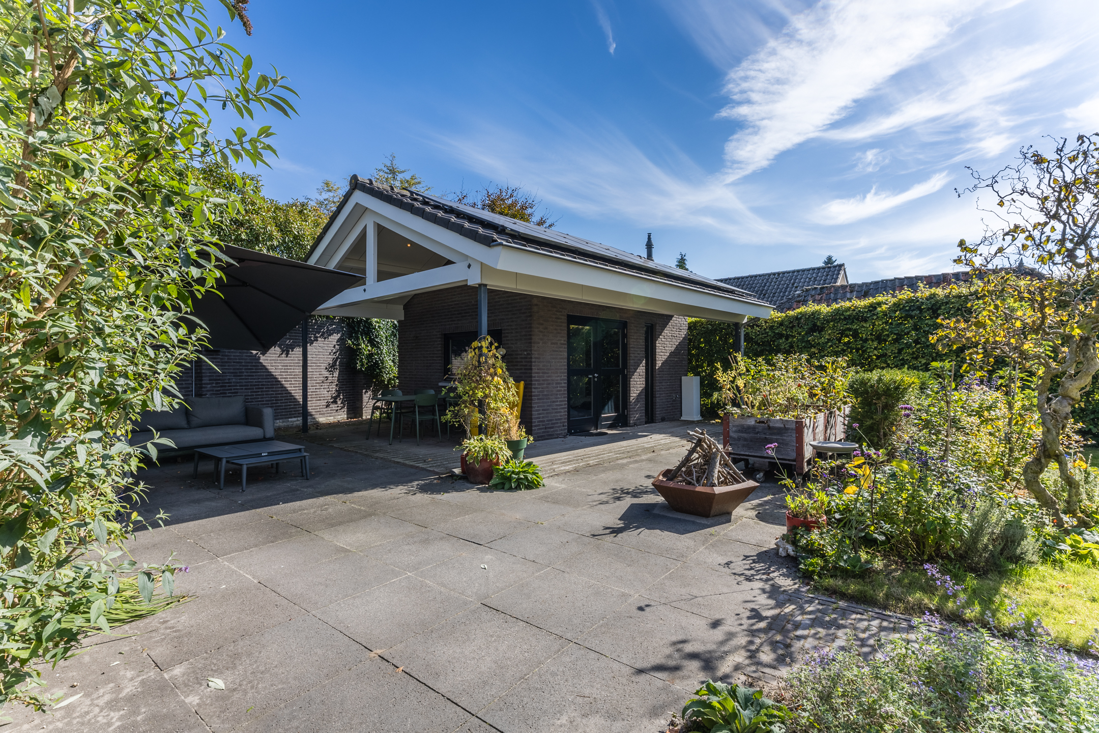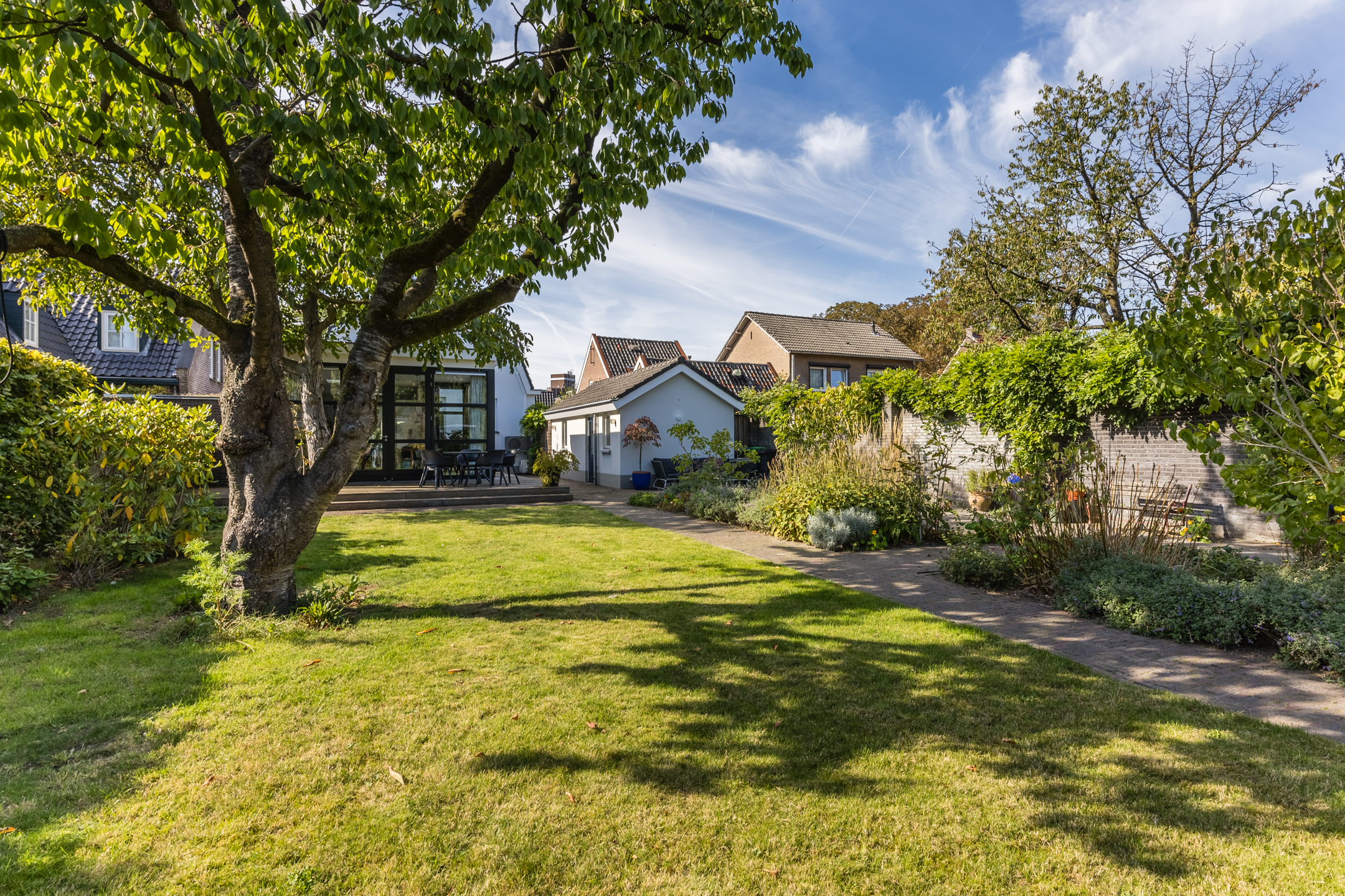 Le jardin paysager privé, à l'arrière de la maison principale, est complété par une dépendance isolée avec salle d’eau et chauffage, idéale comme bureau, suite d'invités ou atelier. Un garage et une grande allée offrent un confort pratique supplémentaire. La maison se situe paisiblement dans un ancien quartier arboré d’Uden, offrant un accès direct aux commodités du centre-ville. La proximité de l'autoroute A50 assure une connexion rapide avec Eindhoven, Den Bosch et Nimègue. Les réserves naturelles de Maashorst et Lieverlingsbos, toutes proches, invitent aux activités de plein air.