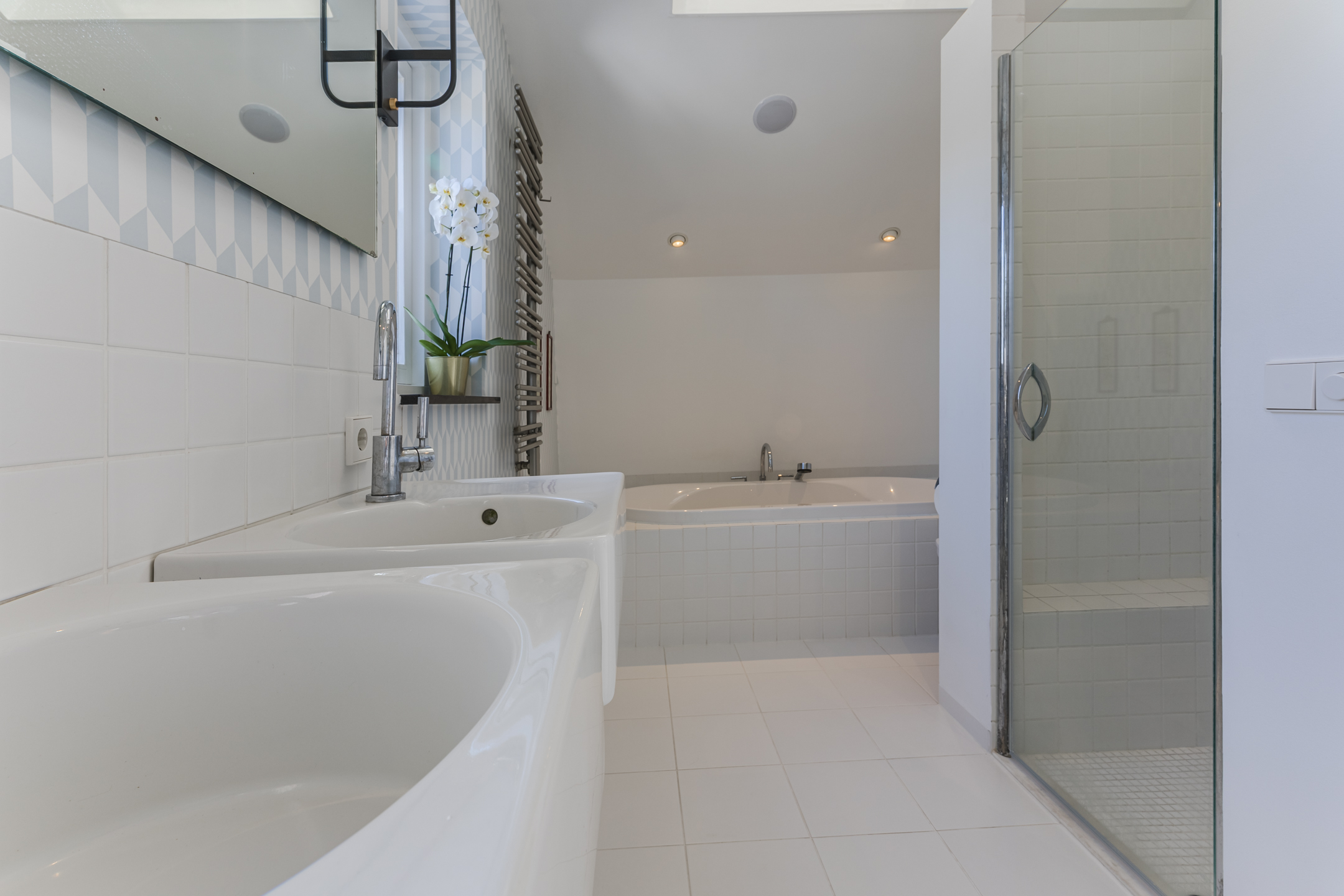 Le vaste séjour, doté d'une cheminée à gaz, s'ouvre aisément sur une cuisine-salle à manger baignée de lumière, bénéficiant de finitions raffinées. Chauffage au sol, hauts plafonds et matériaux sélectionnés avec soin insufflent une atmosphère sereine, tandis que les portes pivotantes délimitent subtilement les espaces. La cuisine dispose d'appareils intégrés, d'une vue sur le jardin et offre une grande convivialité pour le quotidien comme pour la réception. Les trois chambres, desservies par une salle de bains sobre et soignée avec chauffage au sol et douche à l'italienne, affichent une finition maîtrisée et élégante.