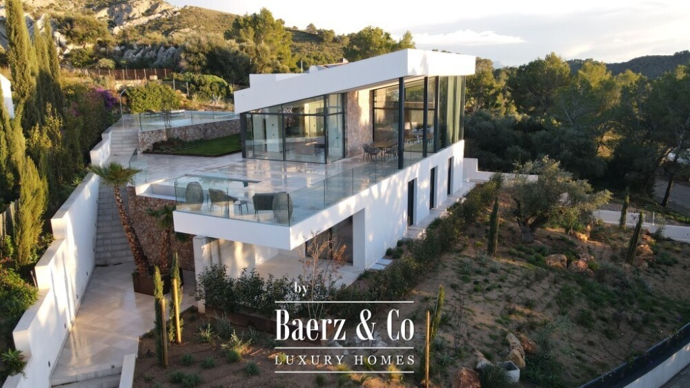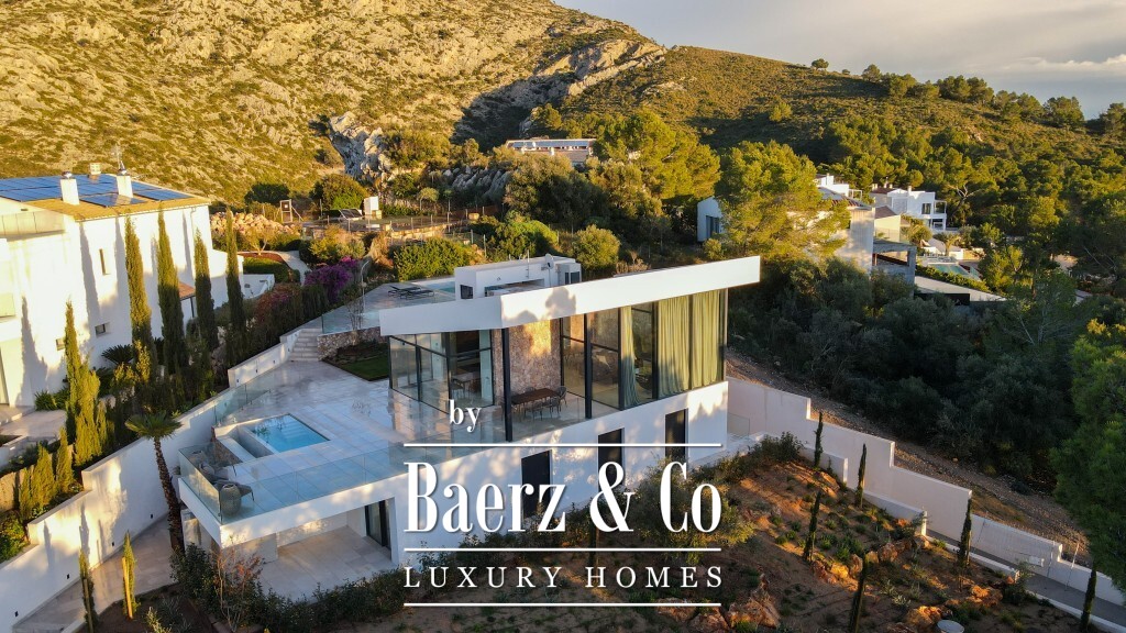 Moderne villa Alcúdia belichaamt ingetogen luxe in Paraiso de Bonaire, voltooid in 2024 en gelegen op een perceel van 1.153 m². De woning beschikt over 312 m² verfijnde leefruimte, verdeeld over drie verdiepingen met kamerhoge ramen die een panoramisch uitzicht op de baai en de bergen omlijsten.