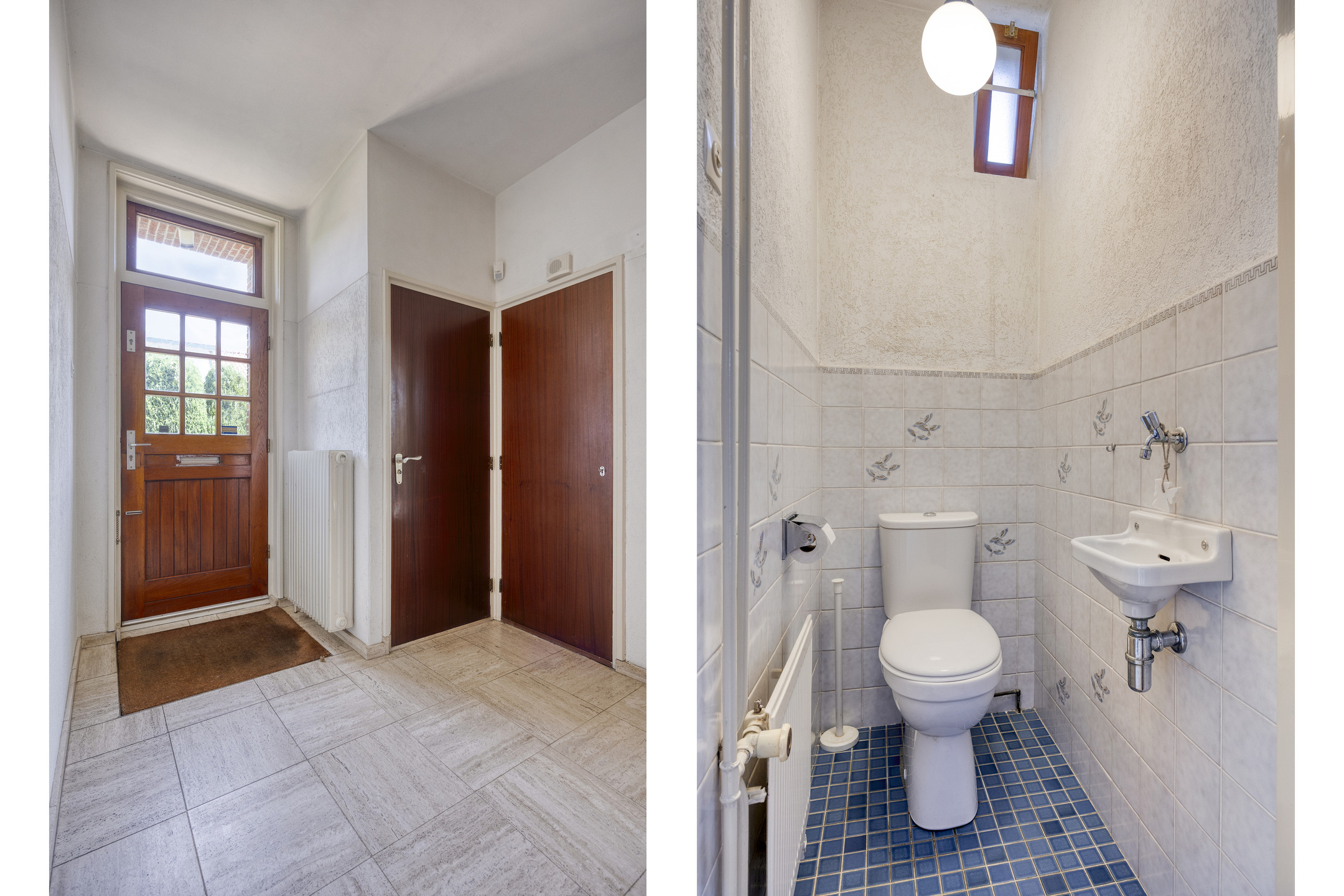 De linkerzijde van de hal geeft toegang tot een separaat toilet met fontein, de meterkast en tot de woonkamer. De woonkamer is ruim en licht, met grote raampartijen, een originele vaste kast, een open haard en een schuifpui naar de volgroeide voor-, zij- en achtertuin.