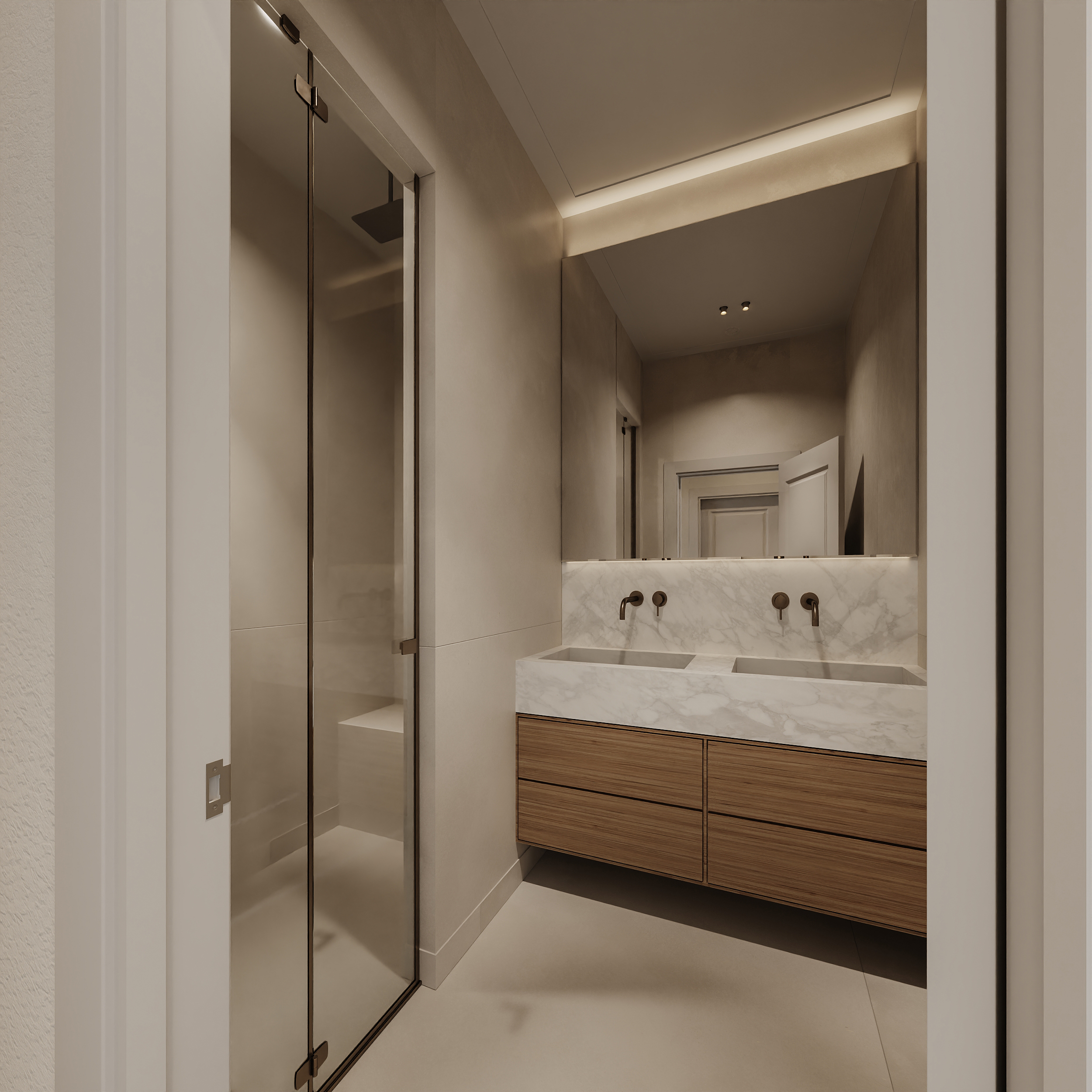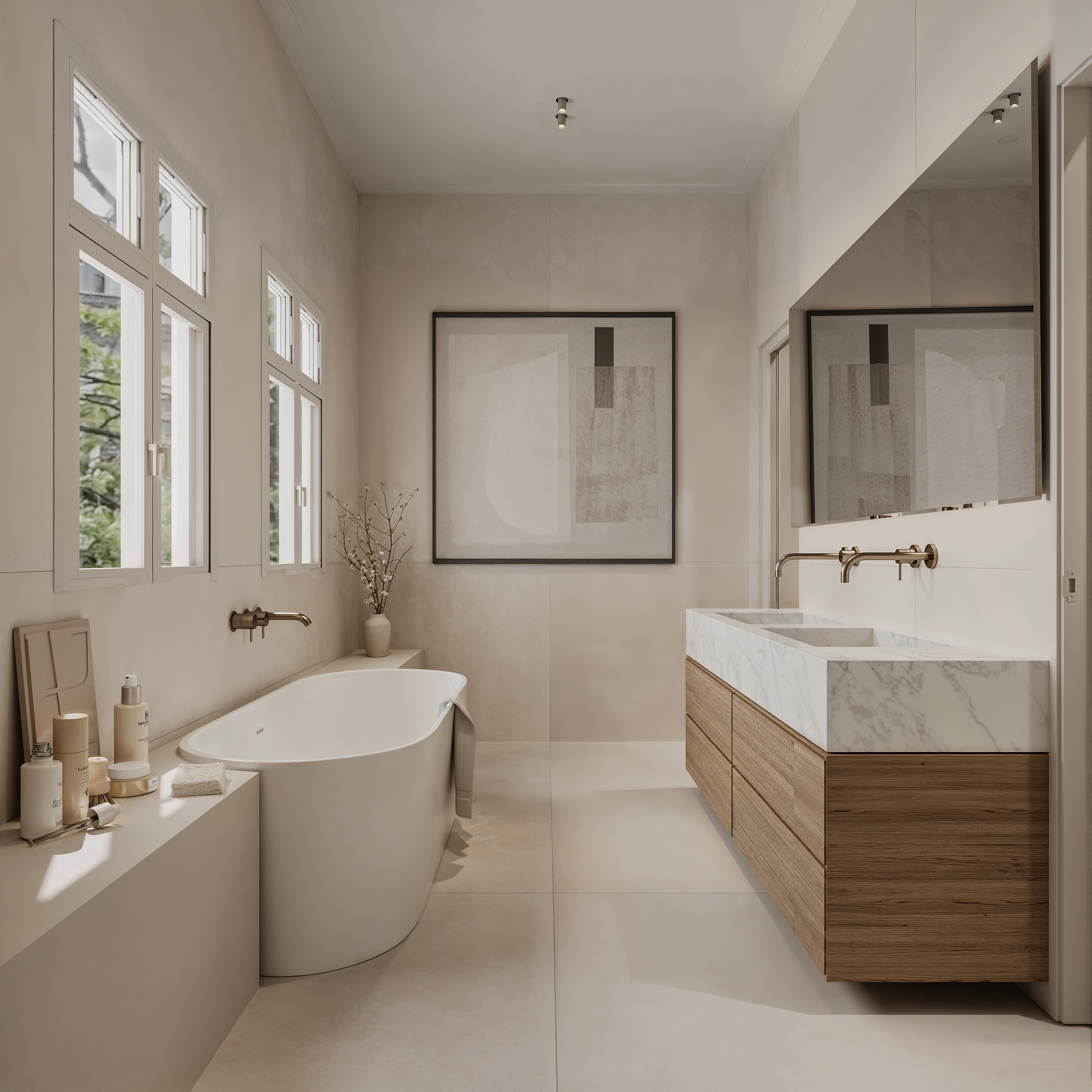 De getoonde foto’s zijn artist impressions (renders) en bedoeld om een goede indruk te geven van de sfeer en mogelijkheden van de woning. Het appartement wordt uiteraard volledig en hoogwaardig afgewerkt opgeleverd, inclusief keuken, badkamers en alle vaste voorzieningen.