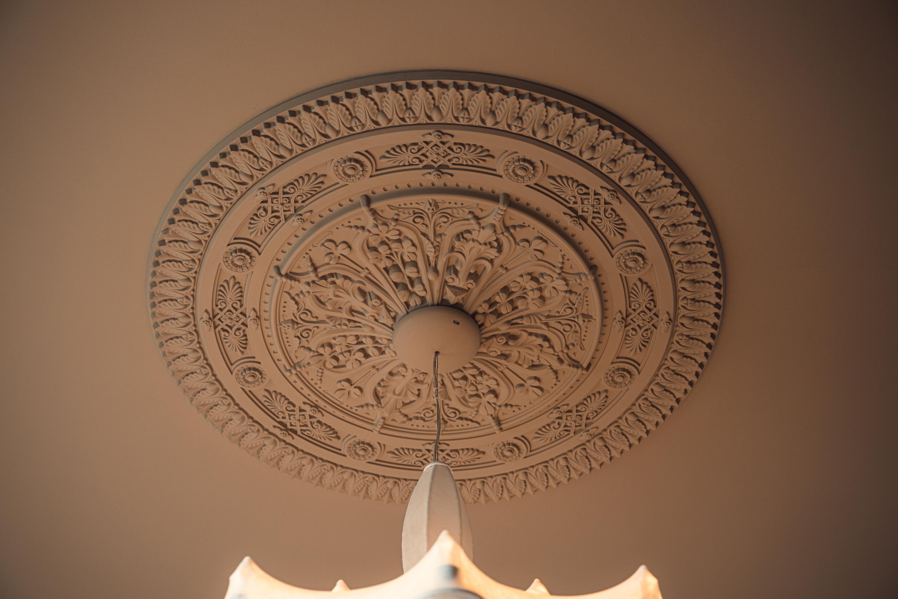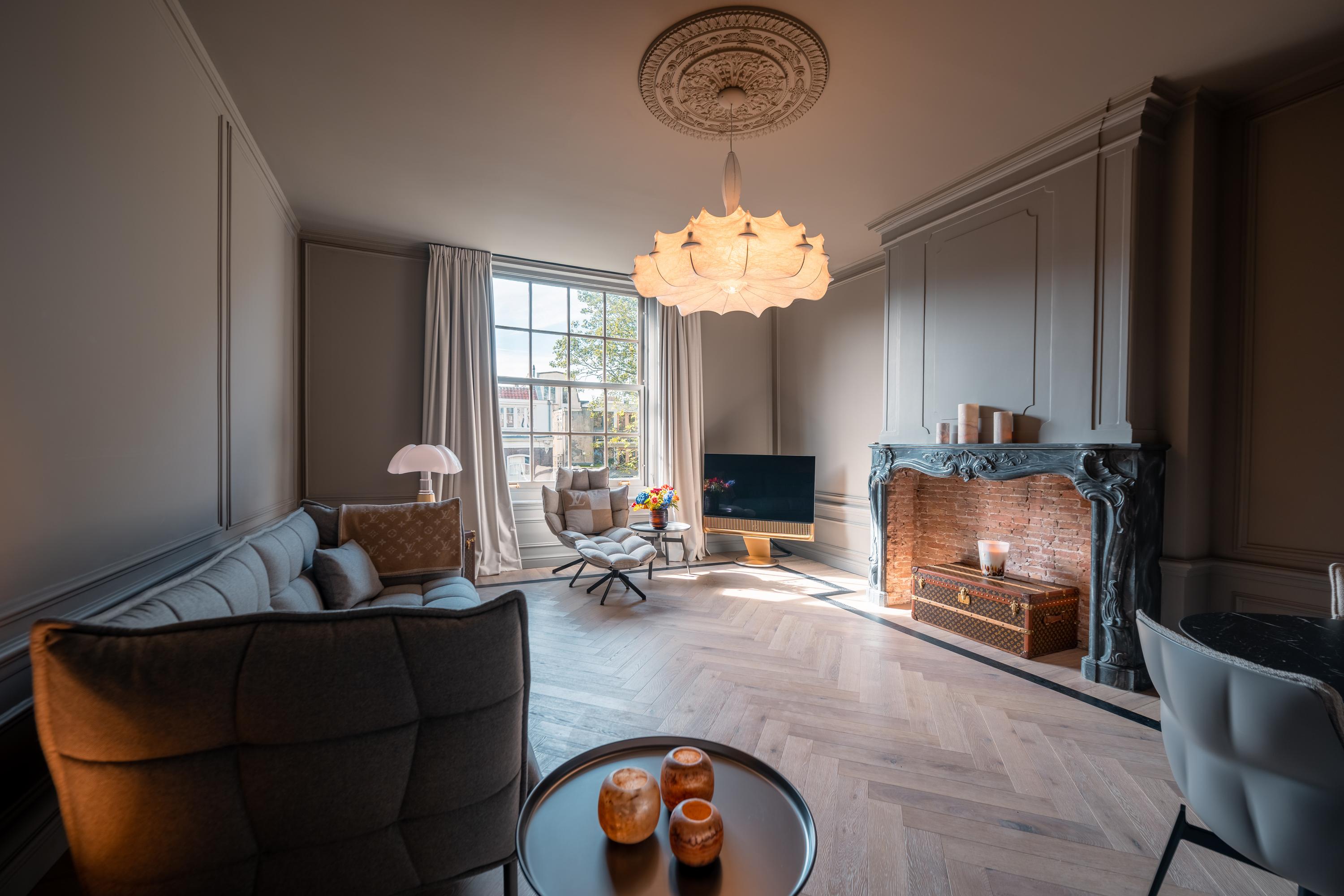 De royale woonkamer is een ware eyecatcher. Het klassieke stucwerk, de ornamenten en de prachtige plafondlijst met rozet geven de kamer extra allure en warmte. Centraal in de ruimte staat de (monumentale) marmeren schouw met open haard, die een stijlvolle combinatie vormt met de strakke, eigentijdse inrichting. De visgraat houten vloer met donkere bies benadrukt de lengte van de kamer en sluit perfect aan bij de verfijnde wandafwerking.