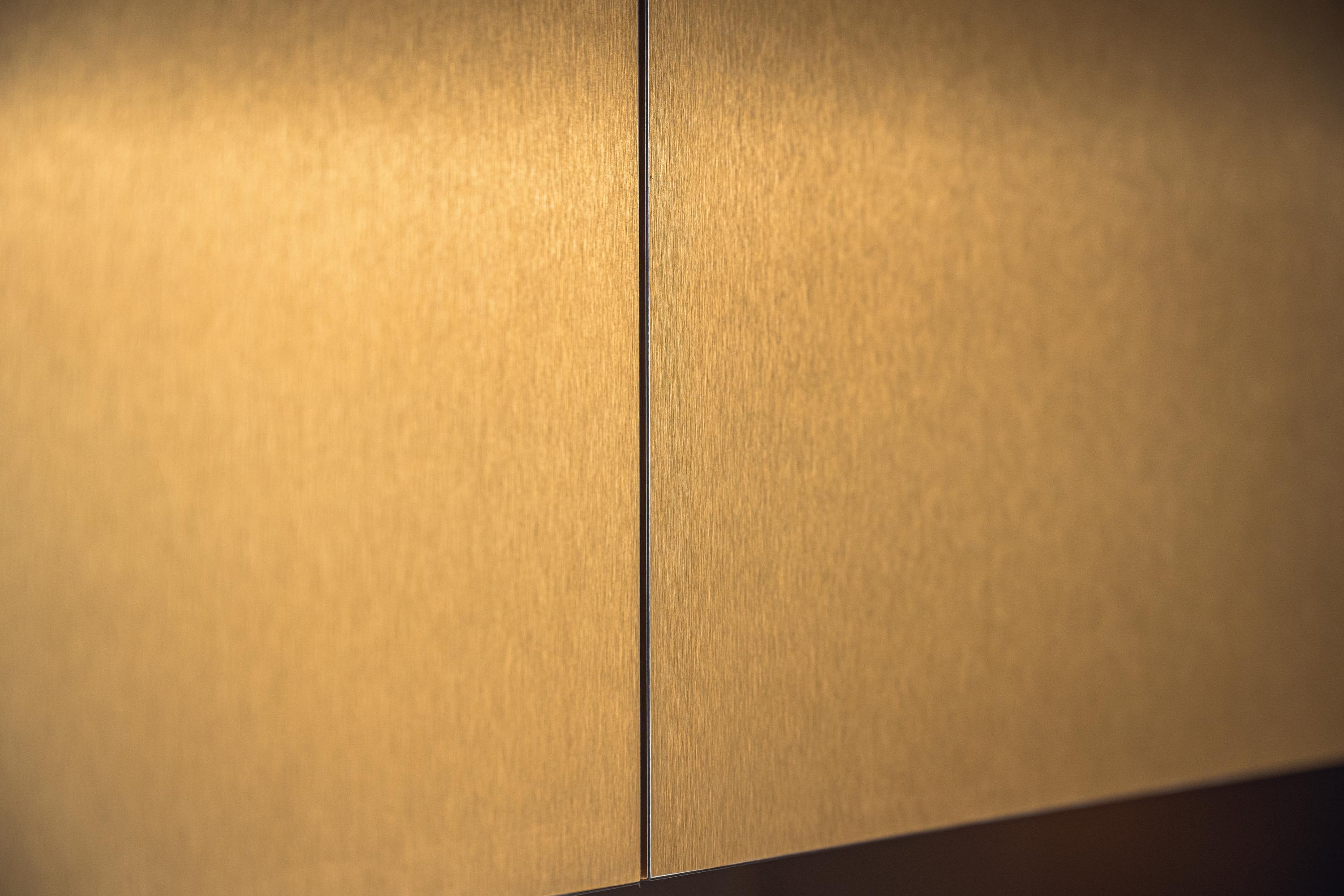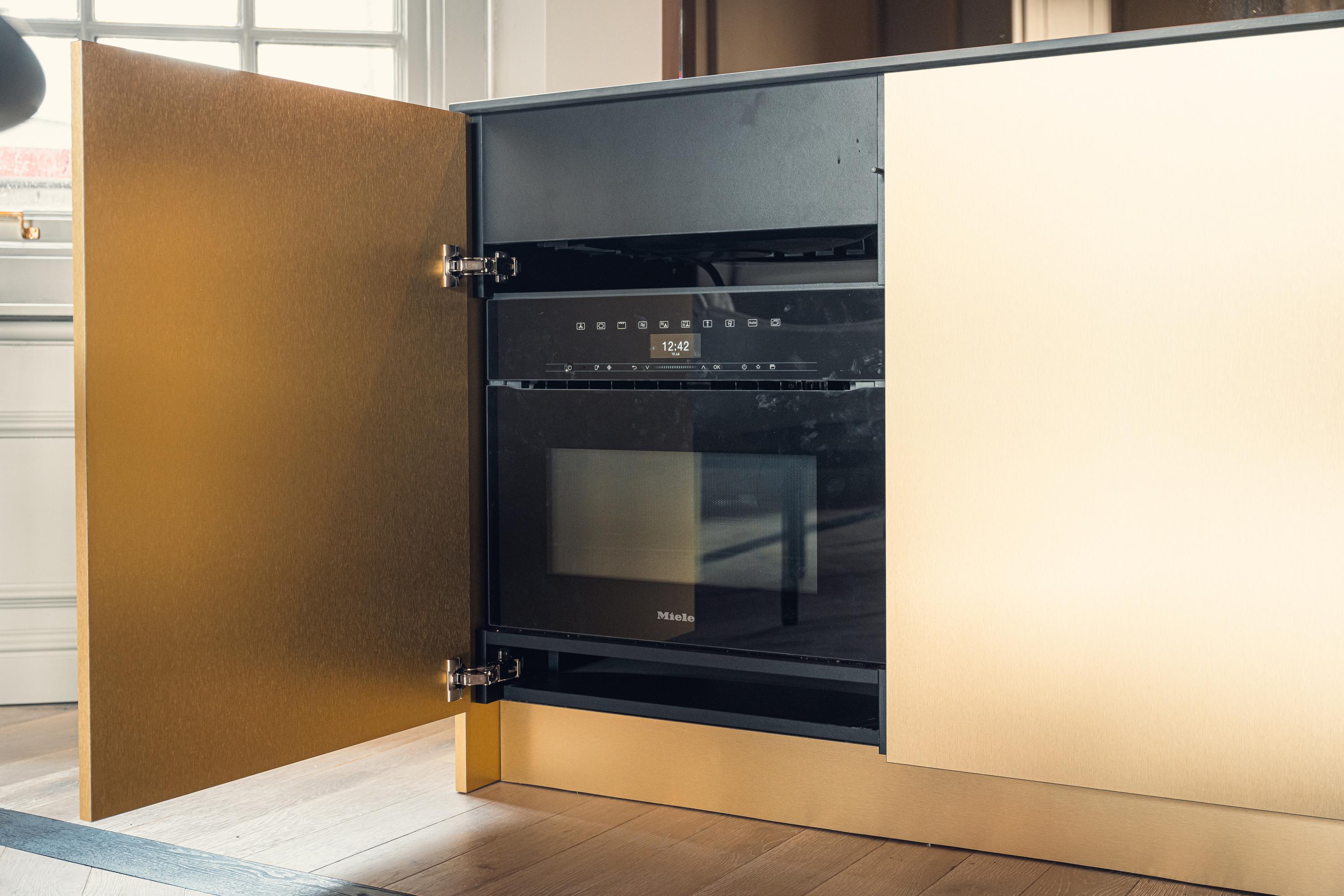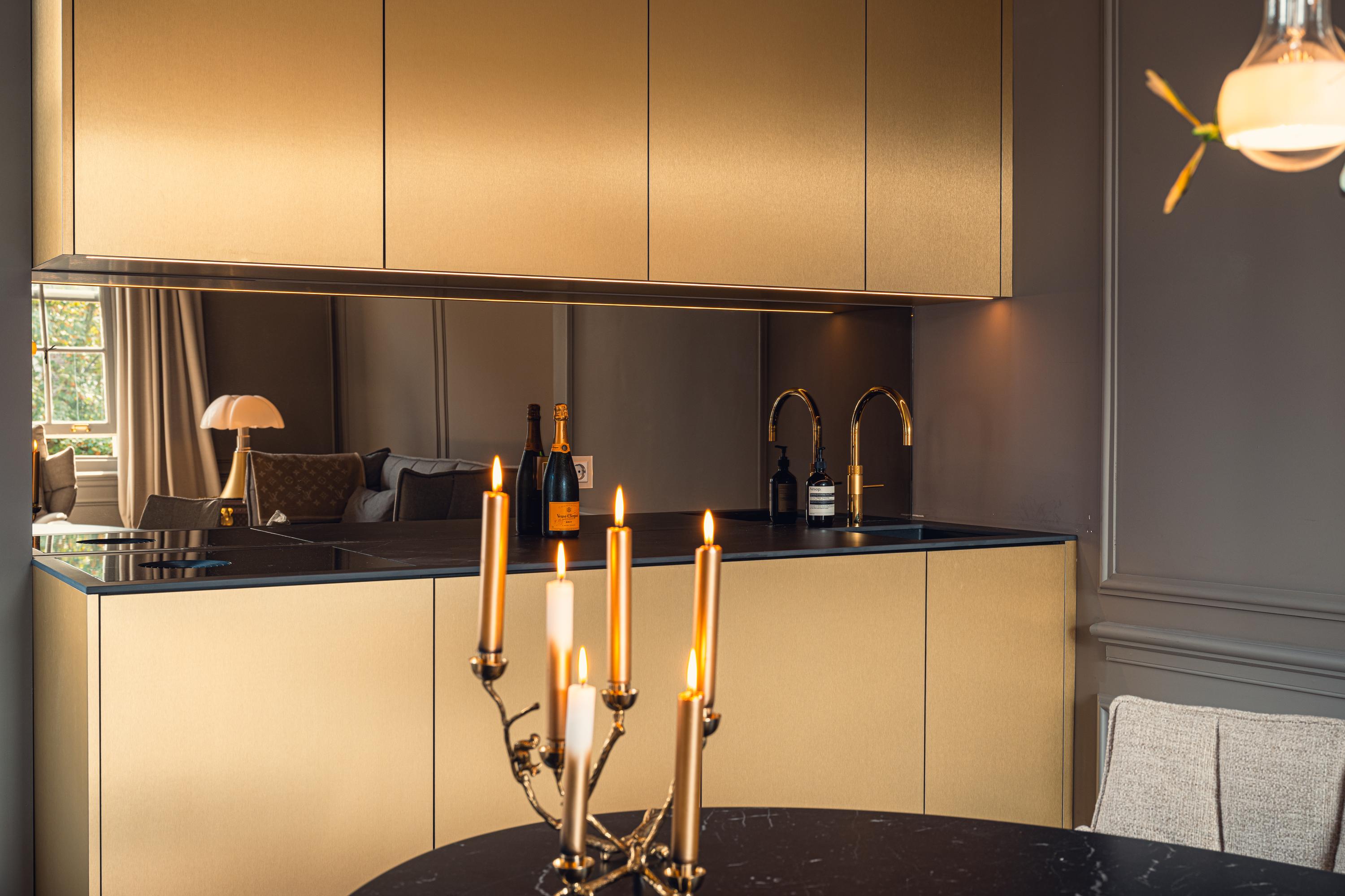 Aan de achterzijde bevindt zich de moderne keuken, uitgevoerd in een goudkleurige tint die prachtig contrasteert met de warme houten vloer en neutrale wandkleuren. De keuken is voorzien van hoogwaardige Miele inbouwapparatuur, Quooker, Bora inductie kookplaat en biedt voldoende kastruimte. Dankzij de open verbinding met de woonkamer blijft de ruimte licht en uitnodigend, ideaal voor wie houdt van gezellig koken en tafelen.