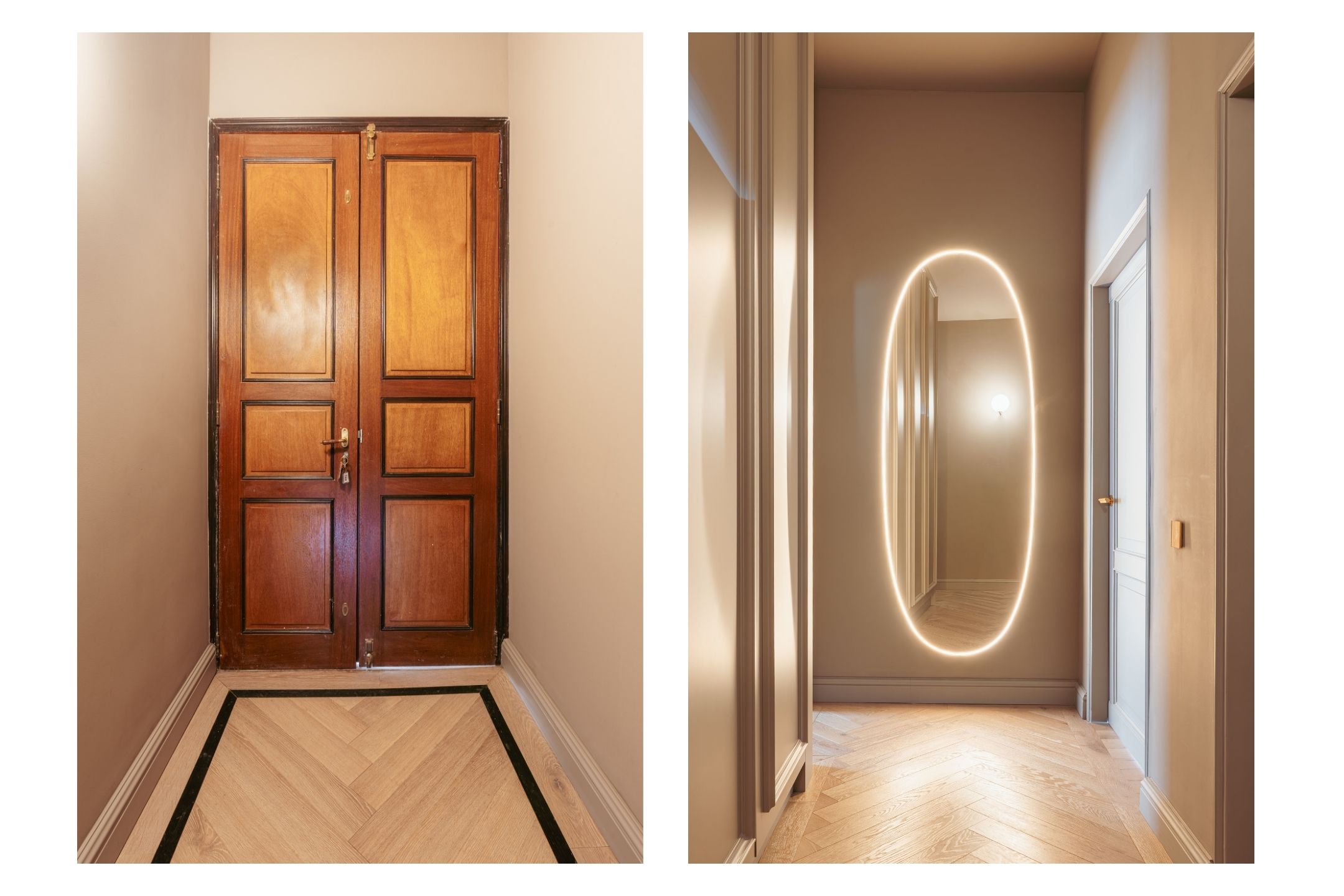 Zodra u het appartement binnen treedt valt direct de verfijnde afwerking op: hoge plafonds, paneeldeuren, houten vloer afgerwerkt met een zwarte bies en een smaakvol kleurgebruik zorgen voor een luxe en warme sfeer.
