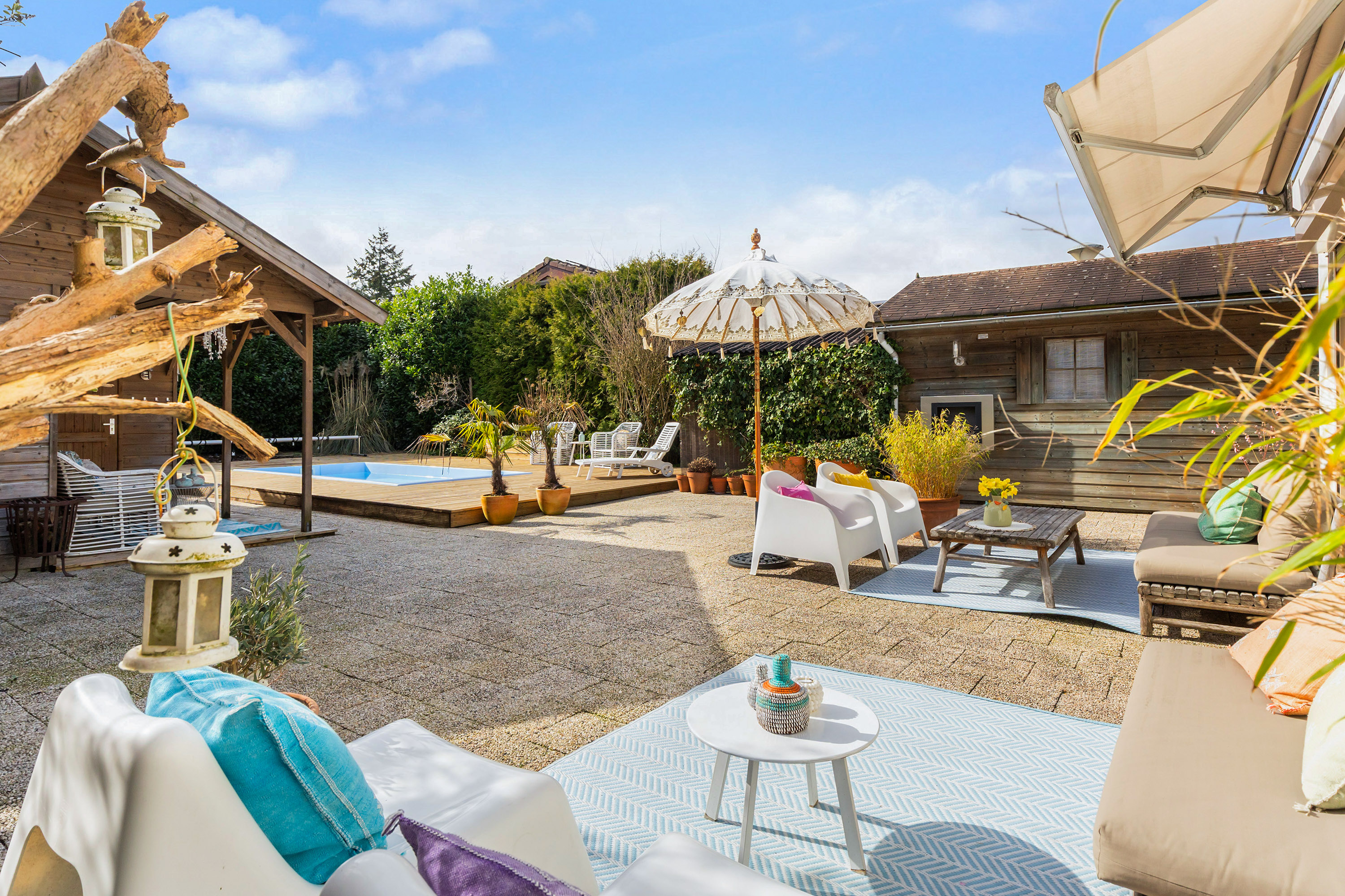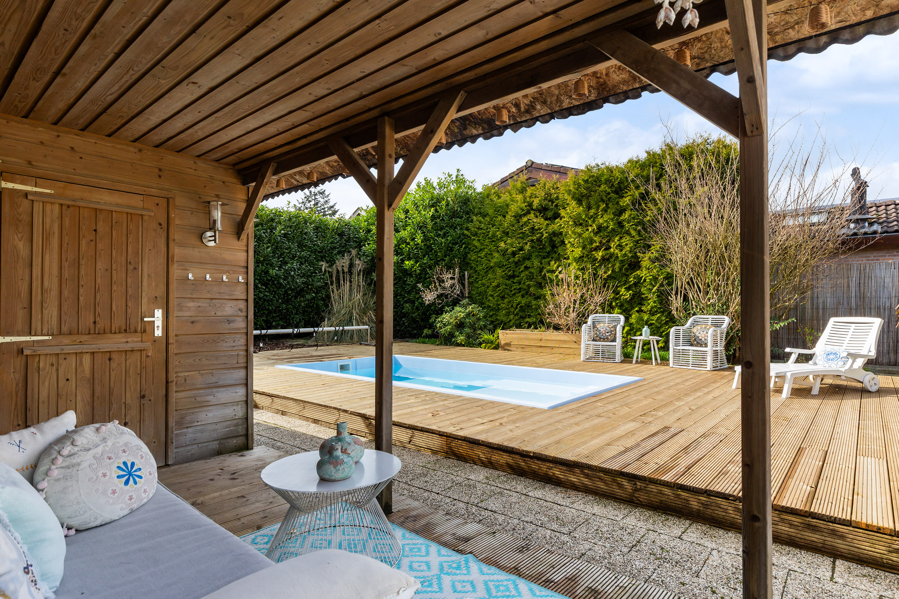 In de tuin ligt het in 2025 gerealiseerde zwembad met een afmeting van circa 5 x 2,75 meter en een diepte van 1,20 meter. Het polyester zwembad beschikt over een aangenaam ondiep zonnedek en verlichting in verschillende kleuren. De rolcover zorgt ervoor dat het bad veilig kan worden afgesloten. Rondom het zwembad ligt een houten vlonderterras met ruimte voor ligbedden en een terras.