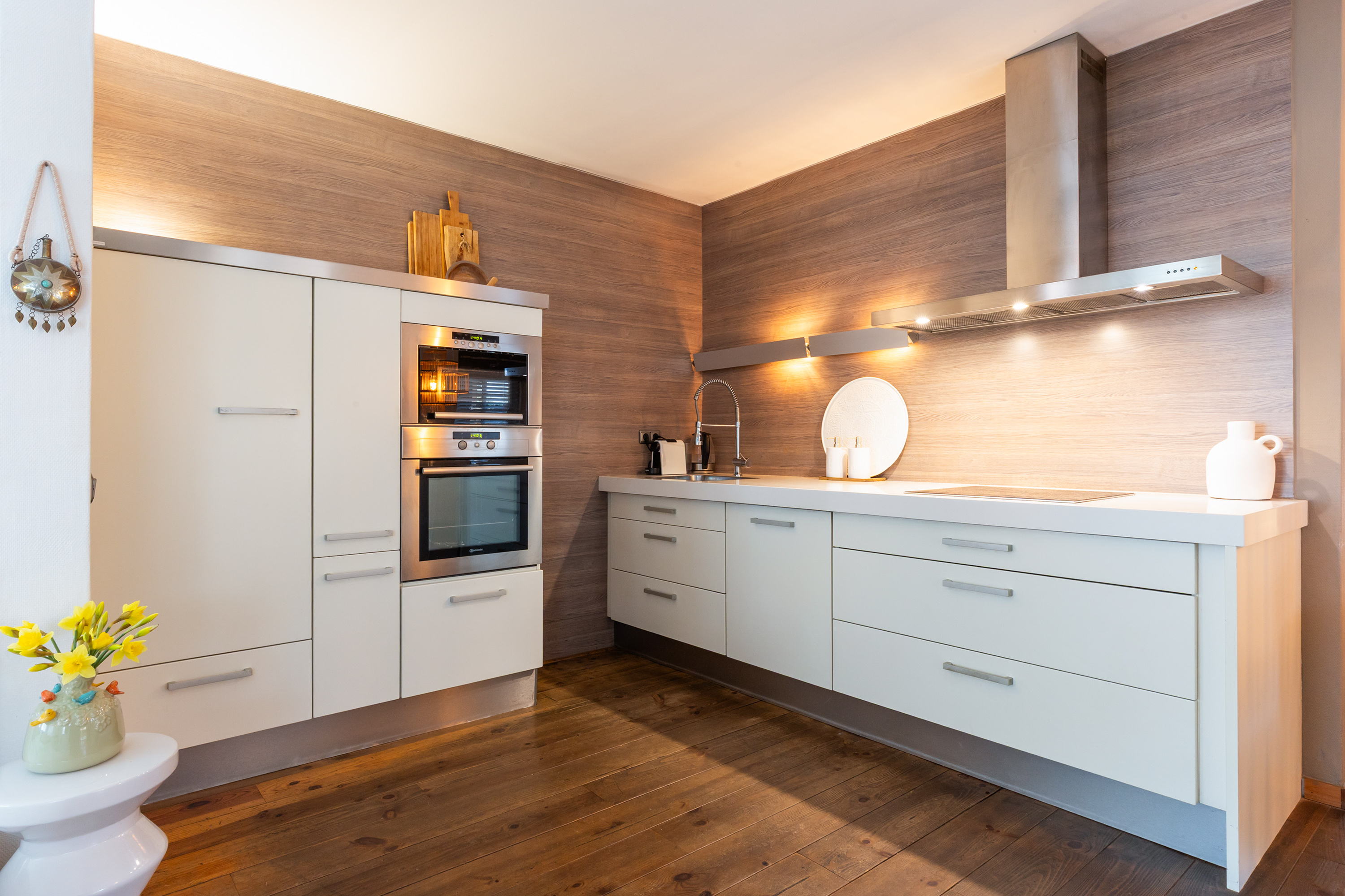 De woonkamer staat in open verbinding met de royale woonkeuken. De woonkeuken heeft een tweedelige luxe keukenopstelling met diverse inbouwapparatuur, waaronder een oven, magnetron, vaatwasser, koelkast, afzuigkap met filters en een inductiekookplaat. De keuken is afgewerkt met een hoogwaardig en extra diep Caesarstone werkblad, dat een elegante uitstraling geeft en tevens duurzaam en onderhoudsvriendelijk is.
