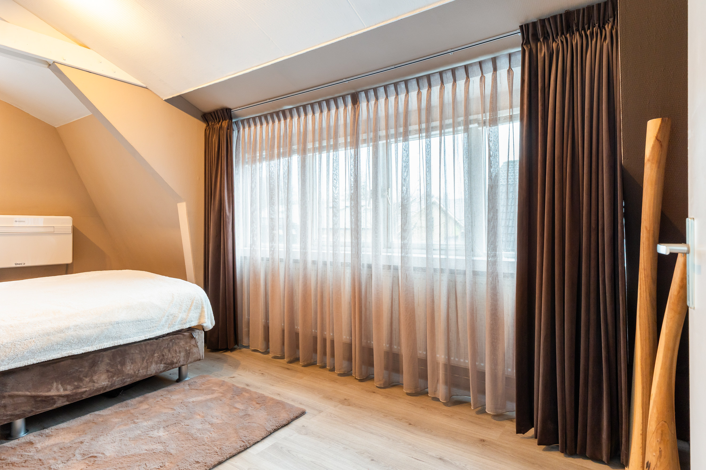 Daarachter bevindt zich een royale hoofdslaapkamer met een eigen luxe badkamer. De slaapkamer heeft een bijzonder karakter door de zichtbare balken en een vaste trap naar een ruime vide. Deze kan uitstekend dienen als werkplek, studeerruimte of extra bergruimte. Zowel boven als beneden zijn praktische inloopkasten aanwezig. Via een schuifpui vanuit de slaapkamer loopt u direct de tuin in.