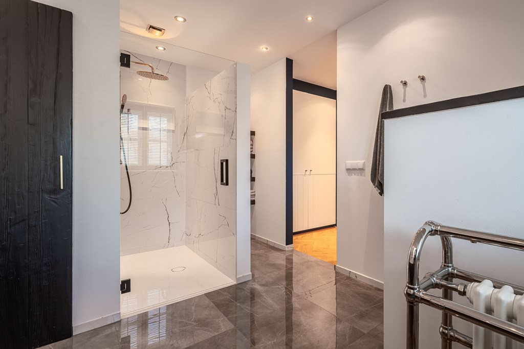 Slaapkamer 1 (master bedroom) is gelegen aan de achterzijde van de woning. Deze slaapkamer is voorzien van een gashaard, kastenwand en een airco. Aansluitend heeft u via de kleedkamer toegang tot de badkamer ensuite.