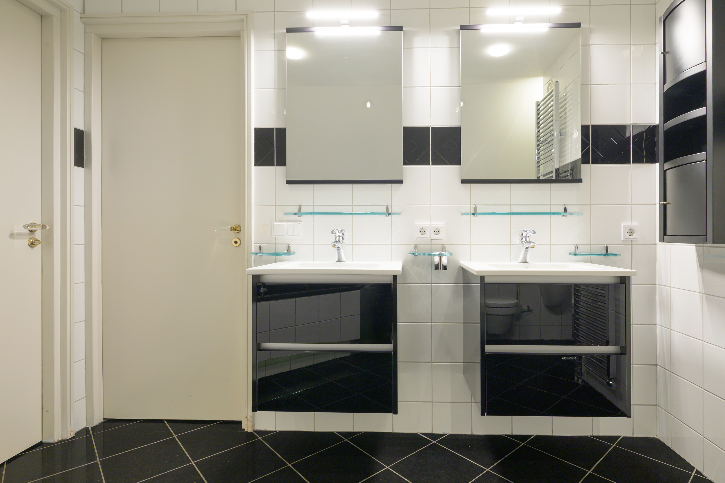 De badkamer is uitgerust met een ligbad, een wandcloset met inbouwreservoir, een urinoir, een bidet, een inloopdouche, een designradiator en een dubbele wastafel, geïntegreerd in een meubel. De badkamer is ook rechtstreeks te betreden vanuit de gang.