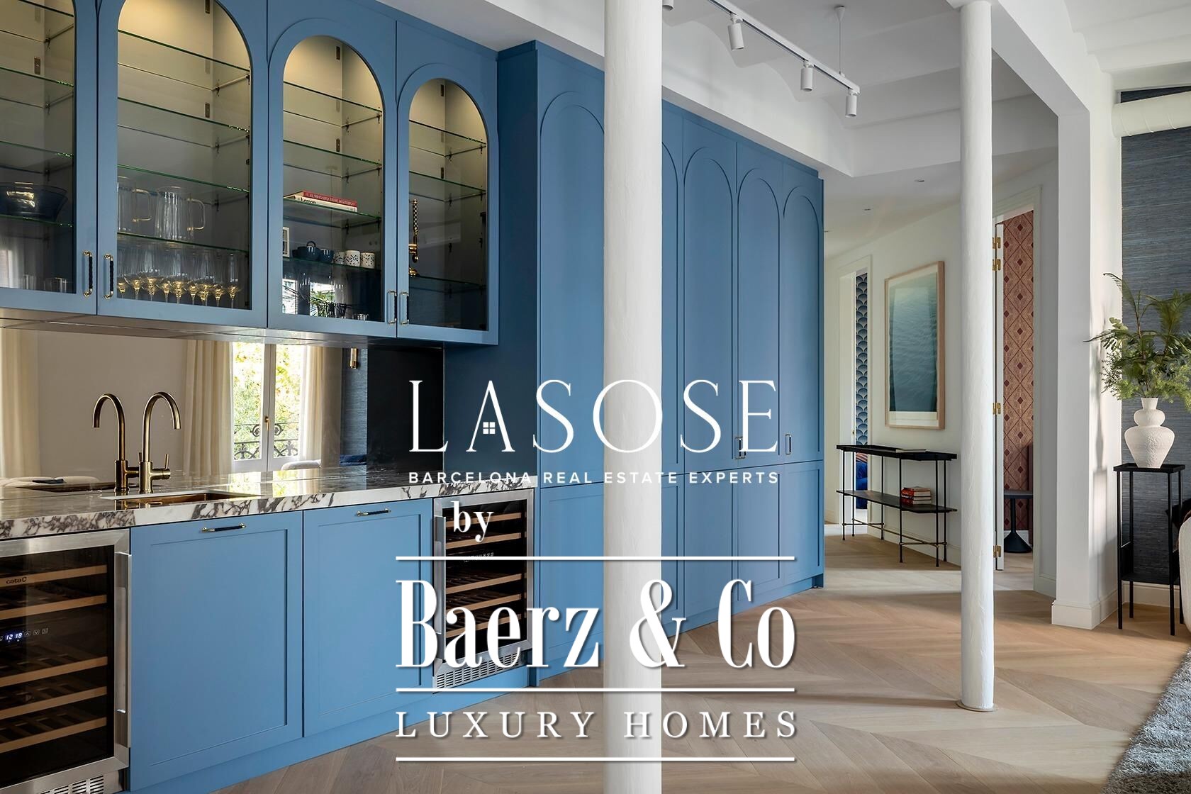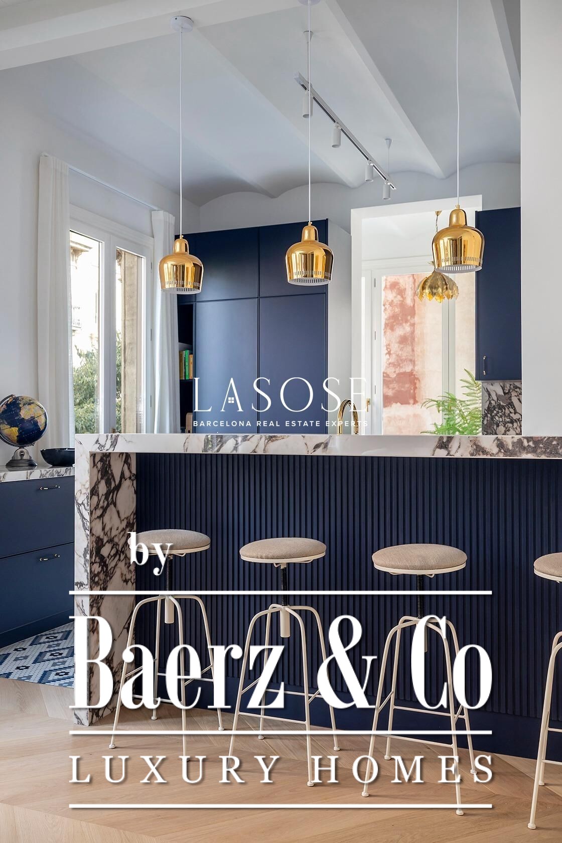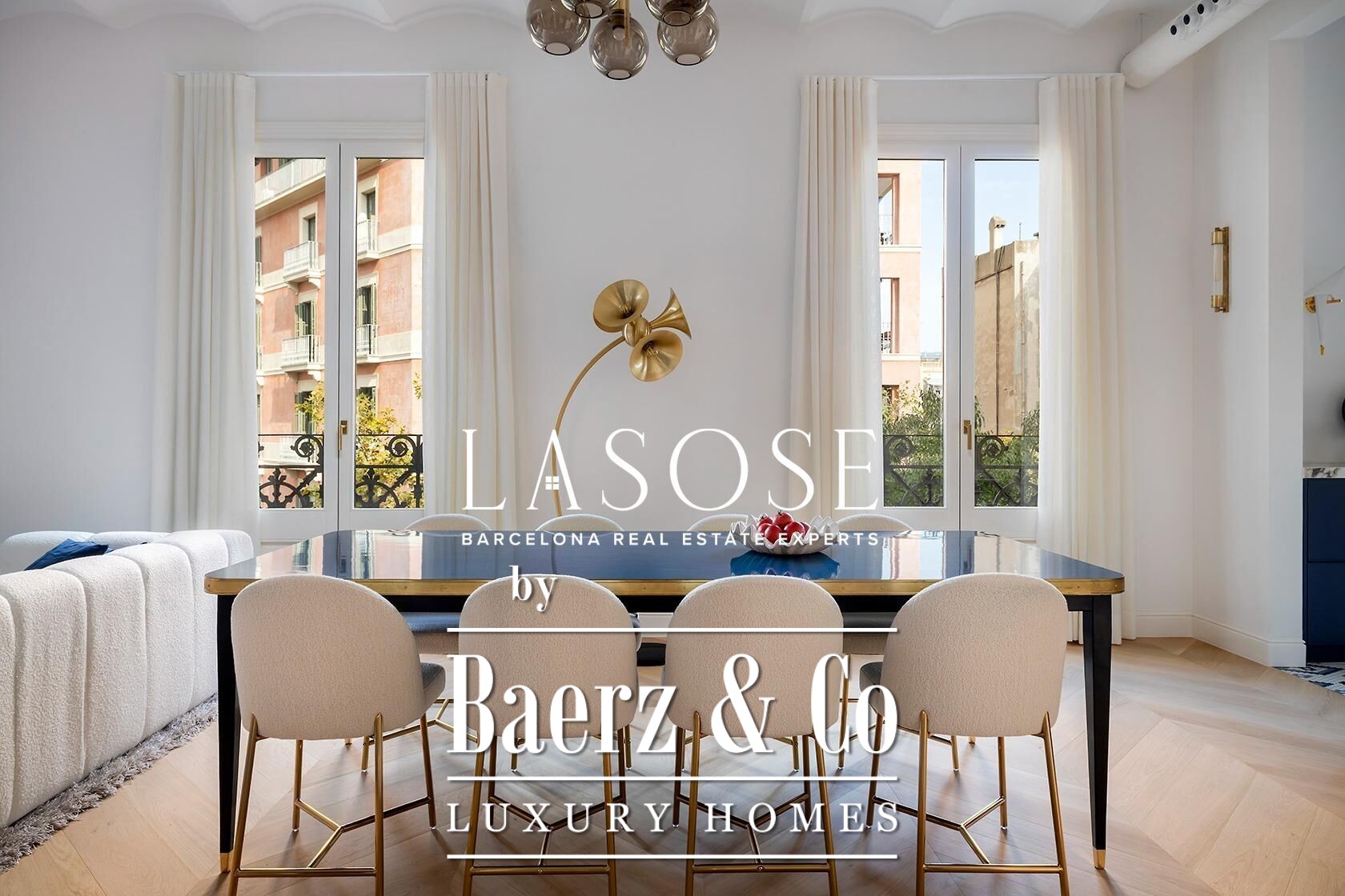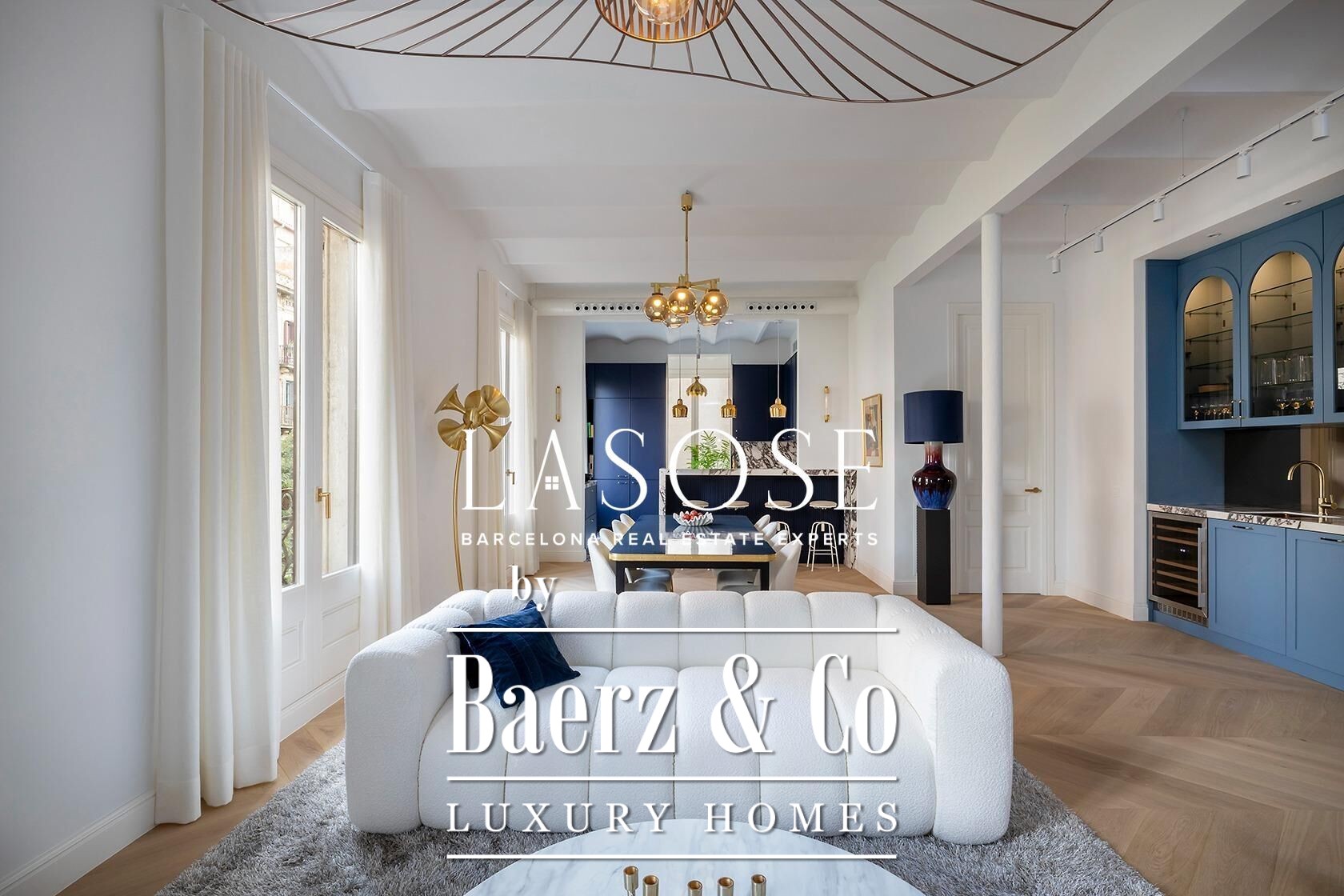 Appartement Barcelona nodigt uit tot verfijnd stedelijk wonen. Deze woning van 199 m² op de derde verdieping is recent gerenoveerd en zorgvuldig ontworpen om optimaal gebruik te maken van het natuurlijke licht; vier balkondeuren aan de Calle Girona en royale ramen versterken de lichte sfeer. De indeling verloopt vloeiend van de open keuken en eetruimte naar een woonkamer, voorzien van een maatwerkbar en bijkeuken met twee wijnklimaatkasten en een tweede vaatwasser.