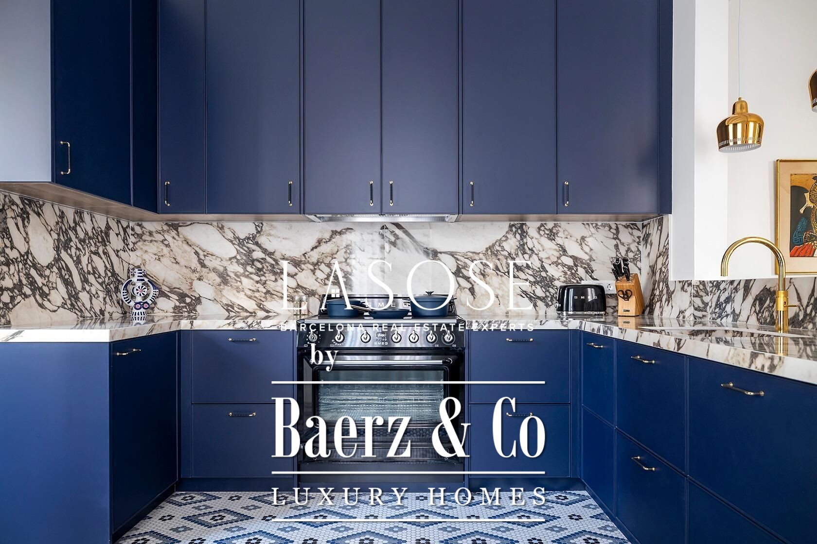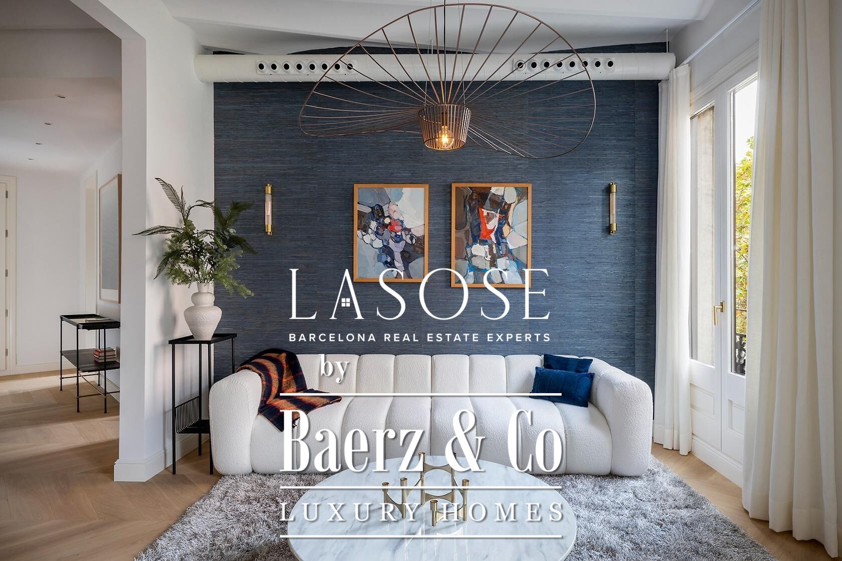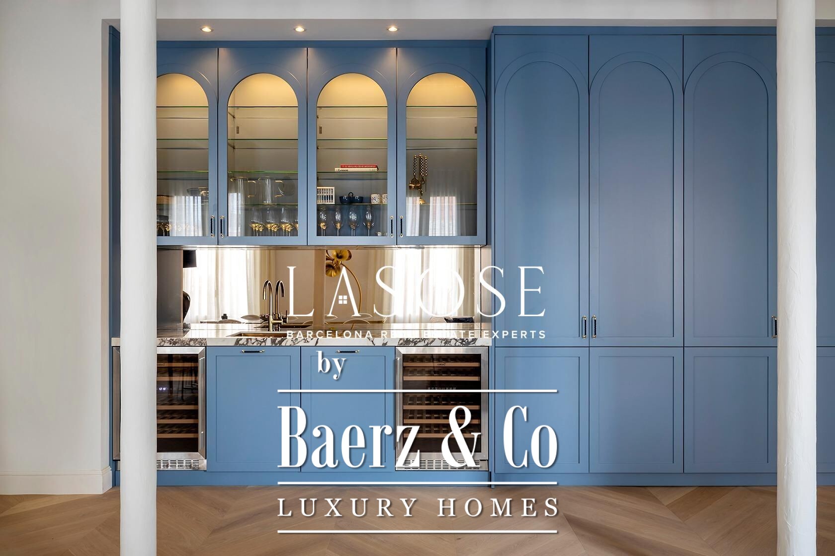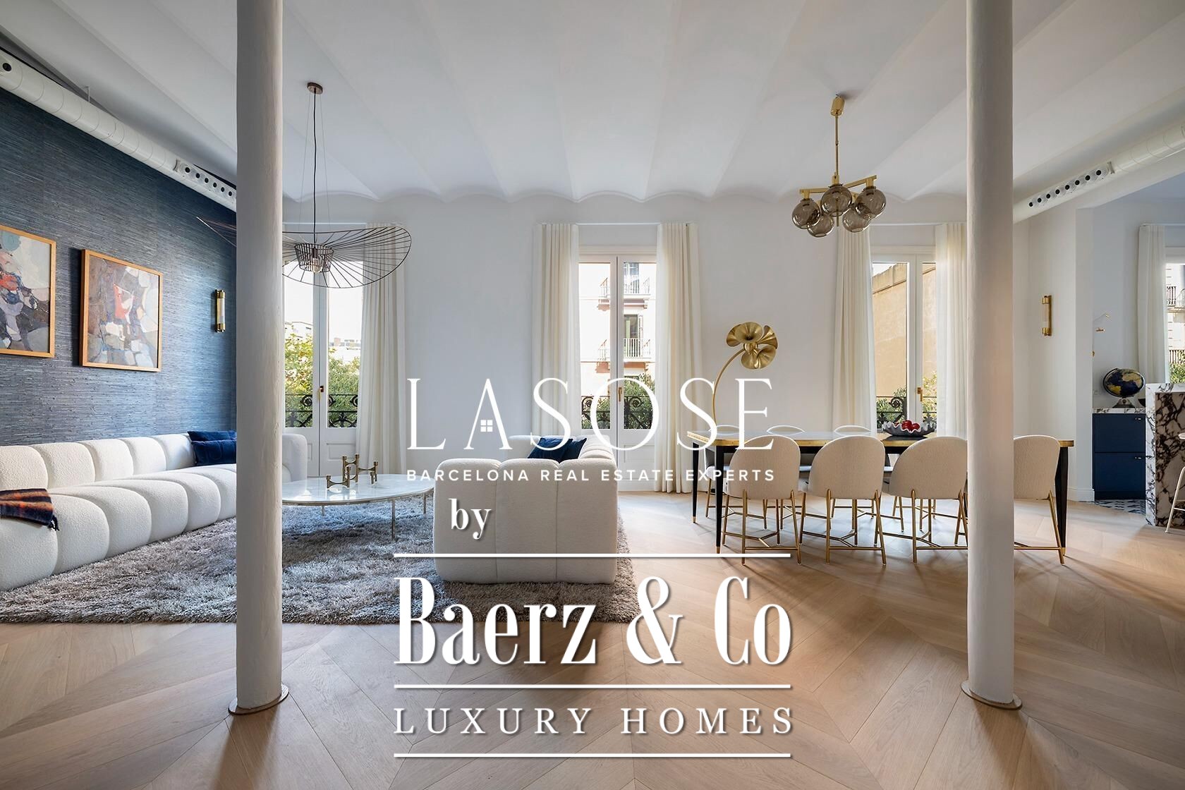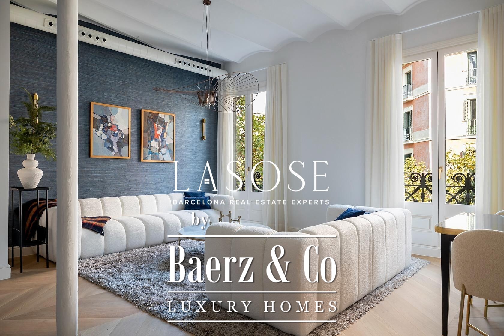 Appartement Barcelona nodigt uit tot verfijnd stedelijk wonen. Deze woning van 199 m² op de derde verdieping is recent gerenoveerd en zorgvuldig ontworpen om optimaal gebruik te maken van het natuurlijke licht; vier balkondeuren aan de Calle Girona en royale ramen versterken de lichte sfeer. De indeling verloopt vloeiend van de open keuken en eetruimte naar een woonkamer, voorzien van een maatwerkbar en bijkeuken met twee wijnklimaatkasten en een tweede vaatwasser.