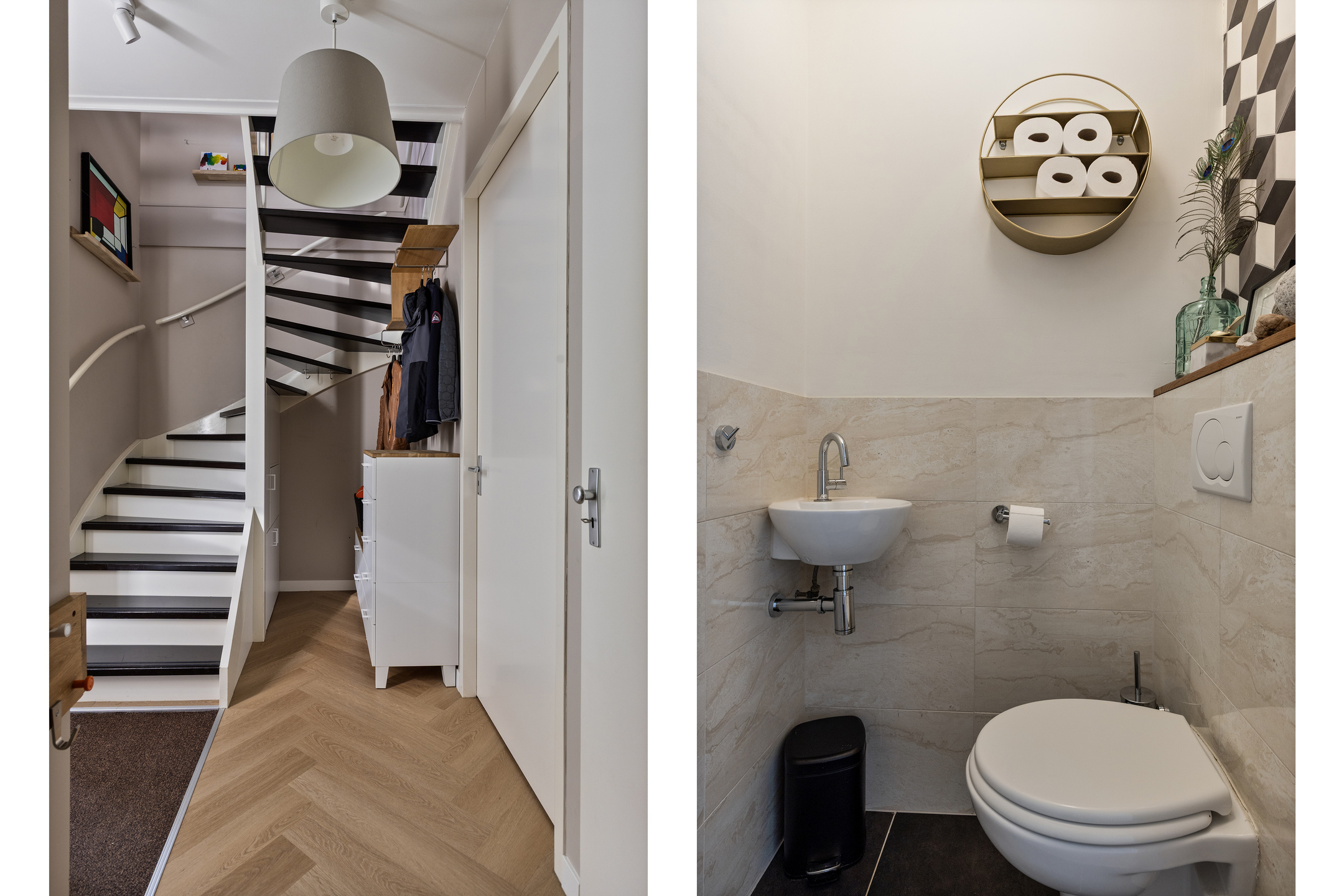 Entree via de hal met modern toilet (voorzien van fonteintje), opbergruimte, trapopgang naar de eerste verdieping en toegang tot de woonkamer met open keuken.