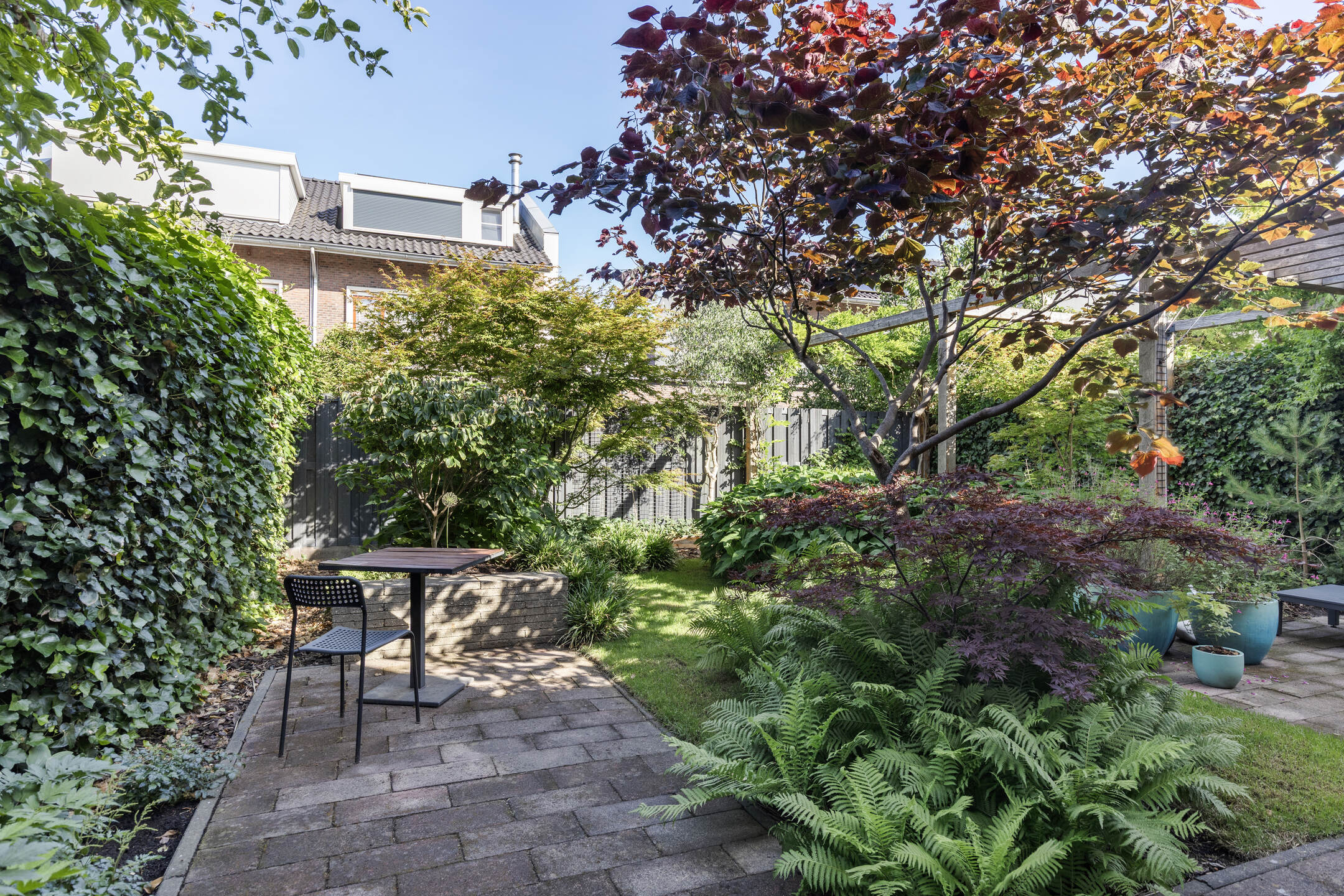 De fraai aangelegde achtertuin is gelegen op het noordwesten, ideaal voor middag- en avondzon.