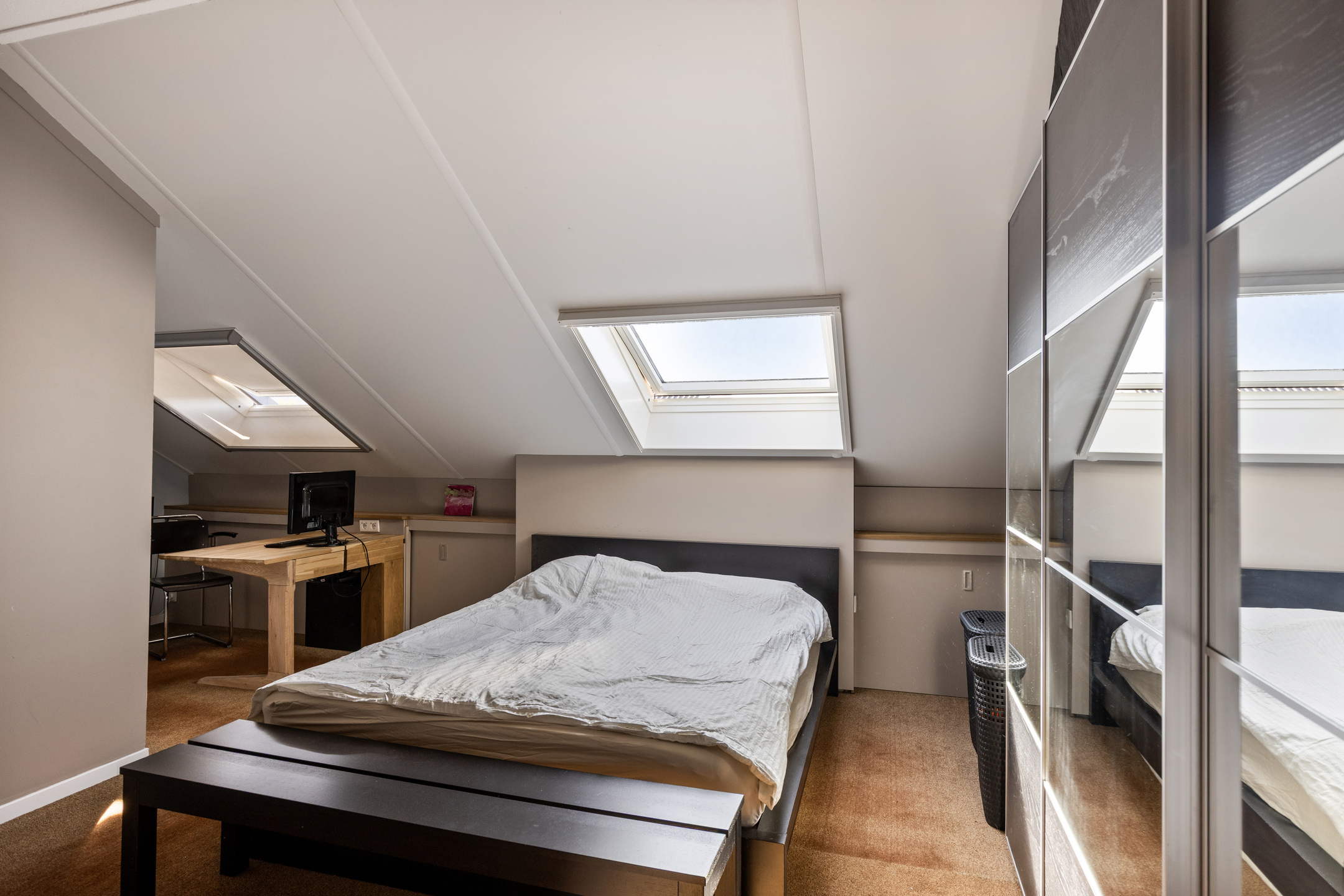 Slaapkamer 3 is aan de voorzijde gelegen, voorzien van twee Velux dakramen en een vaste kast met opstelplaats voor de cv-ketel. Deze kamer beschikt tevens over een eigen badkamer met inloopdouche en wastafelmeubel.