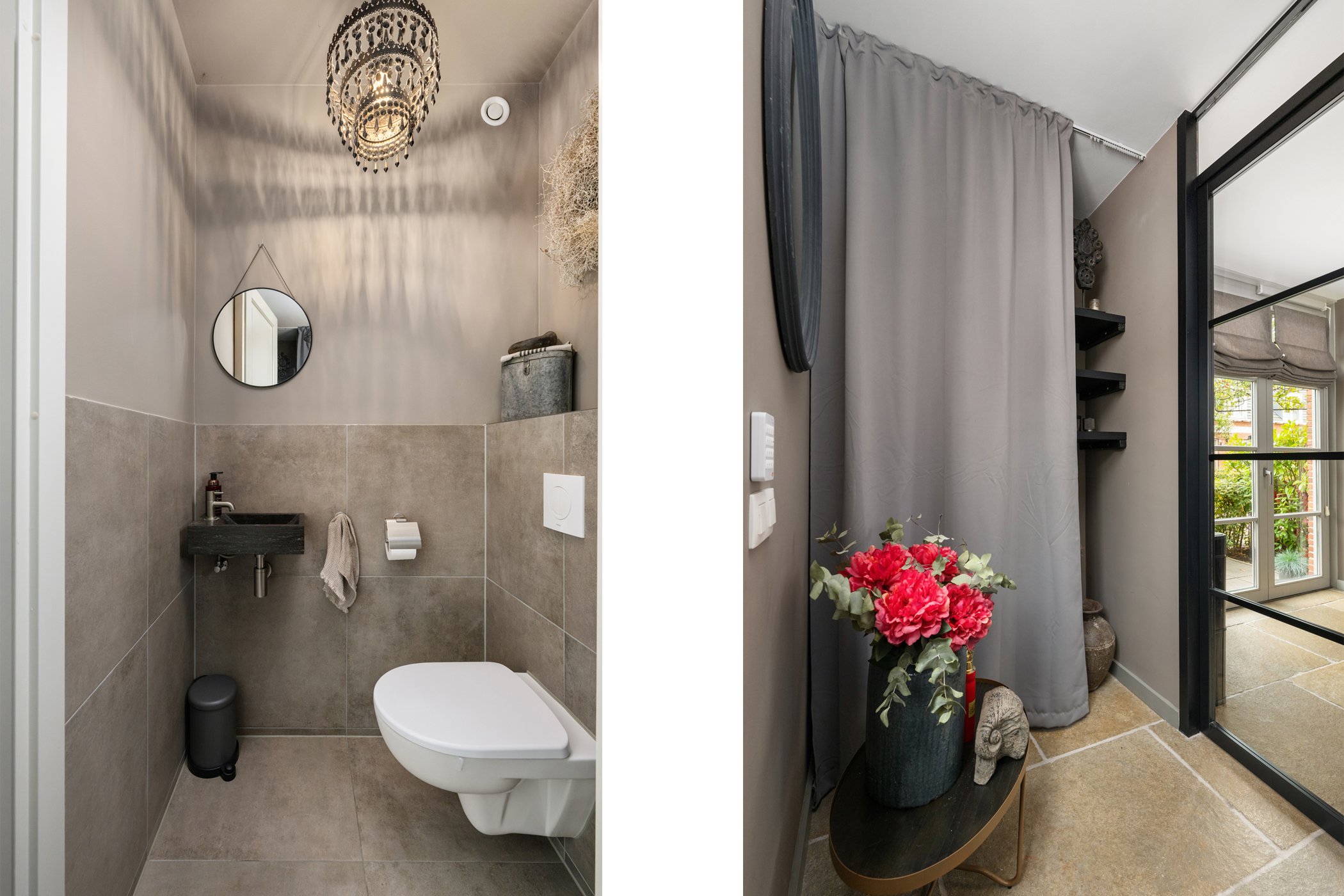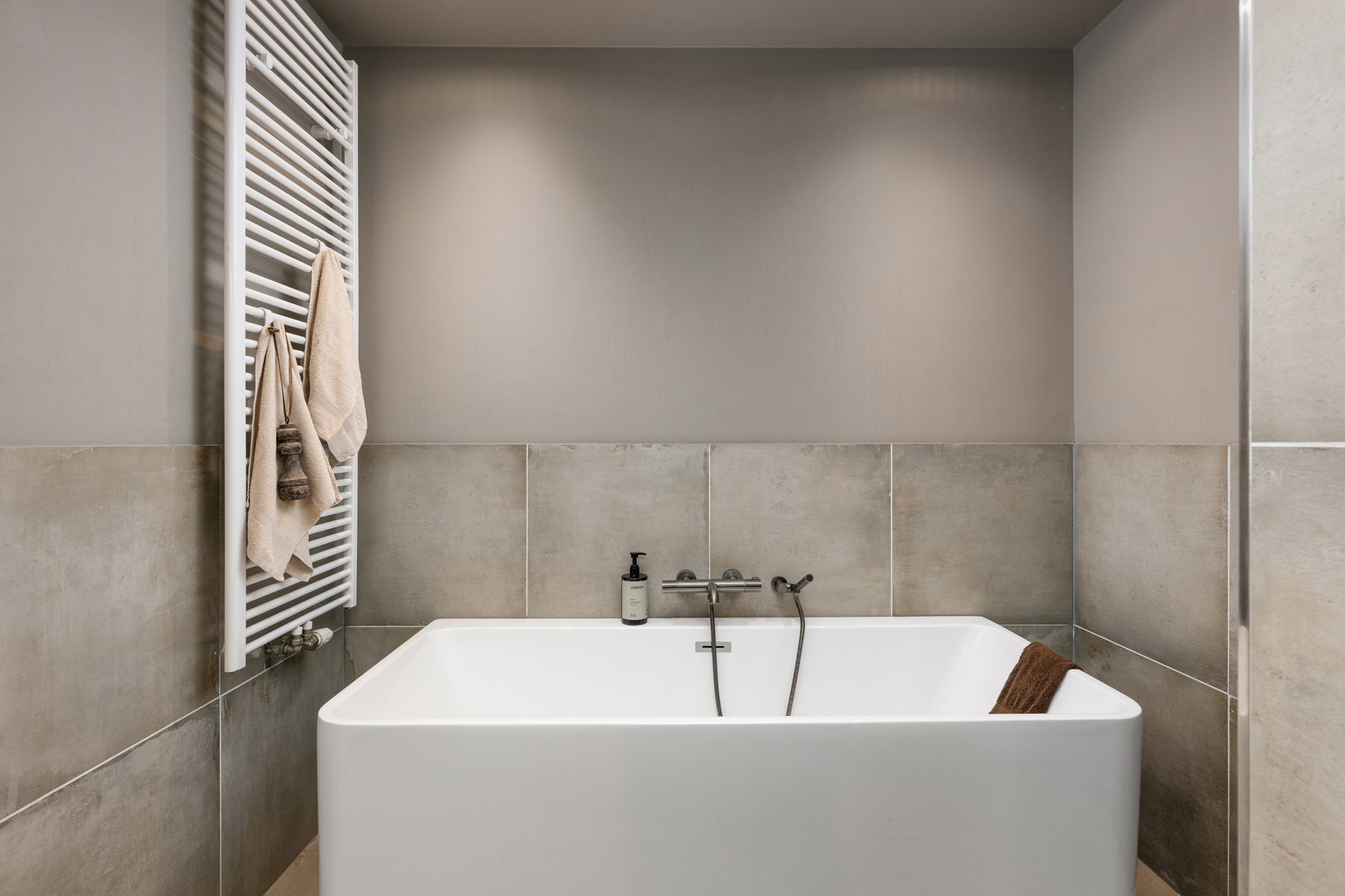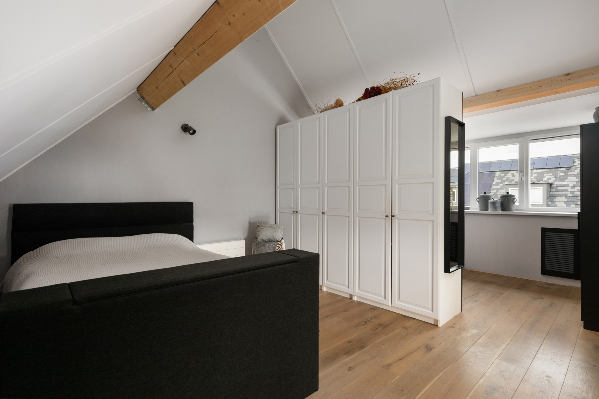 De overloop is voorzien van een houten vloer en geeft toegang tot een de toiletruimte. Aan de achterzijde van de woning bevinden zich twee slaapkamers, aan de voorzijde één slaapkamer. De volledig betegelde badkamer is luxe uitgevoerd met een inloopdouche, ligbad, badkamermeubel met dubbele wastafel, grote spiegel en handdoekradiator.