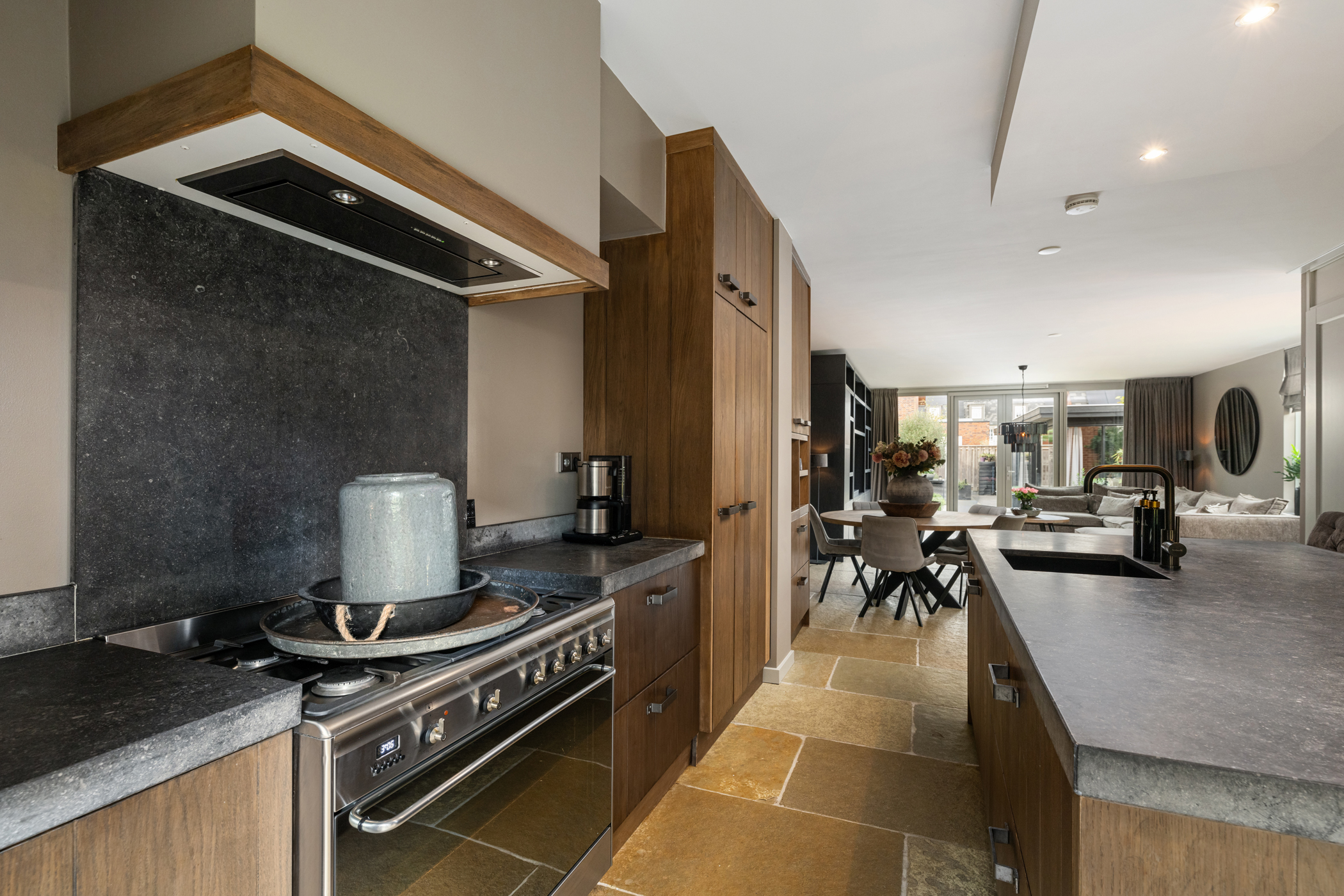 Aan de voorzijde van de woning bevindt zich de moderne keuken met groot kook- en spoeleiland, uitgerust met hoogwaardige inbouwapparatuur zoals een apothekerskast, spoelbak, gasfornuis, afzuigkap, heteluchtoven, koelkast en vaatwasser.