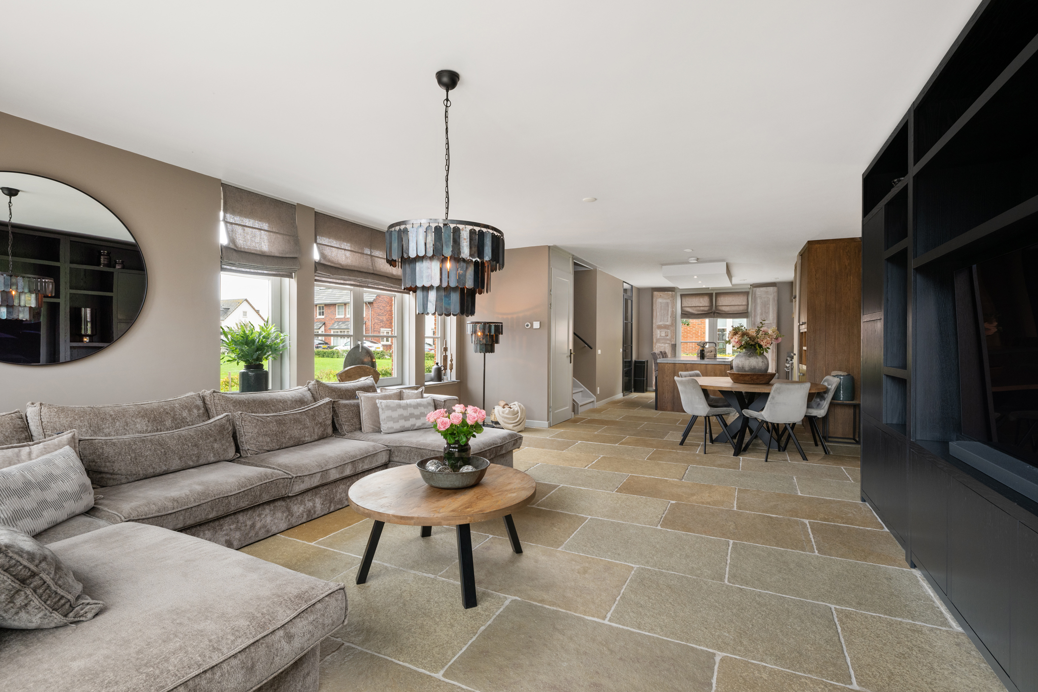 De tuingerichte woonkamer is ruim en licht, afgewerkt met een fraaie Bourgondisch dallen natuurstenen vloer met vloerverwarming. De trap naar de eerste verdieping bevindt zich in de woonkamer en de trapkast is praktisch ingericht als extra garderobe. Openslaande deuren bieden toegang tot de diepe achtertuin, compleet met overkapping en vrijstaande houten berging.