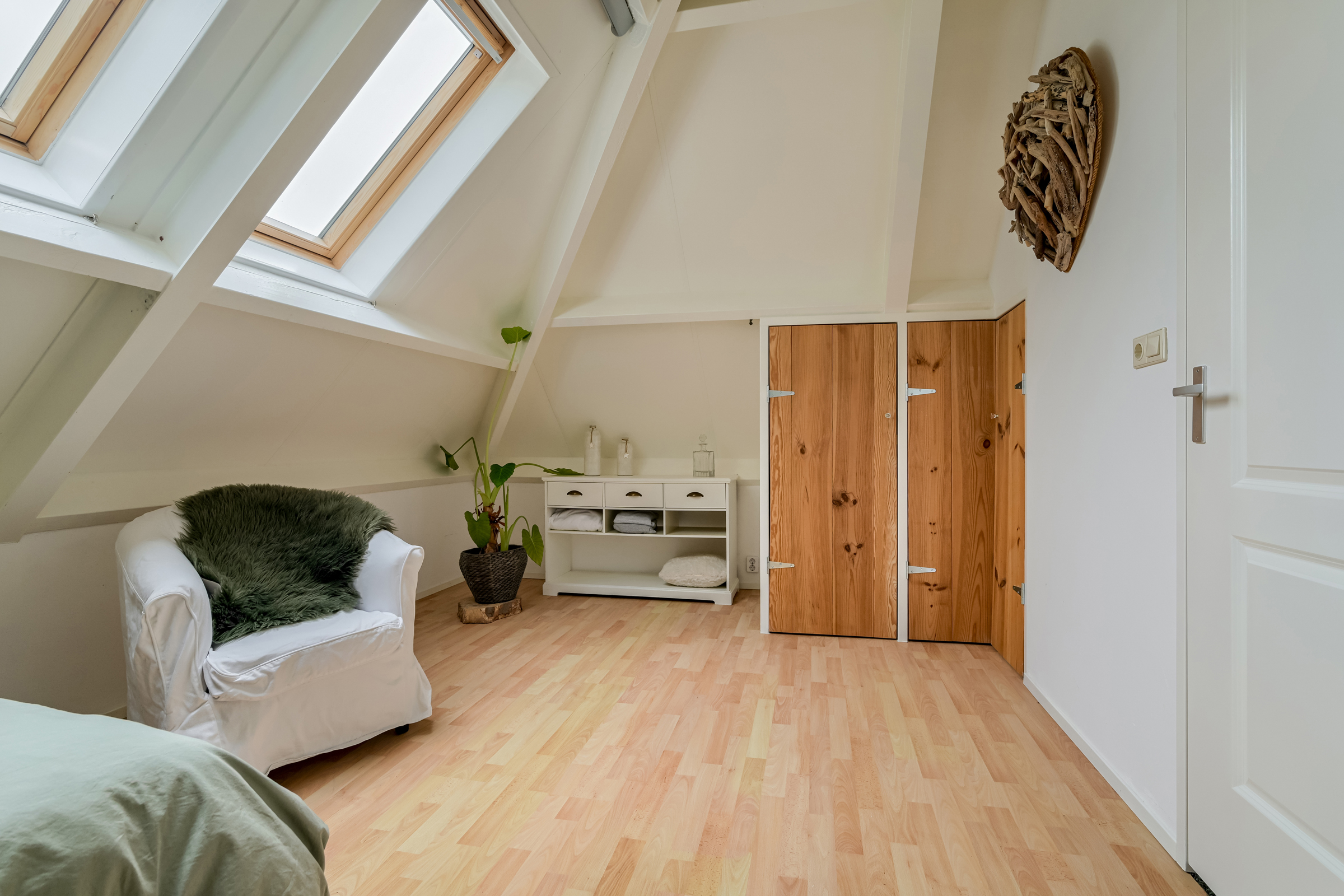 Zijslaapkamer met 2 Velux dakvensters en 2 vaste kasten. Vanuit deze kamer toegang tot een berging waarin de HR cv-combiketel (ca. 2018) en mechanisch ventilatiesysteem-unit geplaatst zijn.