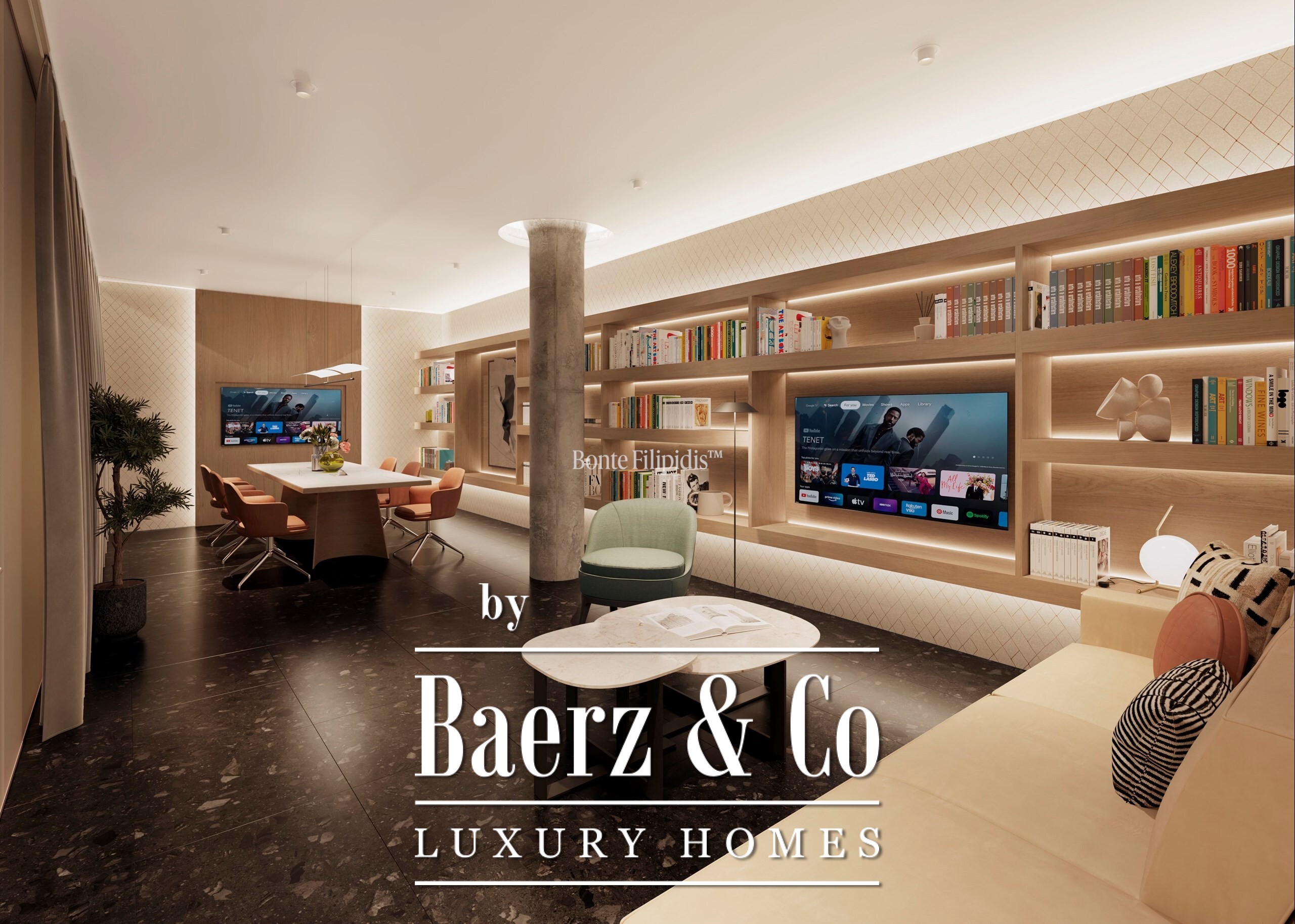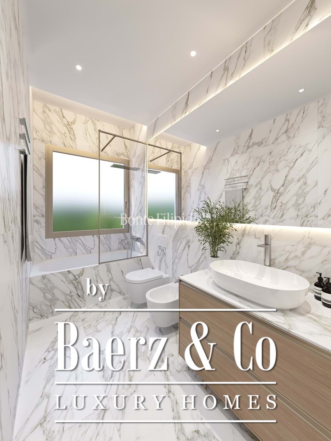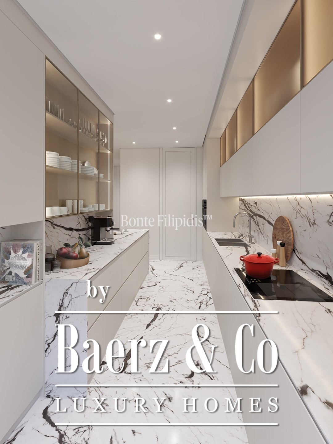 De indeling scheidt sociale van privéruimtes; de royale woon- en eetkamer zijn rijk aan daglicht en lopen direct uit op het terras. De volledig uitgeruste keuken is voorzien van geïntegreerde apparatuur, marmeren werkbladen en maatwerk kasten, wat functionaliteit en ingetogen elegantie garandeert. Twee slaapkamers met eigen badkamer zijn zodanig gepositioneerd dat ze optimale privacy bieden. Daarnaast is er een gastentoilet, eveneens afgewerkt met marmer en moderne details.