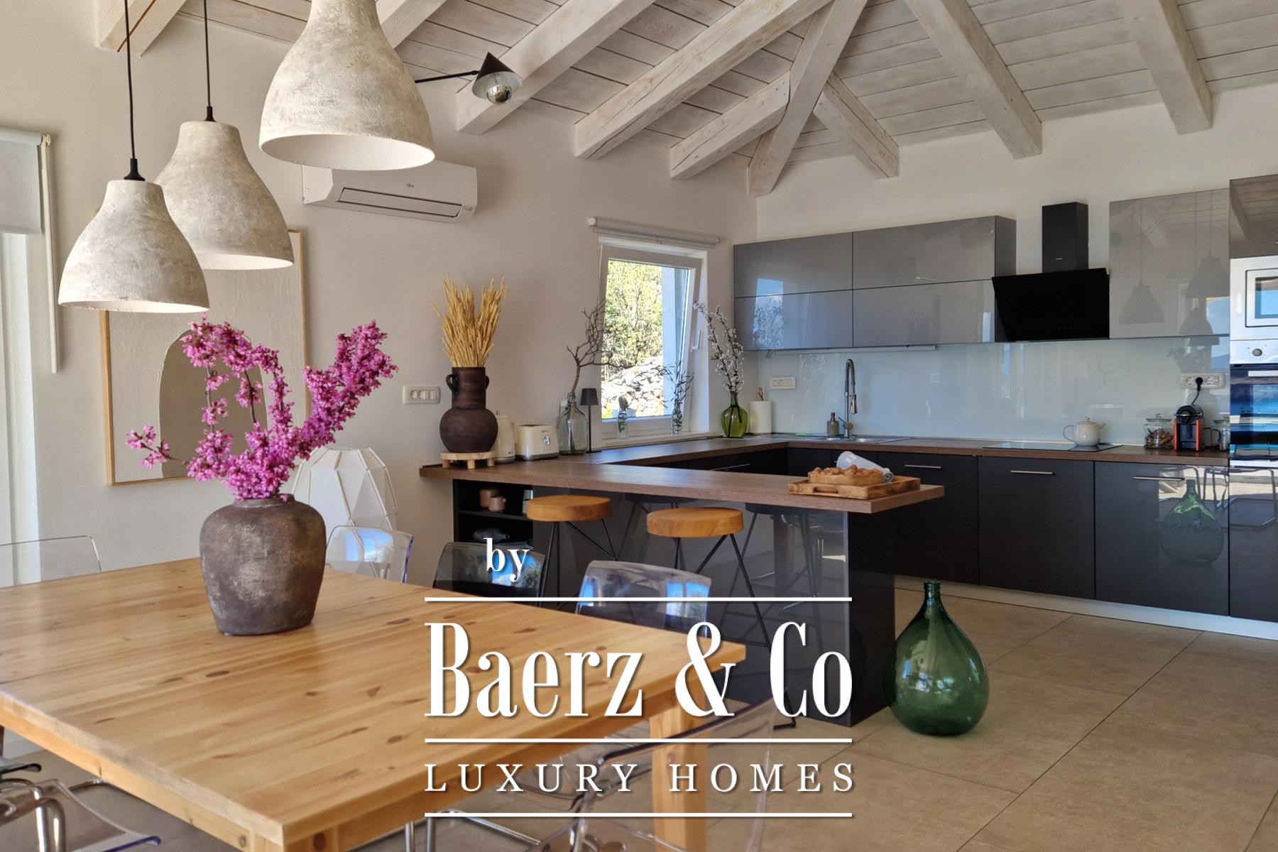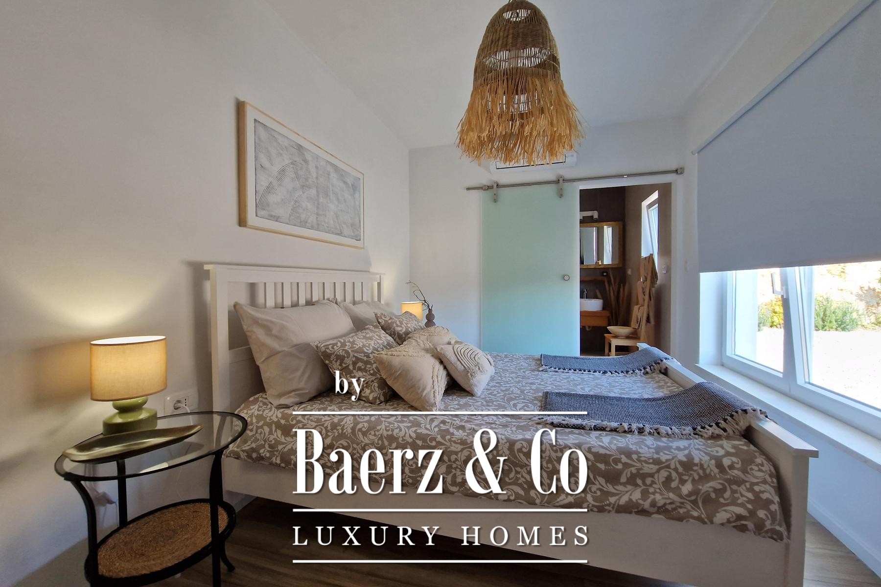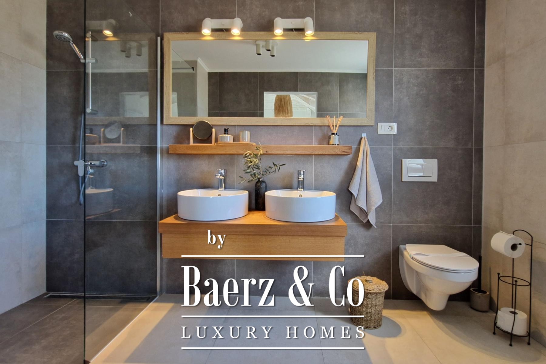 Bij binnenkomst zijn er drie slaapkamers, elk met een eigen en-suite badkamer. De badkamers beschikken over vloerverwarming en de gehele villa is voorzien van airconditioning. Het interieur balanceert zorgvuldig tussen rustiek karakter en moderne luxe, met een royale woonkamer met open haard, een volledig uitgeruste keuken en een eetruimte die uitkomt op een overdekt terras van 36 m². Een extra gastentoilet en een technische ruimte van 14 m² bieden praktische verfijning.