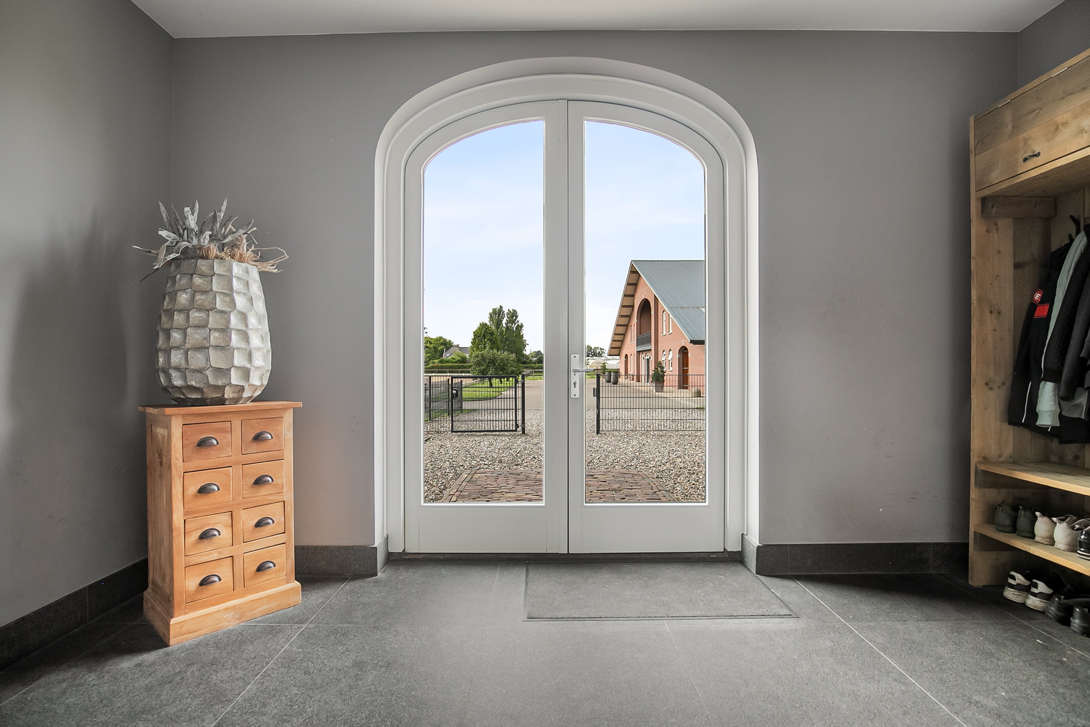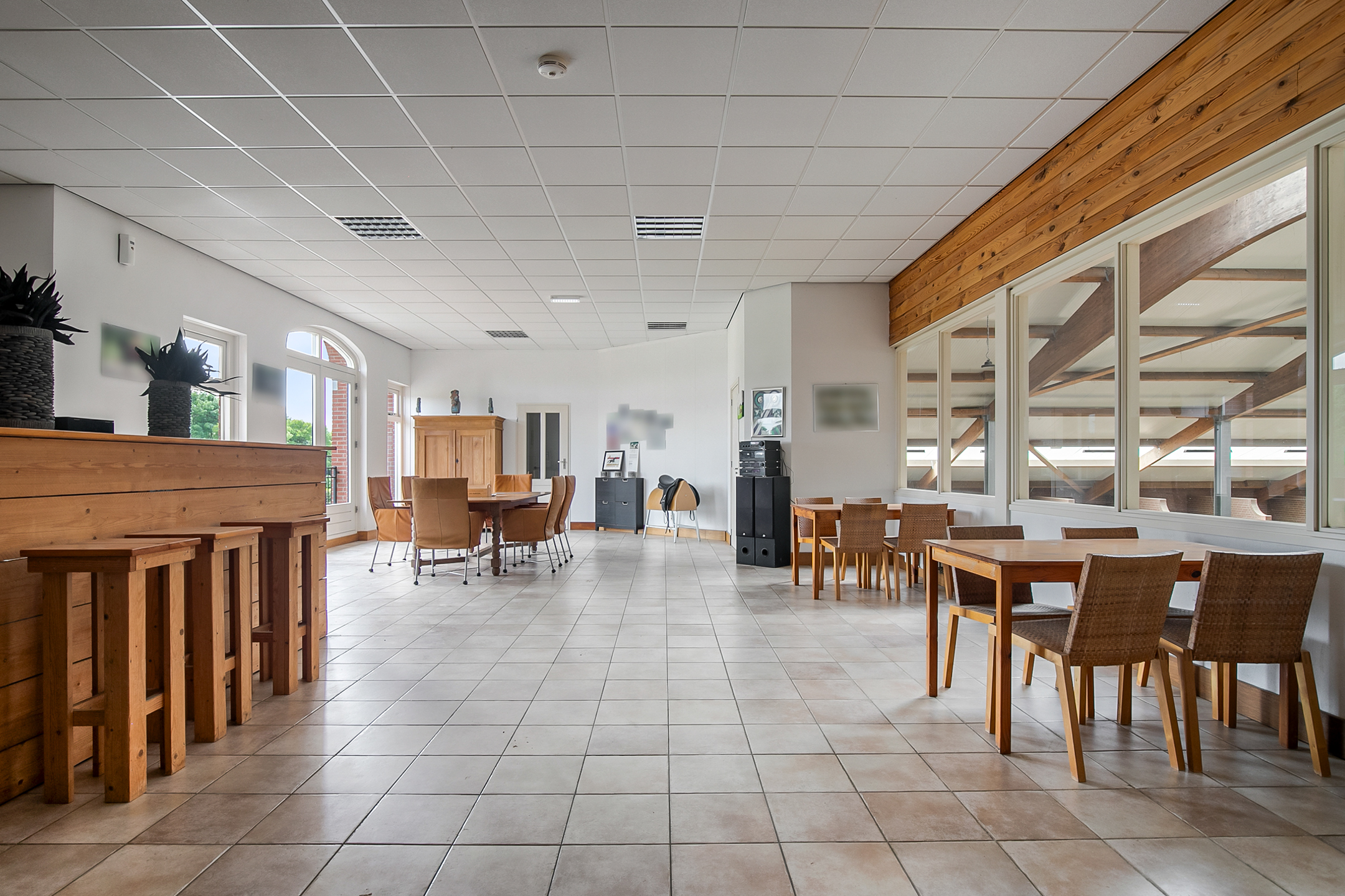 De hal aan de voorzijde van de rijhal is voorzien van een beklinkerde vloer en biedt toegang tot een berging, toiletruimtes, wasruimte en een winkelruimte. Een bordestrap biedt toegang tot de 1e verdieping. Hier is de ontvangstruimte en een appartement gesitueerd. De ontvangstruimte is voorzien van een tegelvloer, stucwerk wanden en een systeemplafond. Er is een keukenblok en een bar aanwezig. Openslaande deuren bieden toegang tot een balkon aan de voorzijde van de rijhal. Grote raampartijen bieden een fraai uitzicht op de binnenpiste en de stallen. Ook is er vanuit de ontvangstruimte toegang tot een balkon boven de binnenpiste.Het appartement is uitgerust met een woonkamer met open keuken, 2 slaapkamers en een ruime badkamer. Het appartement is voorzien van een tegelvloer. Het keukenblok beschikt over een spoelbak, inductiekookplaat, vaatwasser, koelkast en een combimagnetron. De badkamer is geheel betegeld en verder voorzien van een doucheruimte, wastafel met meubel en een zwevend toilet. Achter een praktische schuifwand is een wasruimte gesitueerd. De binnenpiste (ca. 21x61 mtr.) is voorzien van een professionele bodem (Ben Agterberg), een fraaie hardhouten bakrand. Gewelfde houten spanten zorgen voor extra sfeer. Een lichtstraat in de nok zorgt voor fraai natuurlijke lichtinval. Ook is er LED-verlichting aanwezig. De 39 paardenboxen zijn verdeeld over twee stallengangen. De boxen zijn voorzien van deels hardhouten / deels gegalvaniseerde voorwanden en metselwerk tussen- en achterwanden. De deuren van de boxen zijn draaibaar. De boxen zijn tevens uitgerust met een buitenluik. Iedere stallengang beschikt over eigen faciliteiten zoals wasplaatsen en een zadelkamer. Tussen de gangen zijn nog drie ruime loopstallen gesitueerd. De wasplaatsen zijn voorzien van een warm- en koud watervoorziening. Ook is er een plaats voor de hoefsmid en fysio aanwezig. Aan de achterzijde is nog een appartement gesitueerd. Middels een bordestrap aan de buitenzijde is er toegang. Hier is tevens een balkon gesitueerd. Het appartement beschikt over een ruime woonkamer met open keuken, 3 slaapkamers, een ruime badkamer, een bijkeuken, wasruimte en een toiletruimte.Aan de achterzijde van het perceel is een vrijstaande veldschuur gesitueerd. De schuur is opgetrokken uit metselwerk plinten met damwand gevels en het geisoleerde dak is met sandwichpanelen gedekt. Aan de voorzijde is de veldschuur voorzien van windbreekgaas. In de schuur is een voersilo aanwezig. Er zijn momenteel 14 paardenboxen en een longeercirkel gesitueerd, maar uiteraard is deze schuur geheel naar wens ook uitermate geschikt voor diverse andere doeleinden.