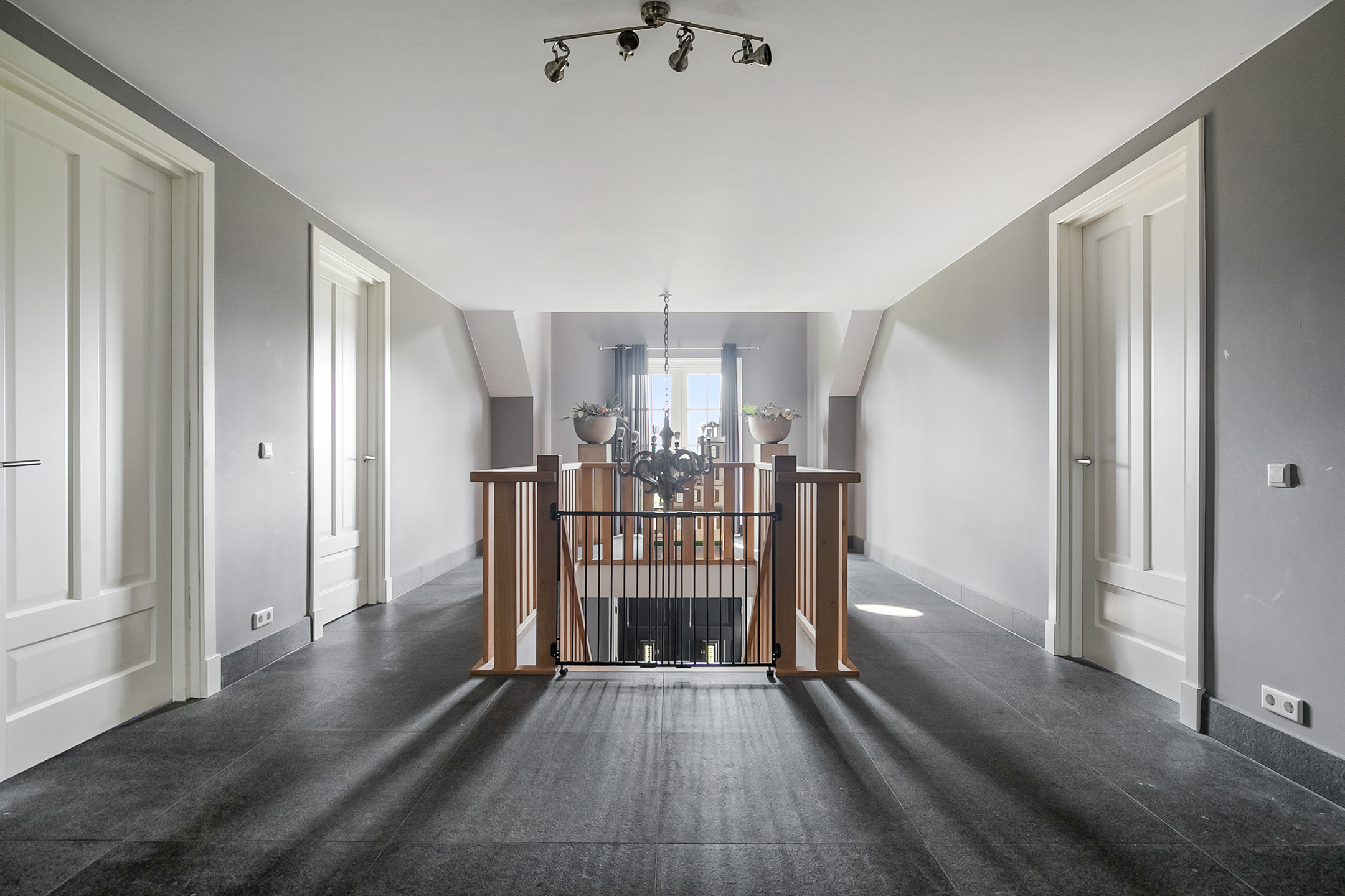 De royale overloop met vide biedt toegang tot 3 ruime slaapkamers, de badkamer, toiletruimte en de zolder. Ook is er toegang tot een charmant Frans balkon welke een fraai uitzicht biedt op de omgeving. De overloop en alle slaapkamers hebben dezelfde afwerking, natuurstenen vloer, stucwerk wanden en een stucwerk plafond.