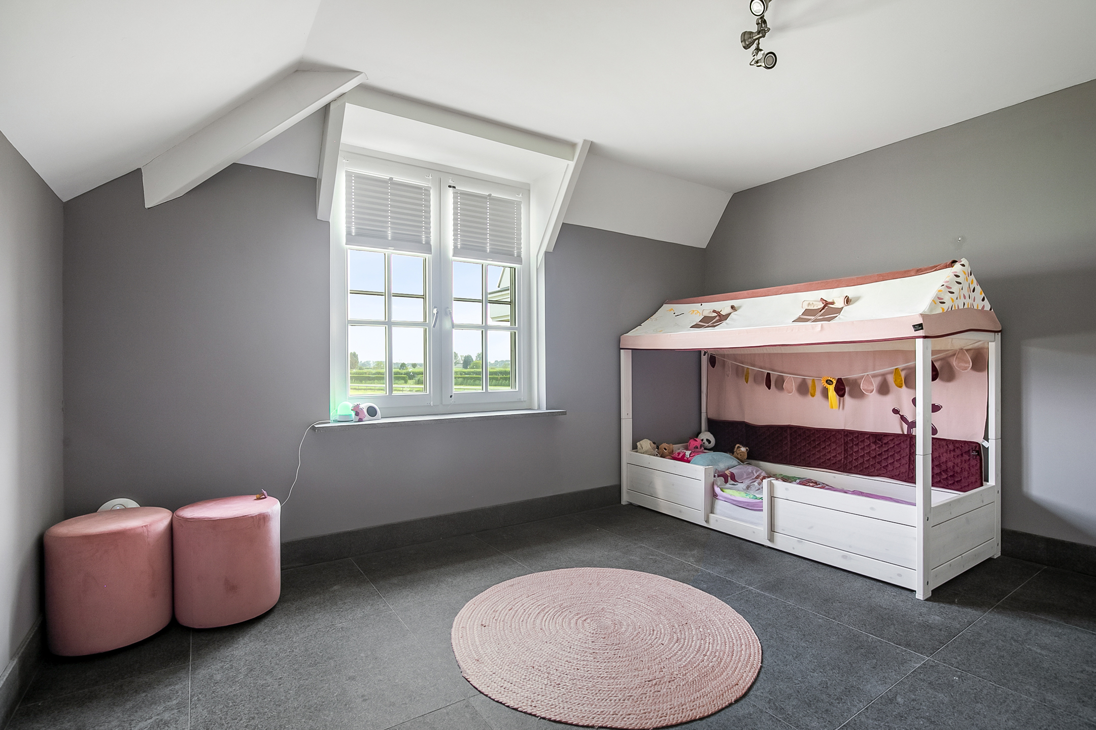 Deze masterbedroom is uitgerust met praktische vaste kastenwand, welke zorgt voor veel opbergruimte. Een raampartij zorgt ook hier voor natuurlijke lichtinval.