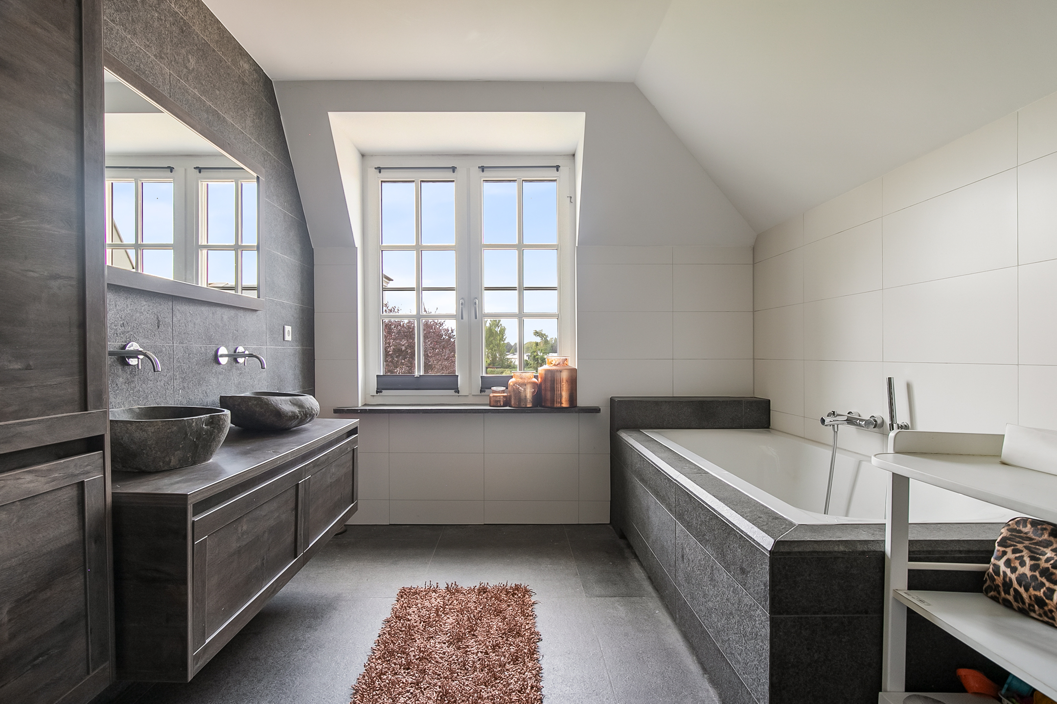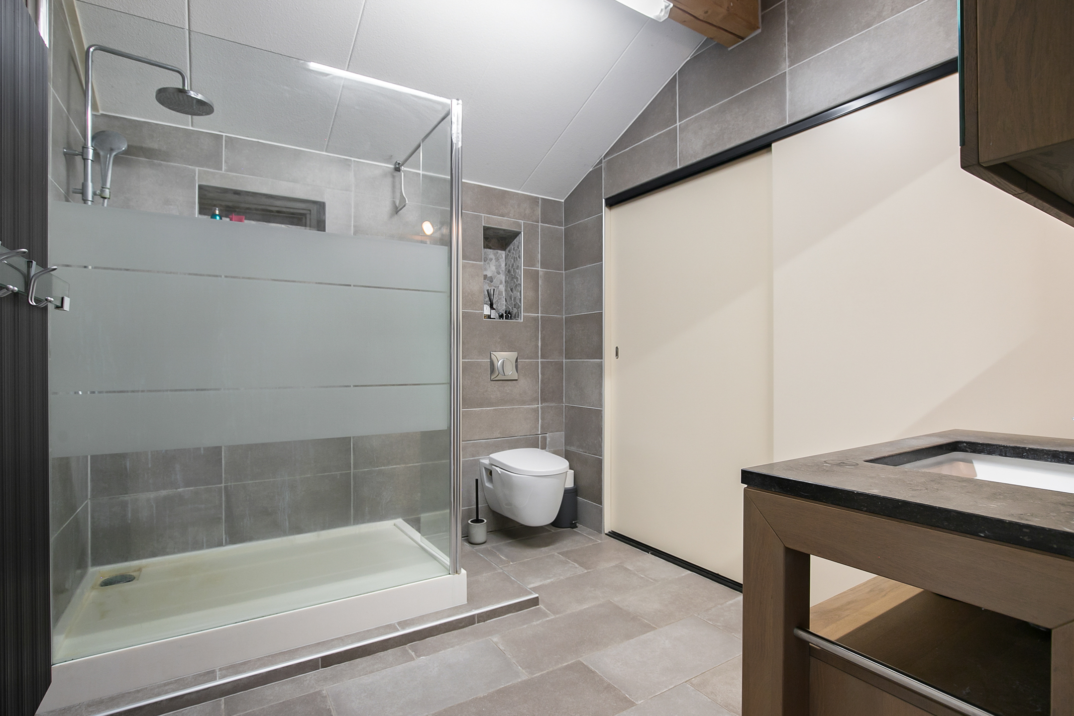 Vanuit de woonkamer is er toegang tot de logeerkamer. Deze slaapkamer is voorzien van een natuurstenen vloer, stucwerk wanden en een stucwerk plafond met inbouwverlichting. Vanuit deze kamer is er toegang tot de badkamer. Deze badkamer is afgewerkt met dezelfde natuurstenen vloer als in de rest van de ruimtes. De wanden en het plafond zijn voorzien van stucwerk. De badkamer is verder uitgerust met een ruime inloopdouche met sunshower, twee wastafels met meubel een zwevend toilet en een design radiator. Een raampartij zorgt voor natuurlijk lichtinval. Vanuit de badkamer loop je verder naar de masterbedroom.