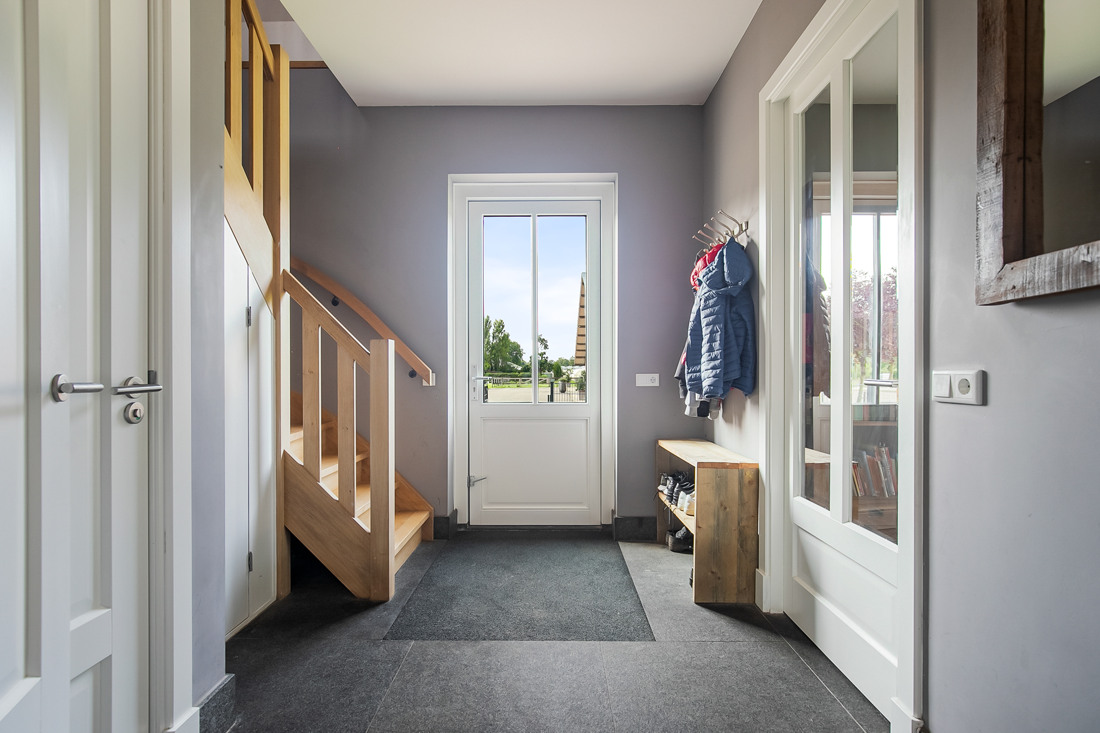 De overdekte entree met een dubbele openslaande voordeur, geeft deze villa een fraaie uitstraling. De ruime ontvangsthal met imposante houten trap biedt toegang tot de woonkamer en de 1e verdieping. De hal is voorzien van een natuurstenen tegelvloer, stucwerk wanden en een stucwerk plafond. De royale leefkeuken met eetkamergedeelte is voorzien van een natuurstenen tegelvloer, stucwerk wanden en een stucwerk plafond met inbouwverlichting. De keuken beschikt over een inrichting in een wandopstelling met apparatenwand en een kook- en spoeleiland. De apparatenwand is verder uitgerust met een oven, koffiezetapparaat, een stoomoven en een koelkast. Het eiland beschikt over een 5-pits gaskookplaat met ingebouwde afzuigkap in het plafond, een spoelbak en een vaatwasser. Diverse kastjes en lades zorgen voor veel opbergruimte. Een grote erker/uitbouw met openslaande deuren zorgen voor toegang naar de tuin. De vele raampartijen zorgen voor veel natuurlijke lichtinval. Een haard zorgt voor extra sfeer en warmte in de ruimte. Vanuit de woonkamer is er een fraai uitzicht op de paardenweides. En ook hier zorgen grote raampartijen en dubbele openslaande deuren voor een zee van licht. Daarnaast is er een prachtige, grote schouw aanwezig met een gashaard welke zorgt voor nog extra sfeer en warmte in de ruimte. Schuifdeuren zorgen dat de woonkamer afgesloten kan worden van de keuken/eetgedeelte. Halfronde openslaande deuren in de zijgevel van de woning zorgen voor toegang tot het voorhuis. De ruime entreehal biedt toegang tot de bijkeuken/wasruimte, woonkamer, toiletruimte en de meterkast. De bijkeuken/wasruimte is uitgerust met een gootsteen. Tevens zijn hier de aansluitingen voor de wasapparatuur gesitueerd. Vanuit hier is er toegang tot de kantoor/werkkamer. De kantoorruimte is een fijne ruimte welke uiteraard voor diverse doeleinden geschikt is, zoals bijvoorbeeld een speelkamer of chillroom.