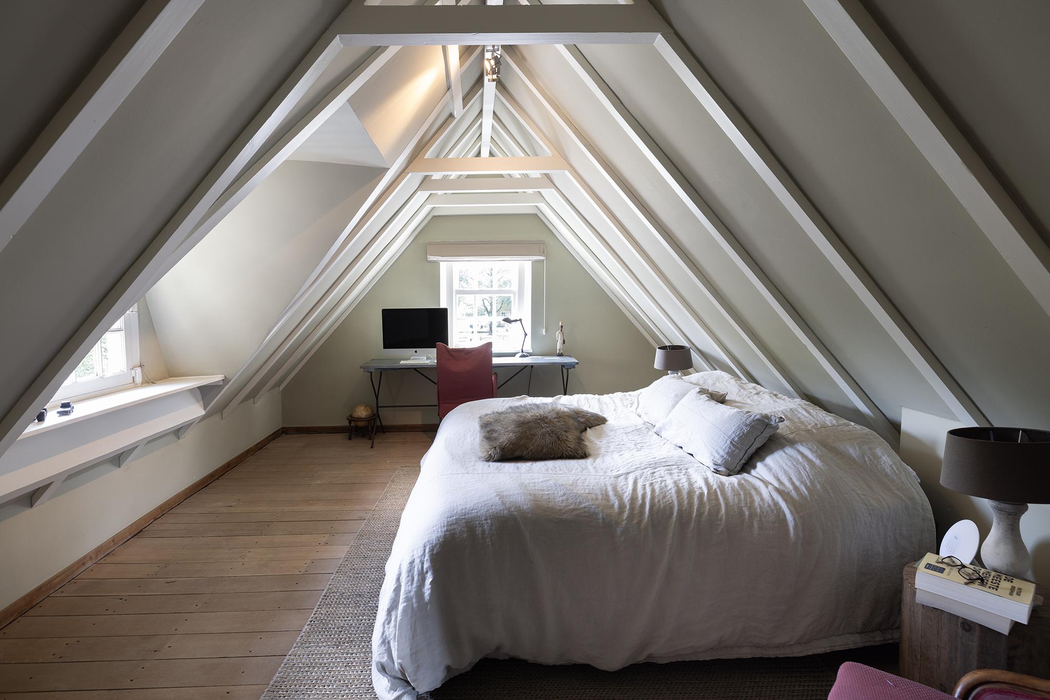De opkamer met uitzicht op de polder is een geweldige werkkamer, voorzien van een grote schouw en een eigen entree. Onder deze kamer bevindt zich één van de twee kelders, nu in gebruik als royale wasruimte. De verdieping biedt nog meer ruimte: 4 slaapkamers, een moderne badkamer, apart toilet en zelfs een bedstee voor wie het knus wil houden.
