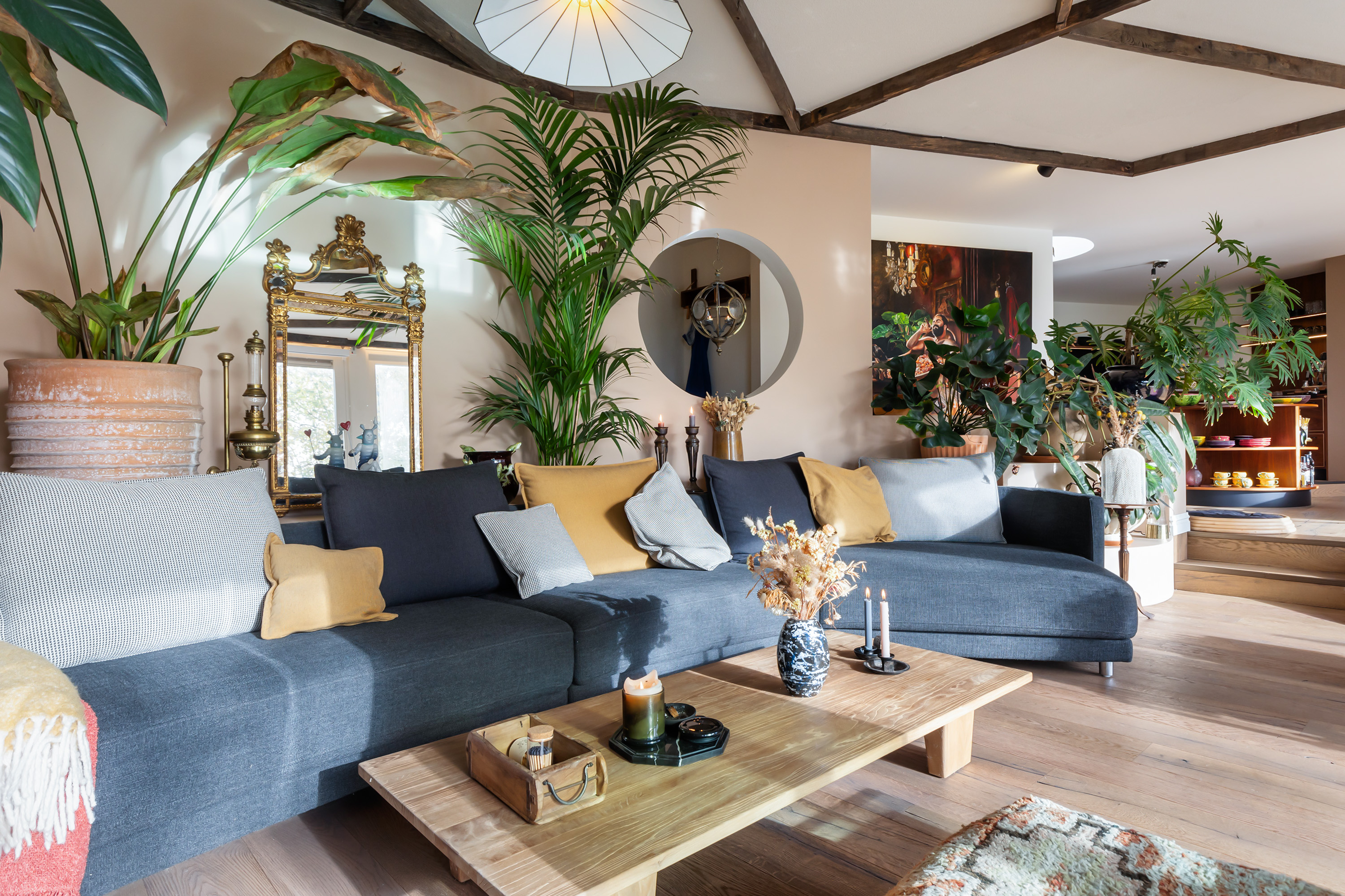 De living met eikenhouten vloer en open haard is licht en ruim dankzij de glazen achtergevel met uitzicht op het terras en de tuin. De maatwerkkeuken, uitgevoerd in walnoot met roestvrijstalen blad en Miele-apparatuur, vormt het hart van de woning.