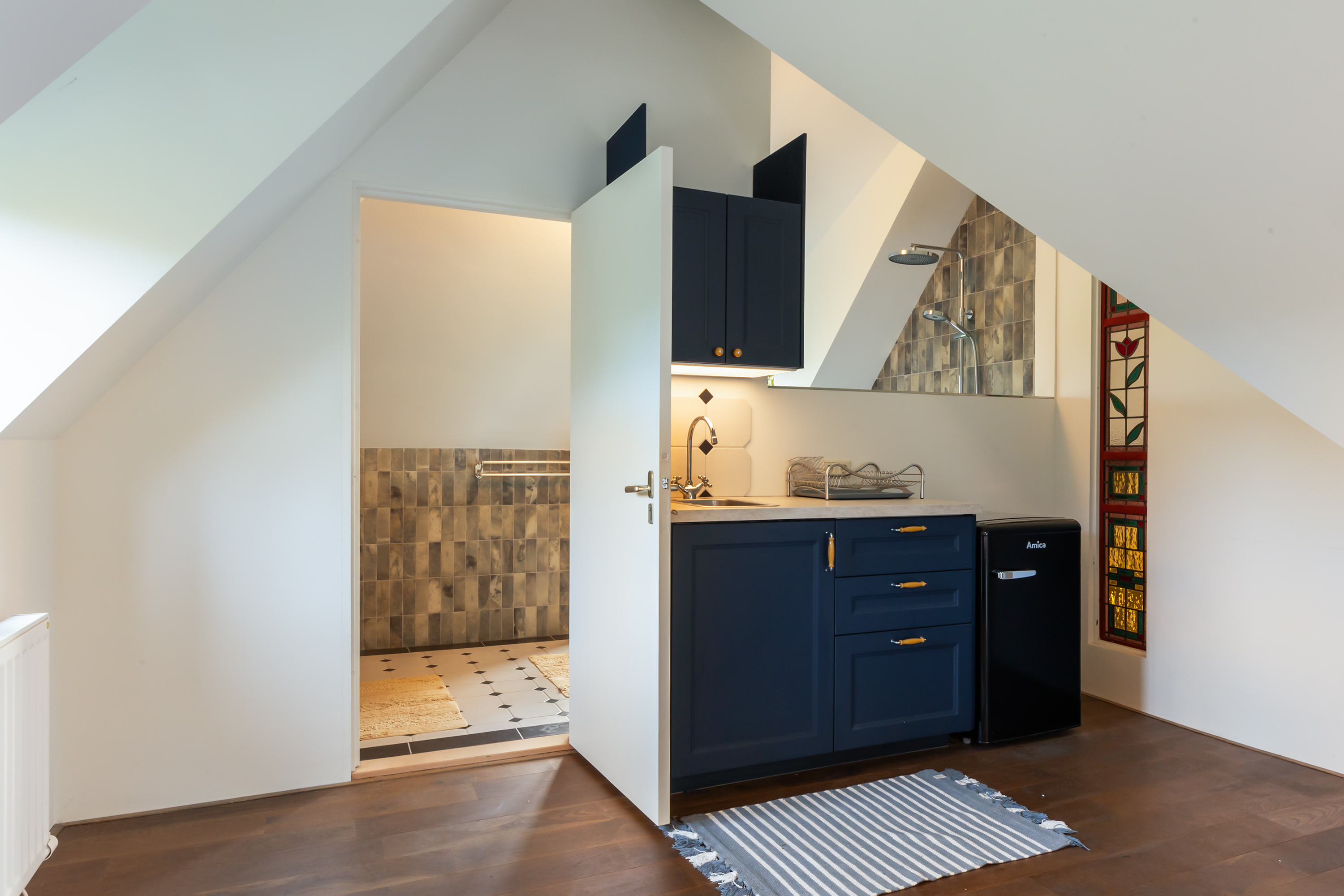 Er is een eigen entree, kantoor, pantry en toiletruimte. De verdiepingsvloer biedt bovendien een sfeervolle logeerruimte met mogelijkheden voor atelier of werkruimte.