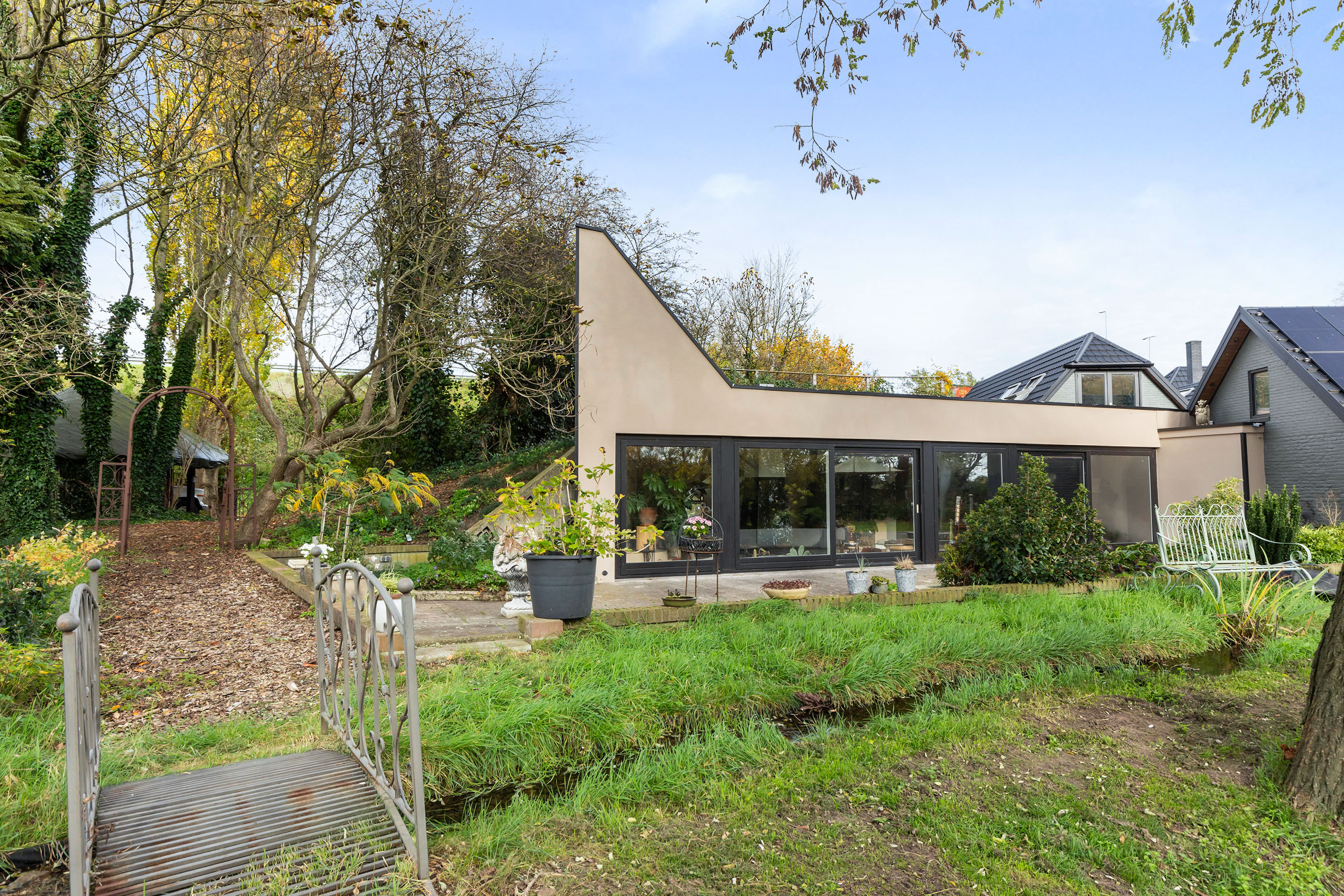 Een romantisch prieel, een kabbelende waterloop met bruggetje en een zwevend vlonderterras met panoramisch uitzicht maken het geheel tot een plek waar natuur en design elkaar ontmoeten.