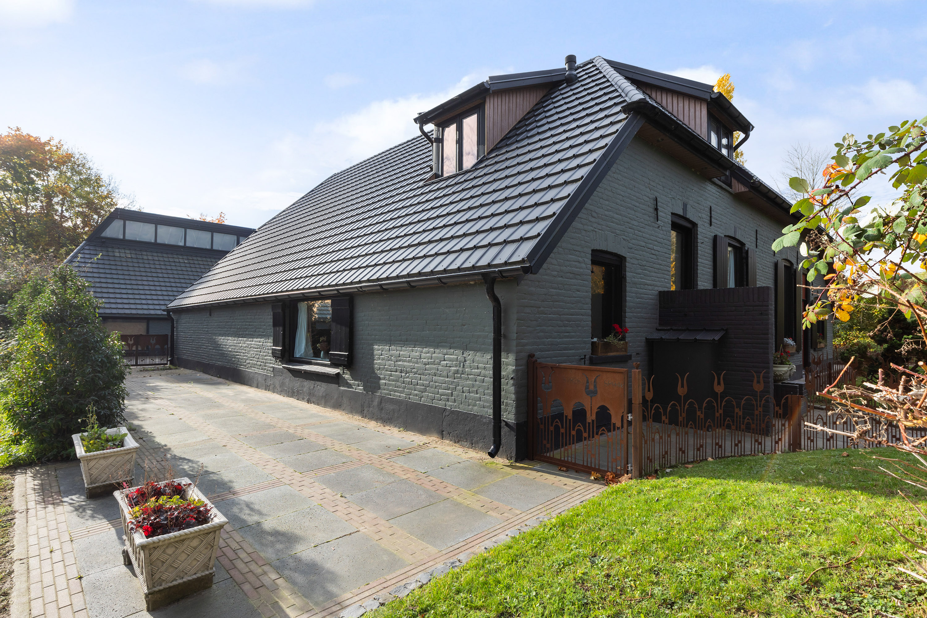 De hoofdwoning, circa 175 m² groot, heeft een markante halfronde voordeur met glas-in-lood en een uitnodigende entree.