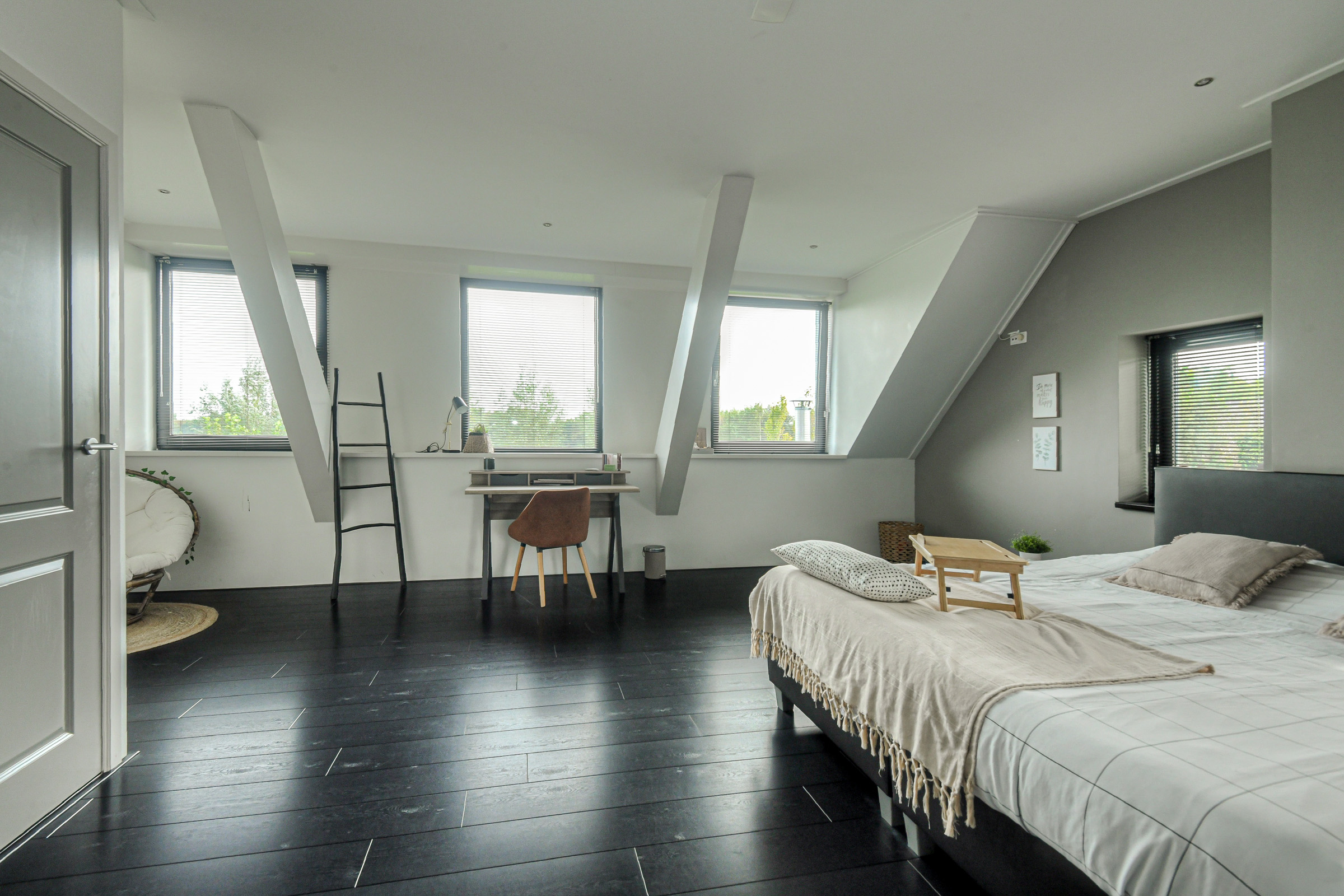 Voorslaapkamer (ca. 6.25 x 2.60/3.50 m), ook in deze kamer is de kapconstructie deels in het zicht gebleven.