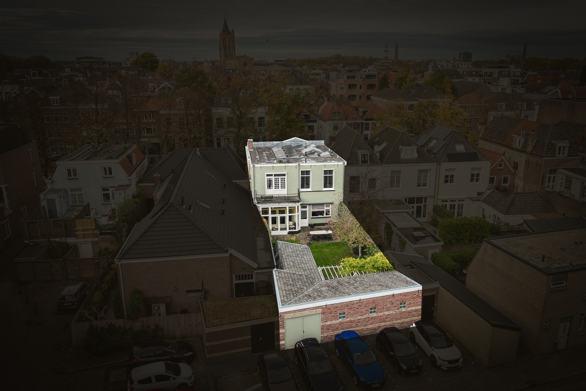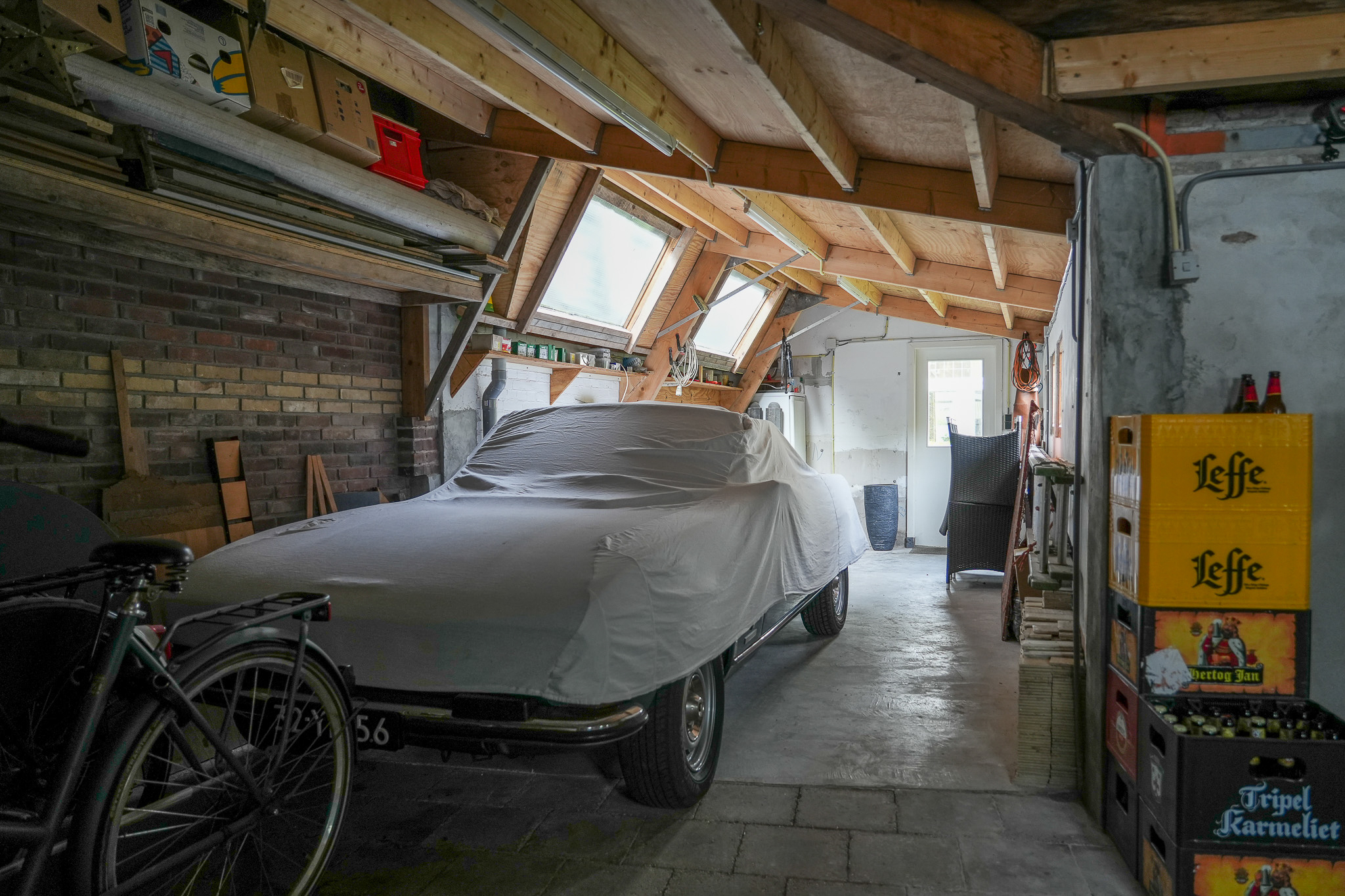 Achter de woning ligt een unieke, 9,5 meter brede en 15 meter diepe tuin op het oosten en zuiden. Er is altijd wel ergens een plekje in de zon of schaduw te vinden. In 2021 hebben de eigenaren het perceel kunnen uitbreiden, waardoor er ruimte ontstond om een groot pannengedekt bijgebouw te bouwen. Deze ruimte van 59 m² leent zich bij uitstek als stallingsruimte voor een oldtimer of boot, dan wel als atelier. De dubbele garagedeuren komen uit op de parkeerplaats direct achter de woning.