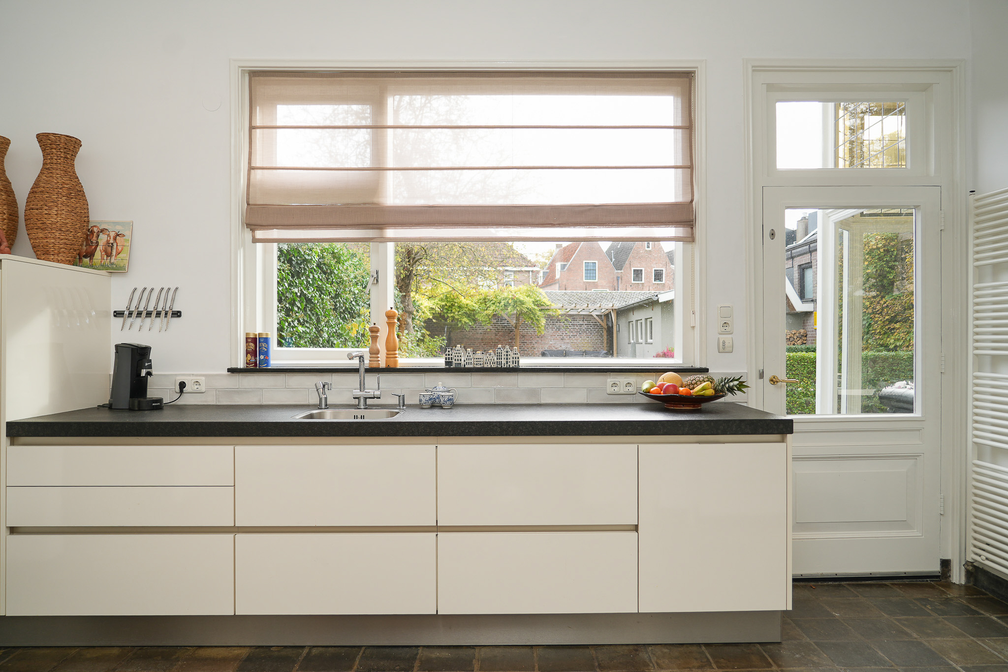 Vanaf het aanrecht is er mooi zicht op de tuin. Er is voldoende ruimte voor een grote eettafel en een brede deur opent naar buiten.