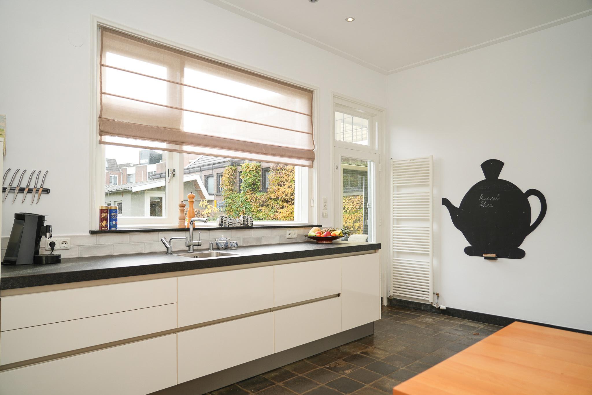 In de fraaie lijstgevel leidt de originele paneelvoordeur naar de vestibule. Deze ruimte heeft een ongekende grandeur, enerzijds door het hoge geornamenteerde stucplafond en anderzijds door het fraaie houtwerk met gaaf bewaard gebleven geëtst glas. De vloer is belegd met marmer en de facettegels op de wanden zijn intact gebleven. In de achtergelegen hal leidt een 19e-eeuwse trappartij naar de verdieping. Vanuit de hal geven prachtige paneeldeuren toegang tot de woonkamer, werkkamer, woonkeuken, kelderkast en het toilet. De vloer is hier belegd met authentieke patroontegels. De woonkeuken is een heerlijk lichte ruimte, ingericht met een Siematic keukenmeubel voorzien van diverse apparatuur en een diep natuurstenen werkblad uit één stuk.