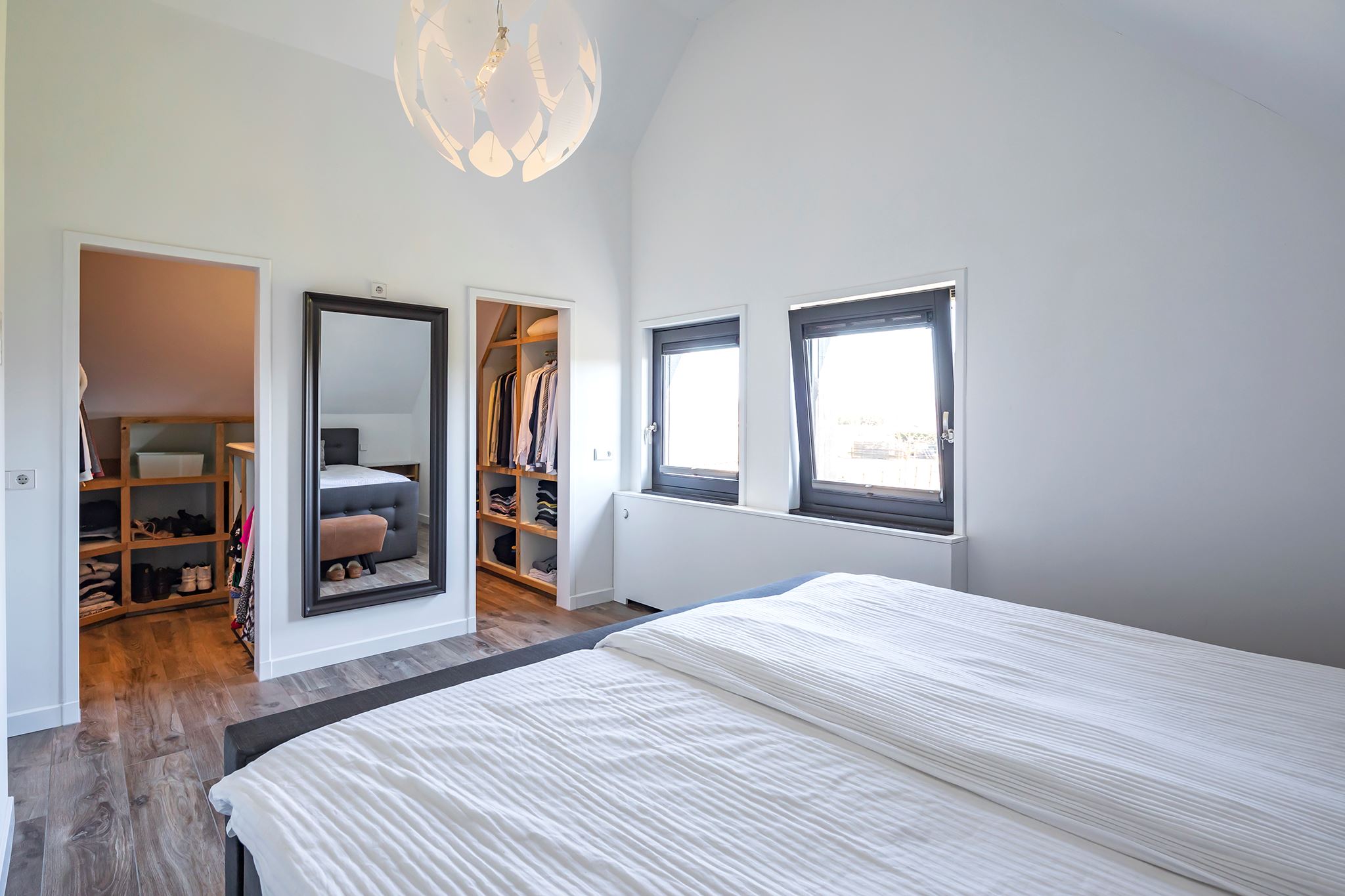 Grenzend aan de overloop liggen de badkamer, de wasruimte, een separate toiletruimte en drie slaapkamers, waaronder de master met een royale inloopkast. Vanuit de ouderslaapkamer heb je een prachtig uitzicht over de tuin.