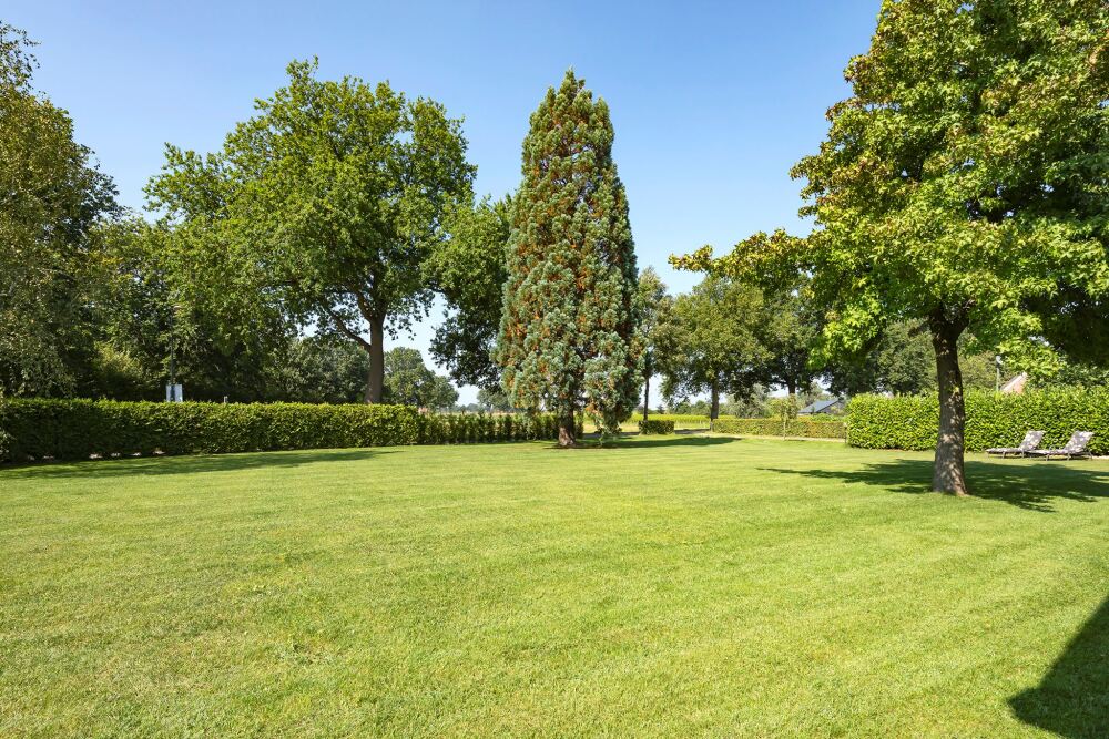 De tuin rondom met diverse volwassen bomen is netjes verzorgd, heeft een groot gazon en een riant overdekt terras. Deze van douglas en eiken hout vervaardigde overkapping is een ware eyecatcher! Je kunt hier heerlijk zitten met het gezin, vrienden, familie. Er is ruimte voor zowel een grote tuintafel als een lounge set. De buiten haard zorgt ervoor dat je hier altijd behaaglijk zit, ook wanneer het iets frisser wordt buiten. De gehele tuin is omheind met een hekwerk.