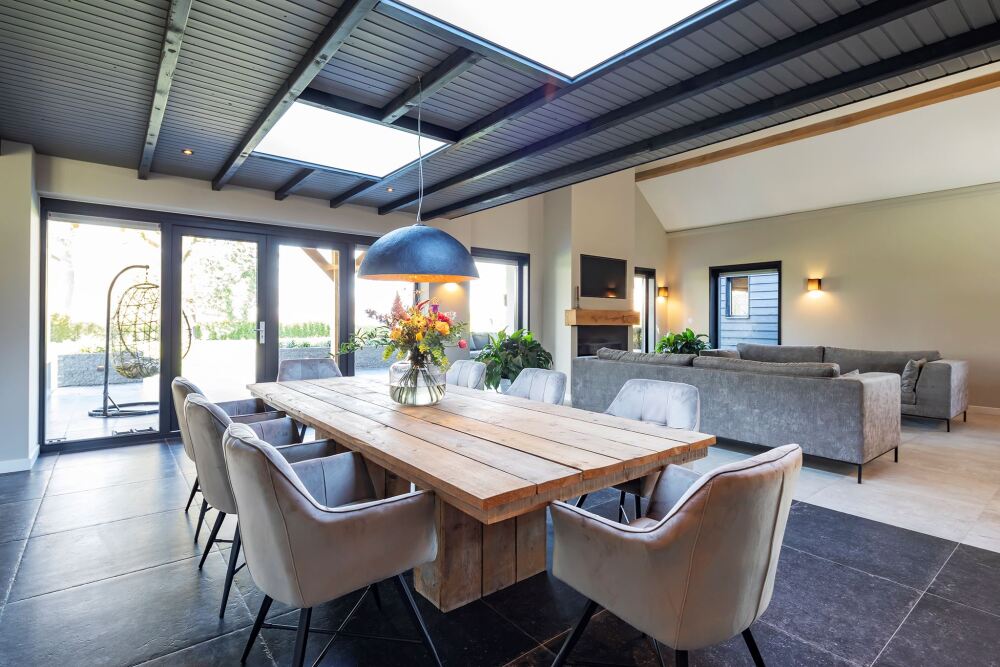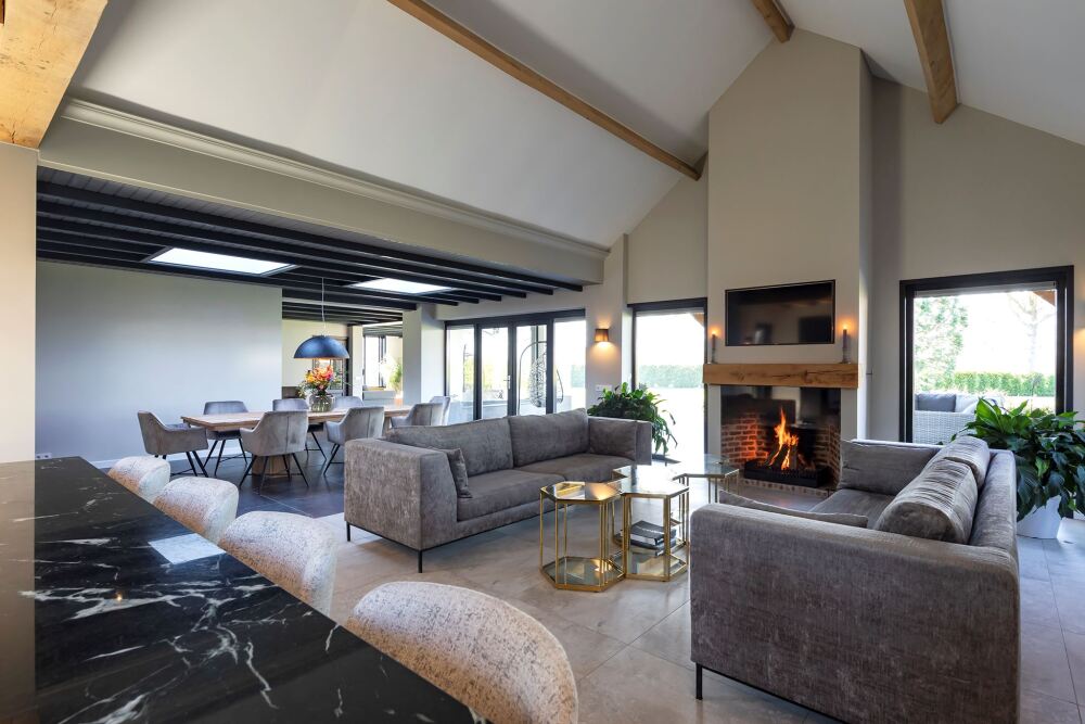 De woonkamer heeft diverse sfeervolle ruimtes waar je heerlijk kunt zitten. De open haard zorgt voor nog meer sfeer en extra warmte in huis. De gehele vloer is overigens voorzien van vloerverwarming. Tussen de woonkamer en de televisieruimte is plaats voor een grote eettafel.