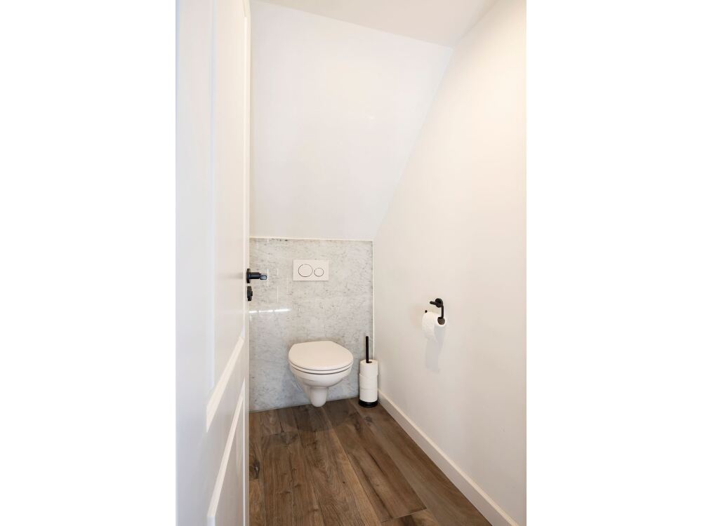 De fraaie badkamer is van alle gemakken voorzien, een hoekligbad, een inloopdouche met hand- en stortdouche en een wandmeubel met dubbele wastafel. Dankzij de grote dakkapel beschikt de badkamer over fijn natuurlijk daglicht en kunt u de ruimte naast mechanisch ook natuurlijk ventileren. De badkamervloer is voorzien van vloerverwarming. Het toilet bevindt zich in een separate ruimte op de overloop.