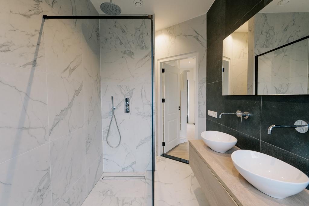 overloop welke toegang geeft tot twee ruime slaapkamers met balkon en de luxe afgewerkte badkamer met inloopdouche, toilet en dubbele wastafel.