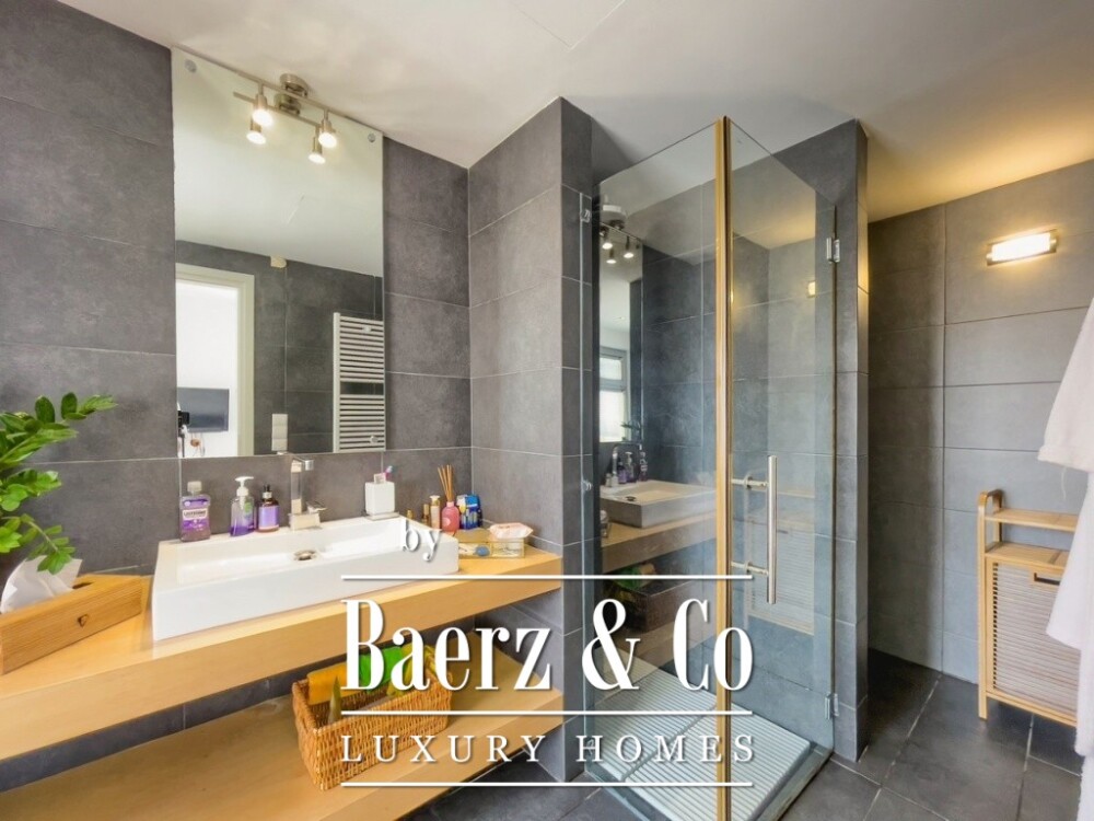 De doordachte verticale indeling komt tot uiting in het slim ontworpen souterrain met gastensuite, speelkamer en een eigen entree – een uitgebalanceerde mix van privacy en flexibiliteit. Op de bovenverdieping bieden drie slaapkamers, waaronder een master met kleedruimte en luxe en-suite badkamer, een rustig uitzicht op zee en tuin. Vloerverwarming, centrale koeling, een zonneboiler en een 5 kW fotovoltaïsch systeem zijn naadloos geïntegreerd, evenals een compleet domoticasysteem en beveiligingsfuncties als CCTV en alarm.
