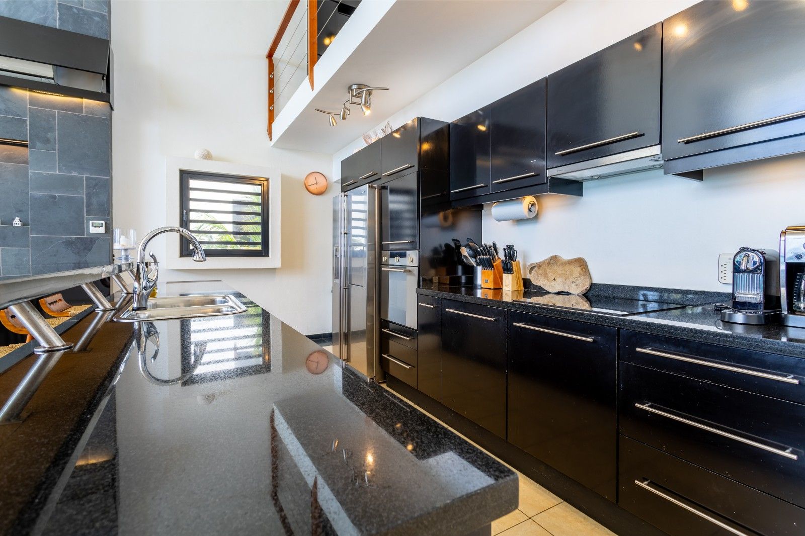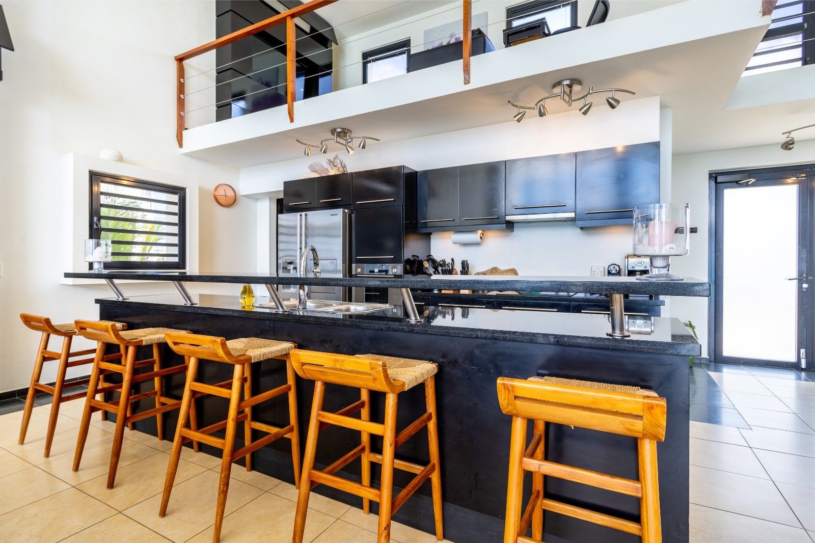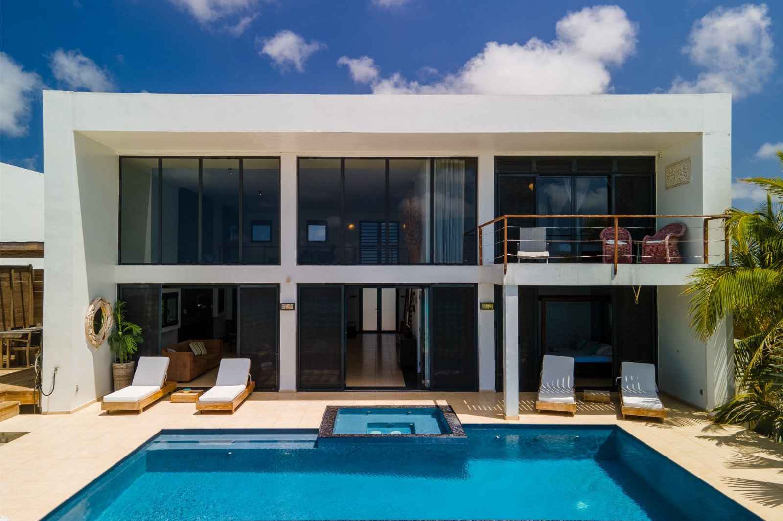 De grote schuifdeuren leiden direct naar het terras met een privézwembad en jacuzzi, waar je geniet van een panoramisch uitzicht over de Caribische Zee. De buitenruimte biedt meerdere zit- en loungeplekken: ideaal om gasten te ontvangen of simpelweg te ontspannen tijdens onvergetelijke zonsondergangen. Via de trap bereik je direct vanuit het terras het strand en de oceaan, waar je de kristalheldere wateren letterlijk aan je voeten hebt.