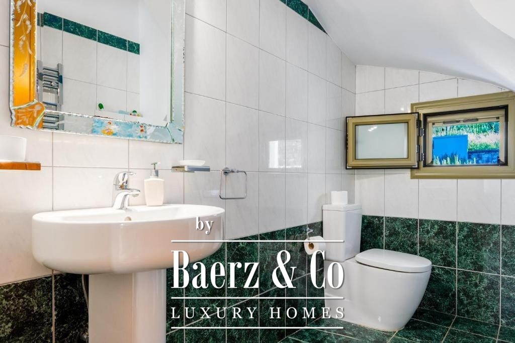 De villa is verdeeld over twee woonlagen en beslaat 156 m² op een royaal perceel van 2.200 m². Er zijn drie ruime slaapkamers, elk met een eigen badkamer, die zorgen voor privacy en toegang geven tot een beschut terras met een wijds uitzicht. De hoofdwoonkamer met open haard en grote schuifpuien verbindt het interieur op subtiele wijze met de fraai aangelegde buitenruimte. De keuken is volledig uitgerust en er is een extra gastentoilet aanwezig.